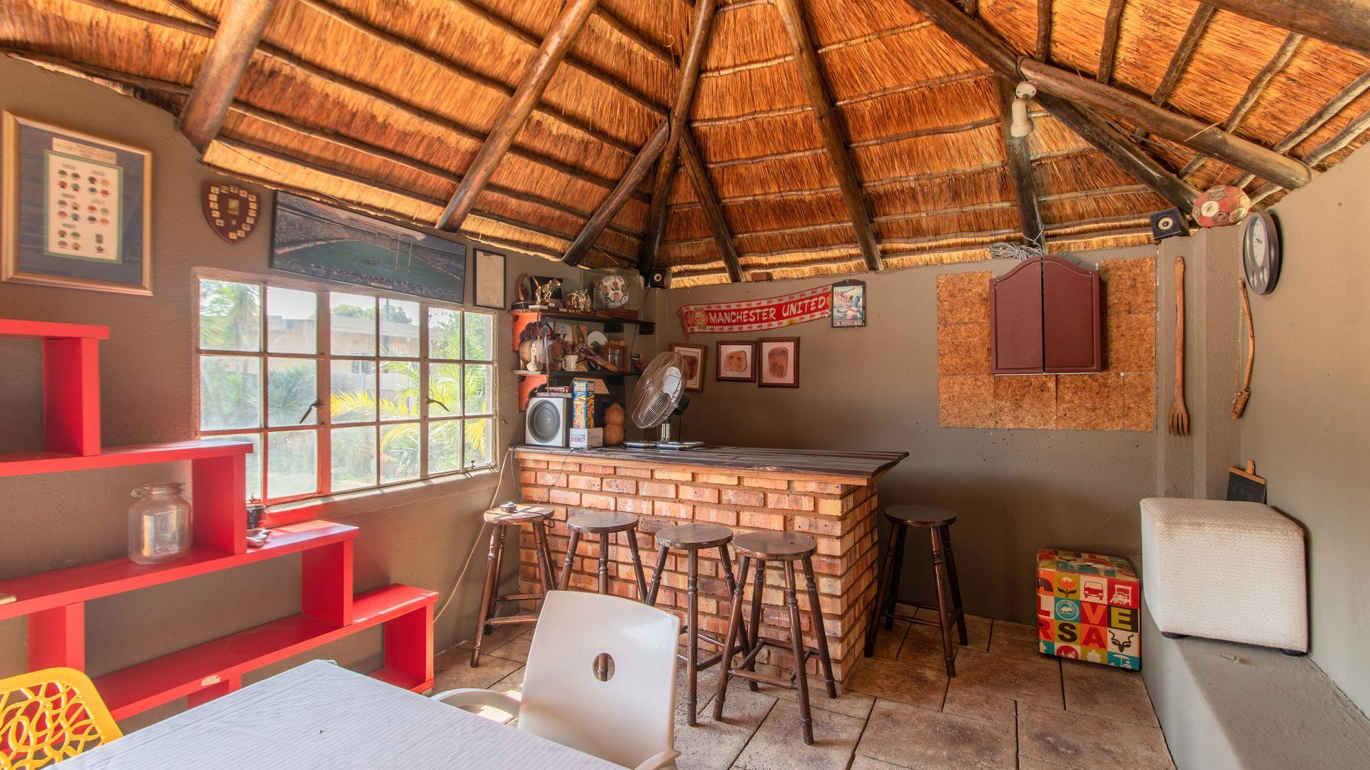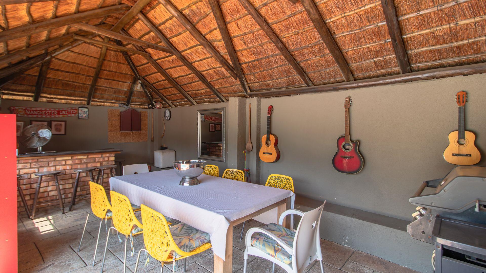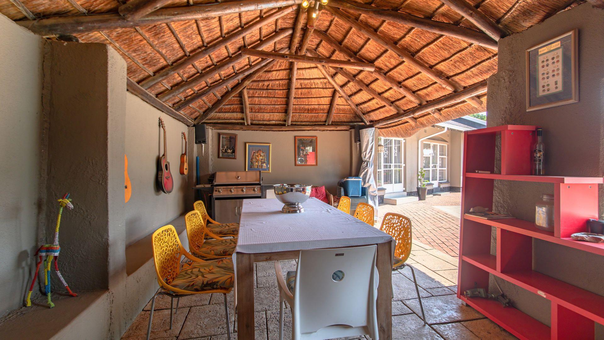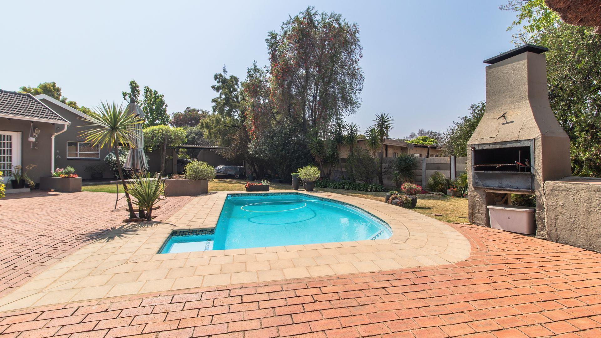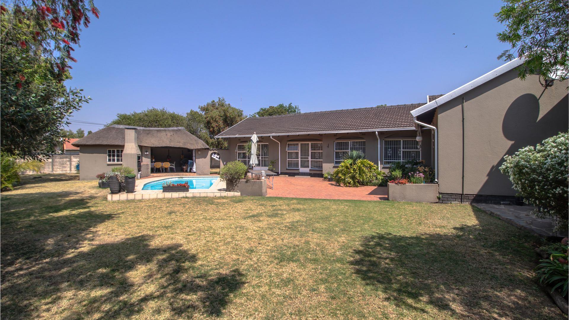 Step outside to explore the beautifully landscaped garden, an ideal setting for family gatherings and outdoor fun. The sparkling pool and thatched area with a built-in braai promise endless enjoyment during warm summer days. Completing this exceptional offering is a double garage and covered parking for at least three vehicles, ensuring ample space for all your transportation needs.