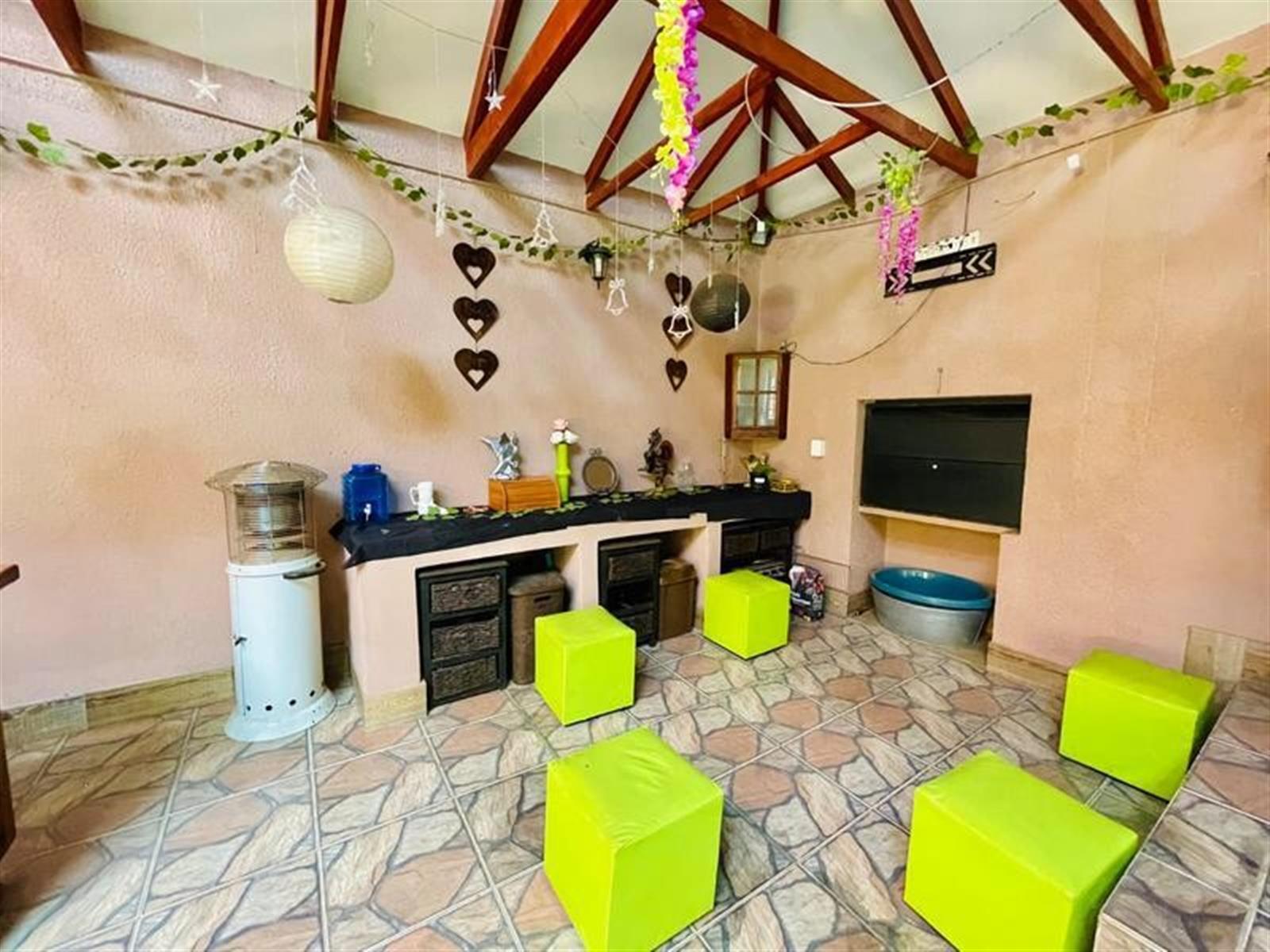 Huge enclosed entertainment area with Built in braai. Towel Storage. Bar area. Surround Sound speakers. TV bracket. Large Solar heated, low maintenance swimming pool. Lounge with built in seats. Kitchenette with ample counter space. Potential for swimming school or venue hire. +-108m2