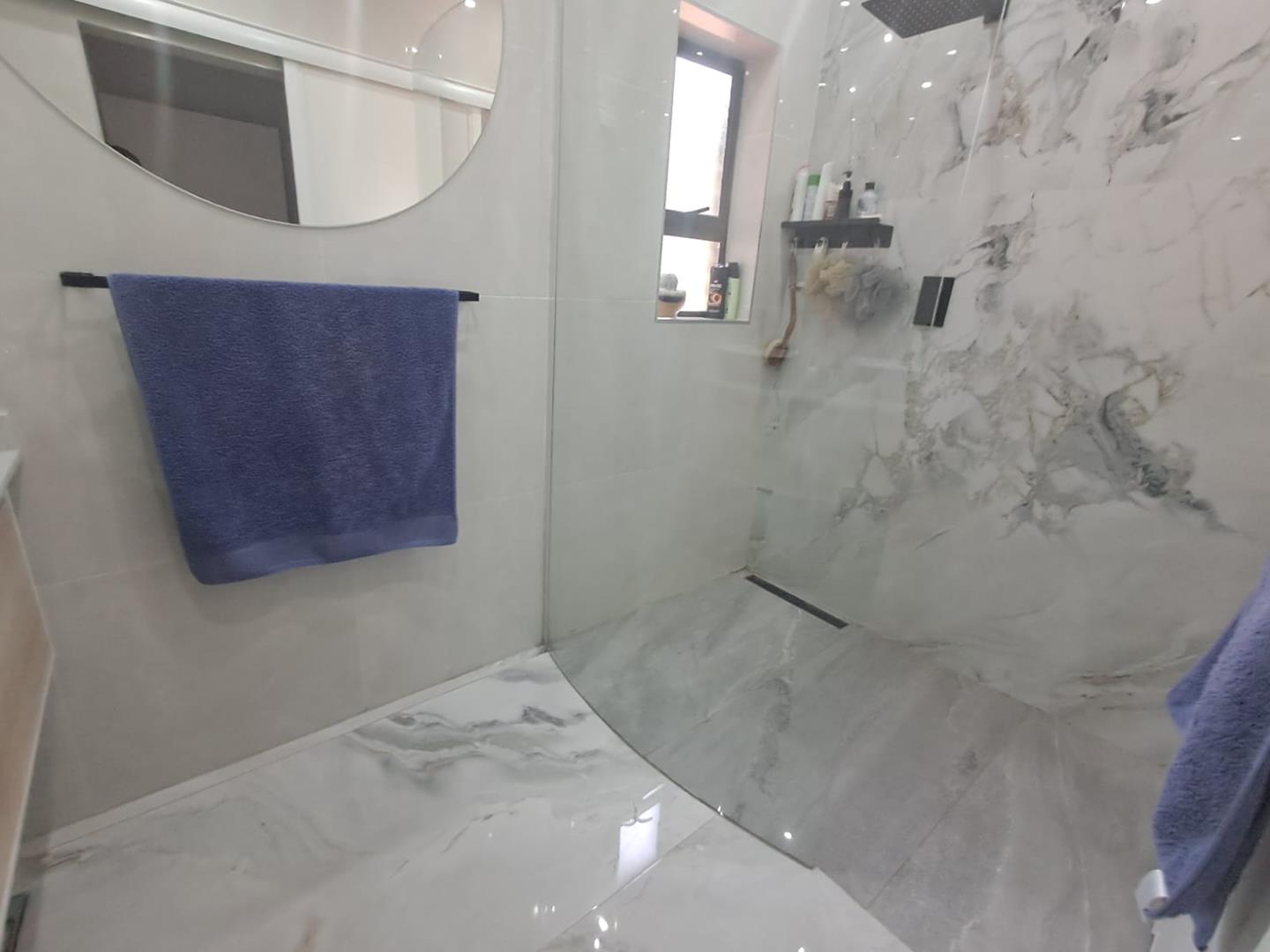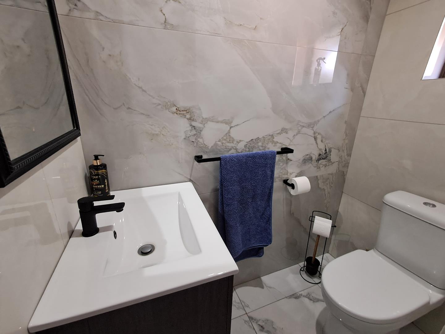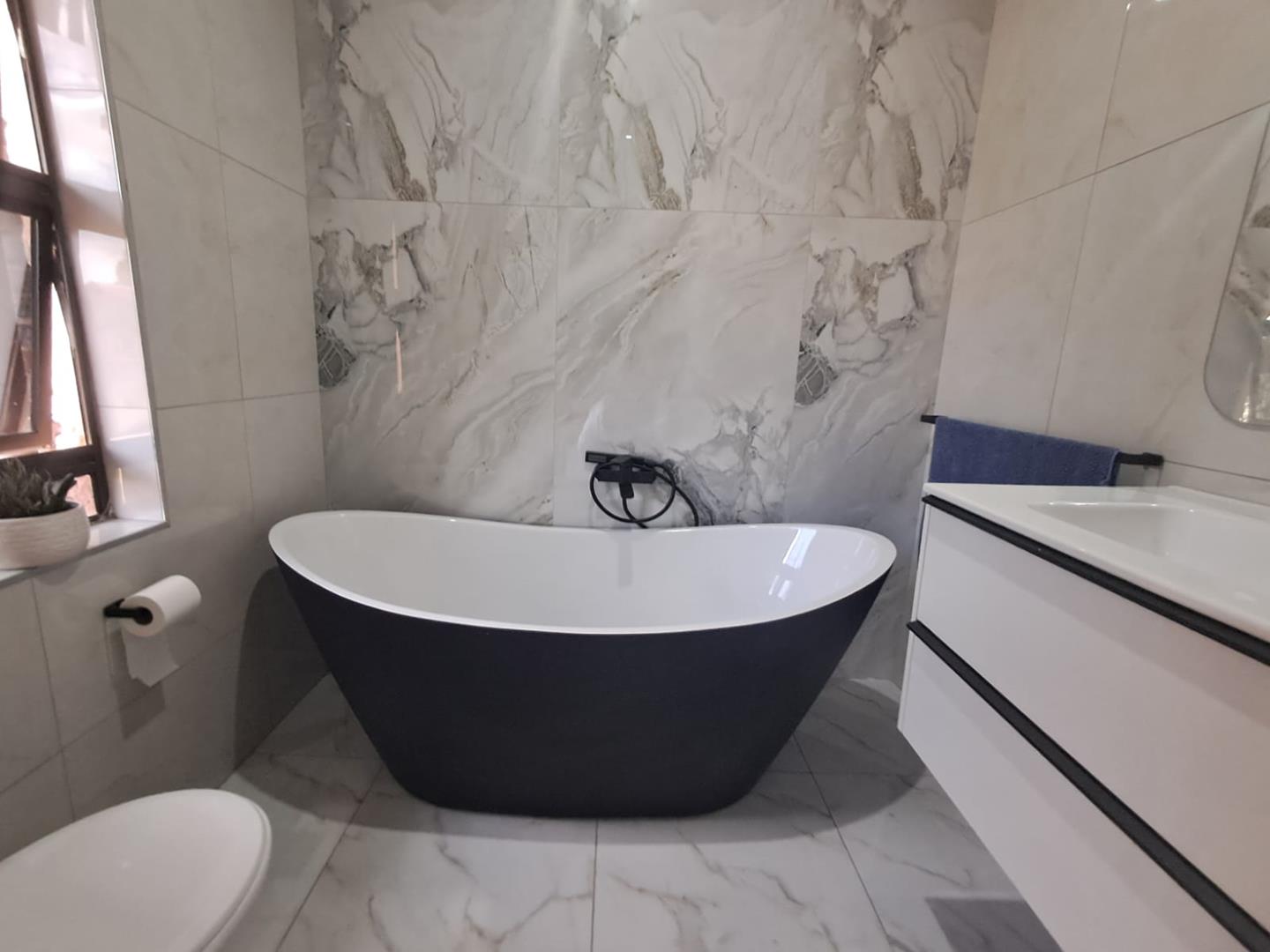 Upstairs, you’ll find three generous bedrooms, each with built-in cupboards and downlights. The main bedroom offers air conditioning and a stunning en-suite bathroom with a freestanding bath and designer finishes.