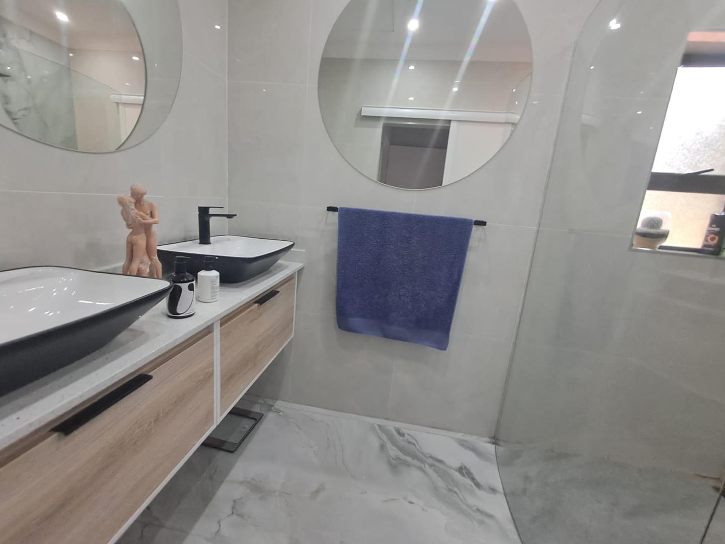 The modern family bathroom includes a double vanity, walk-in shower, and separate toilet.