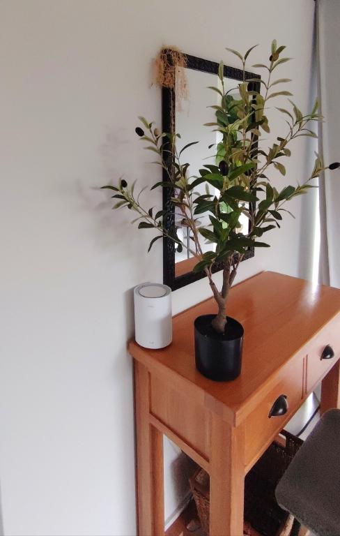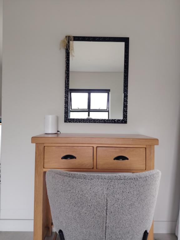 The fully equipped galley kitchen provides everything needed for cozy nights in — complete with an airfryer, built-in glass hob, bar fridge, sink, kettle, toaster, and all cutlery, crockery, pots and pans. Whether preparing a simple breakfast before exploring the Garden Route or sharing a candlelit dinner for two, the space feels both practical and welcoming.