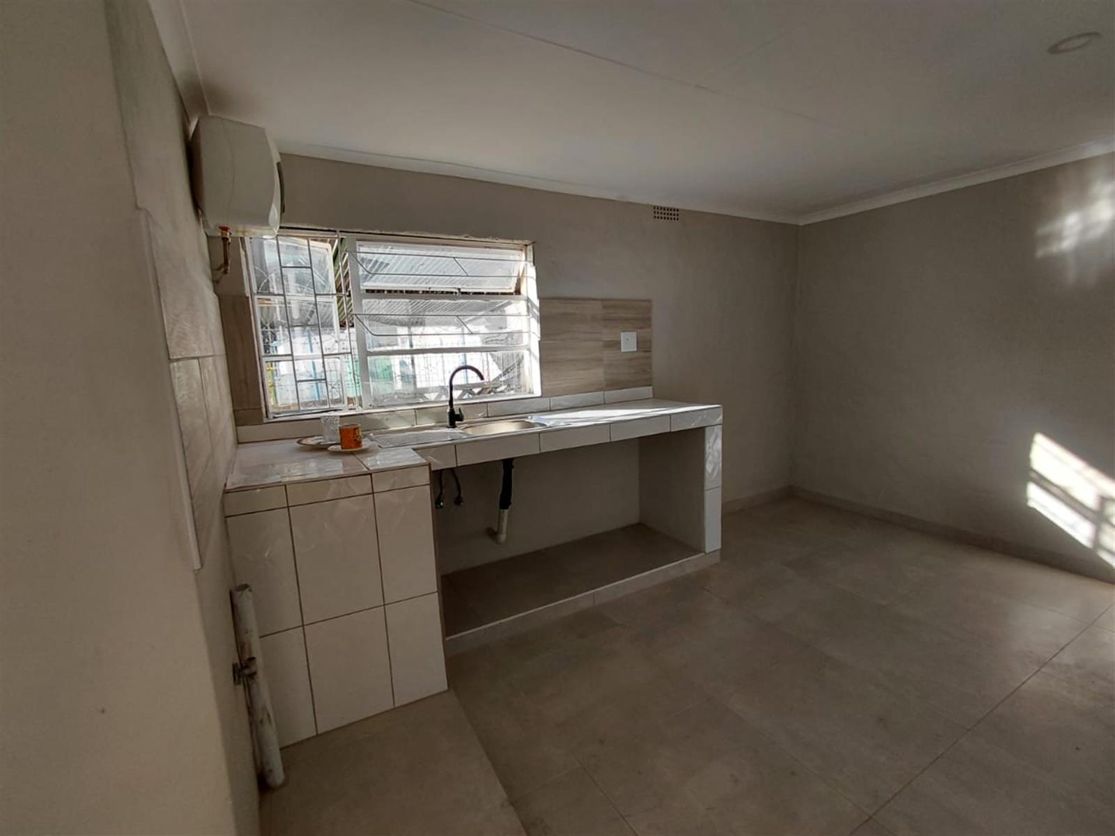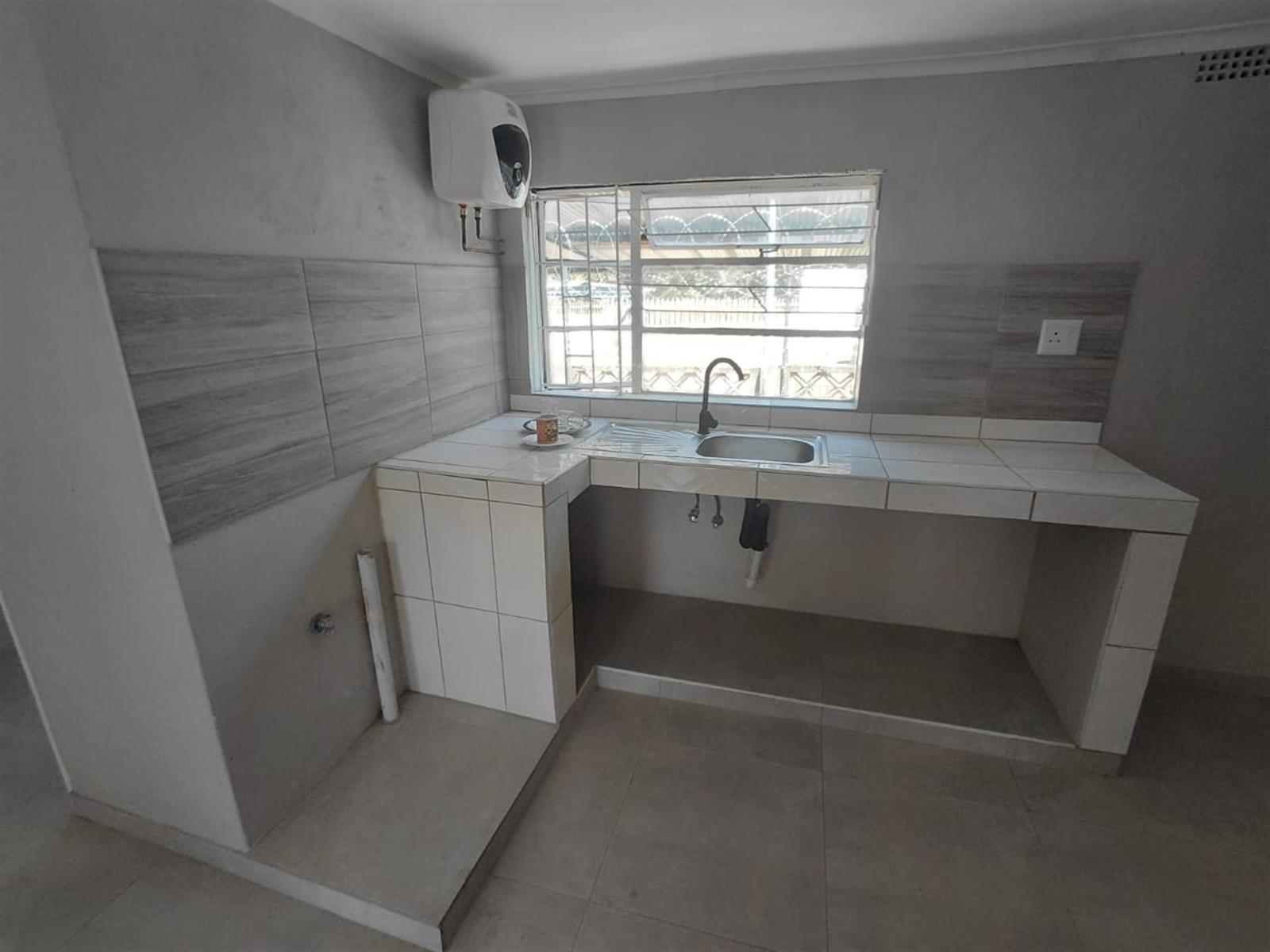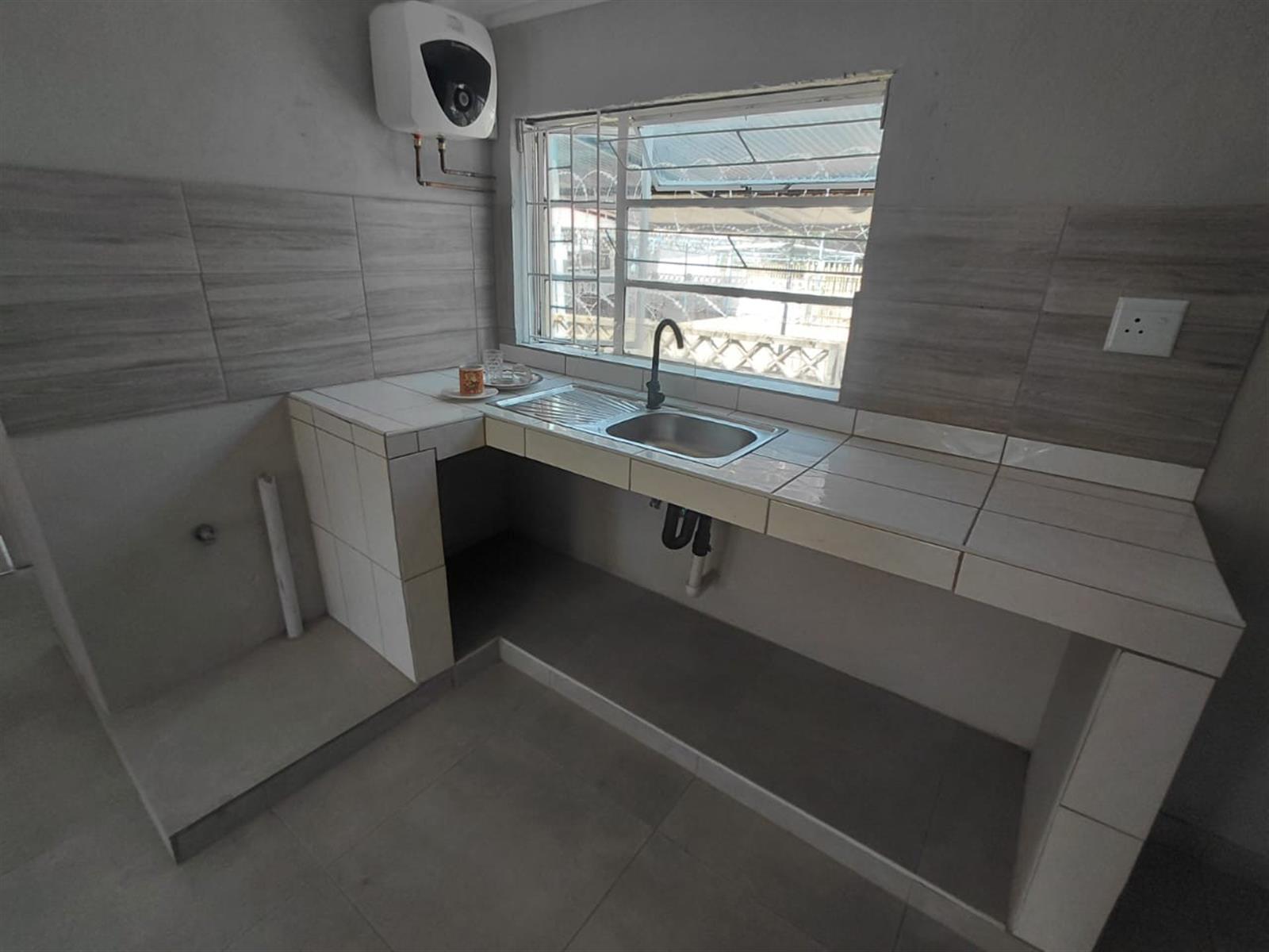 The kitchen features tiled countertops, a stainless-steel sink, ample workspace, and a convenient under-counter area for appliances. A large window allows for plenty of natural light, creating a bright and welcoming cooking space and light in the lounge as its conveniently open plan. A fitted geyser ensures reliable hot water throughout the unit.
