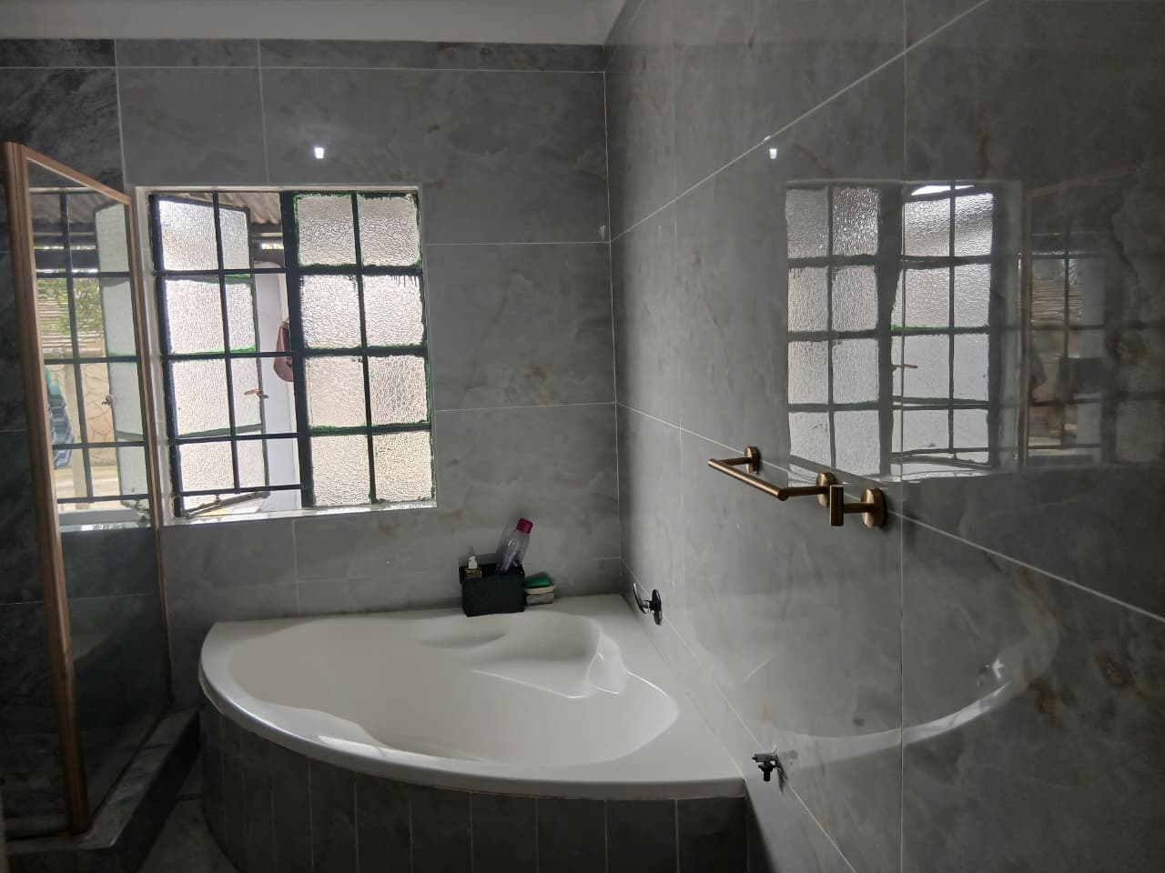Relaxation and entertainment are prioritized with a fully renovated, spacious bathroom equipped with a bath, shower, and basin. The property further enhances its appeal with an enclosed entertainment area that features a jacuzzi, braai area, and an inviting space to unwind and enjoy the outdoors.