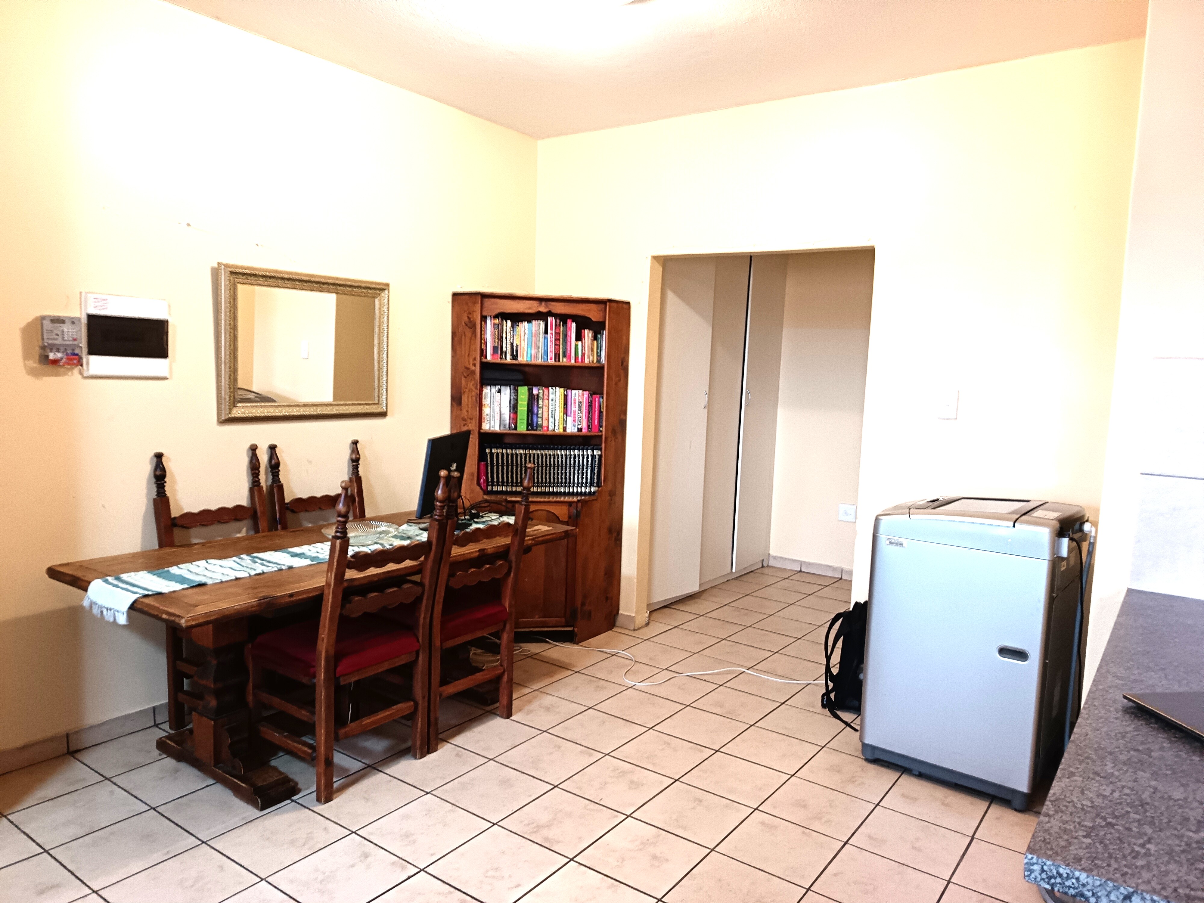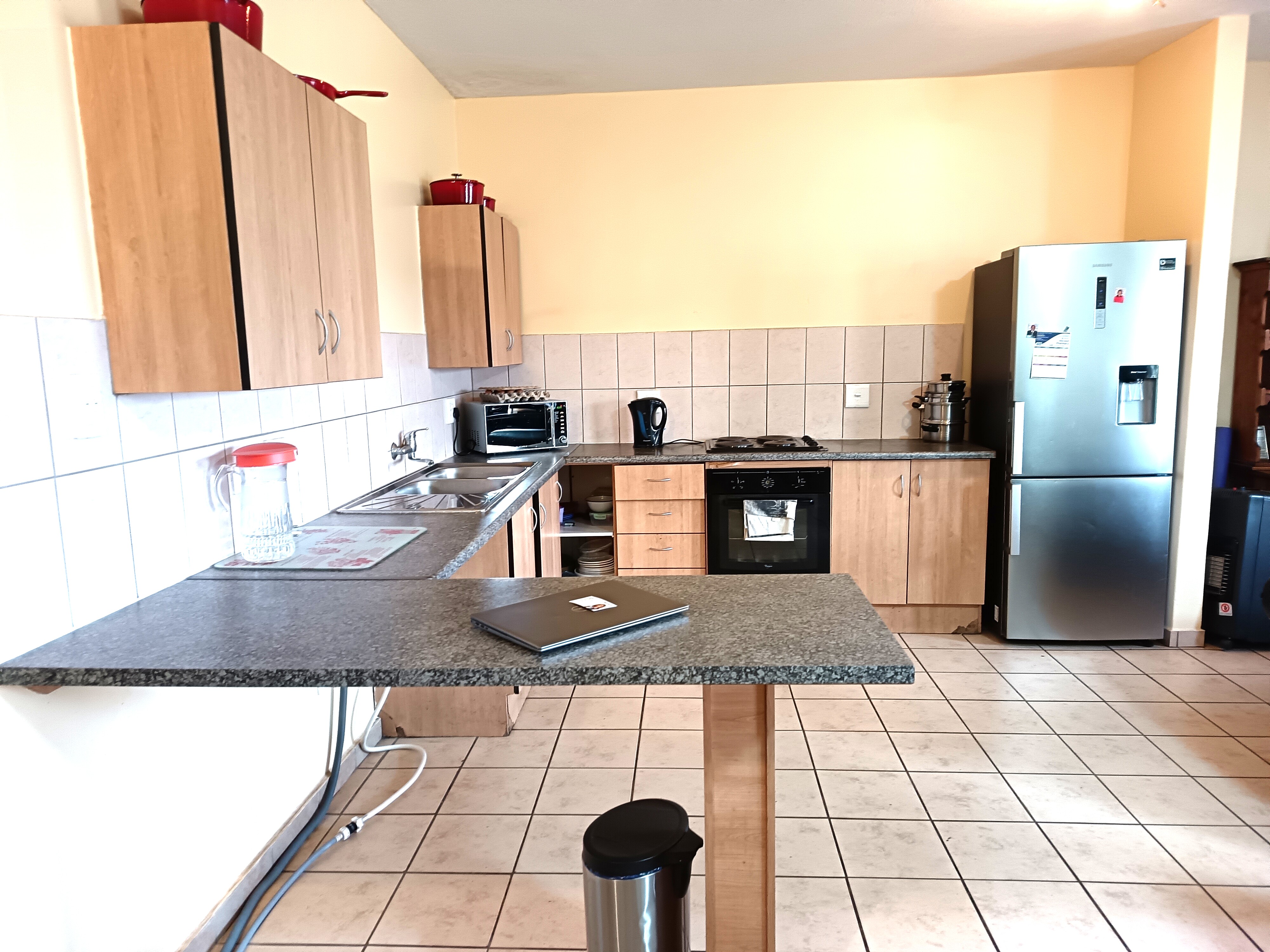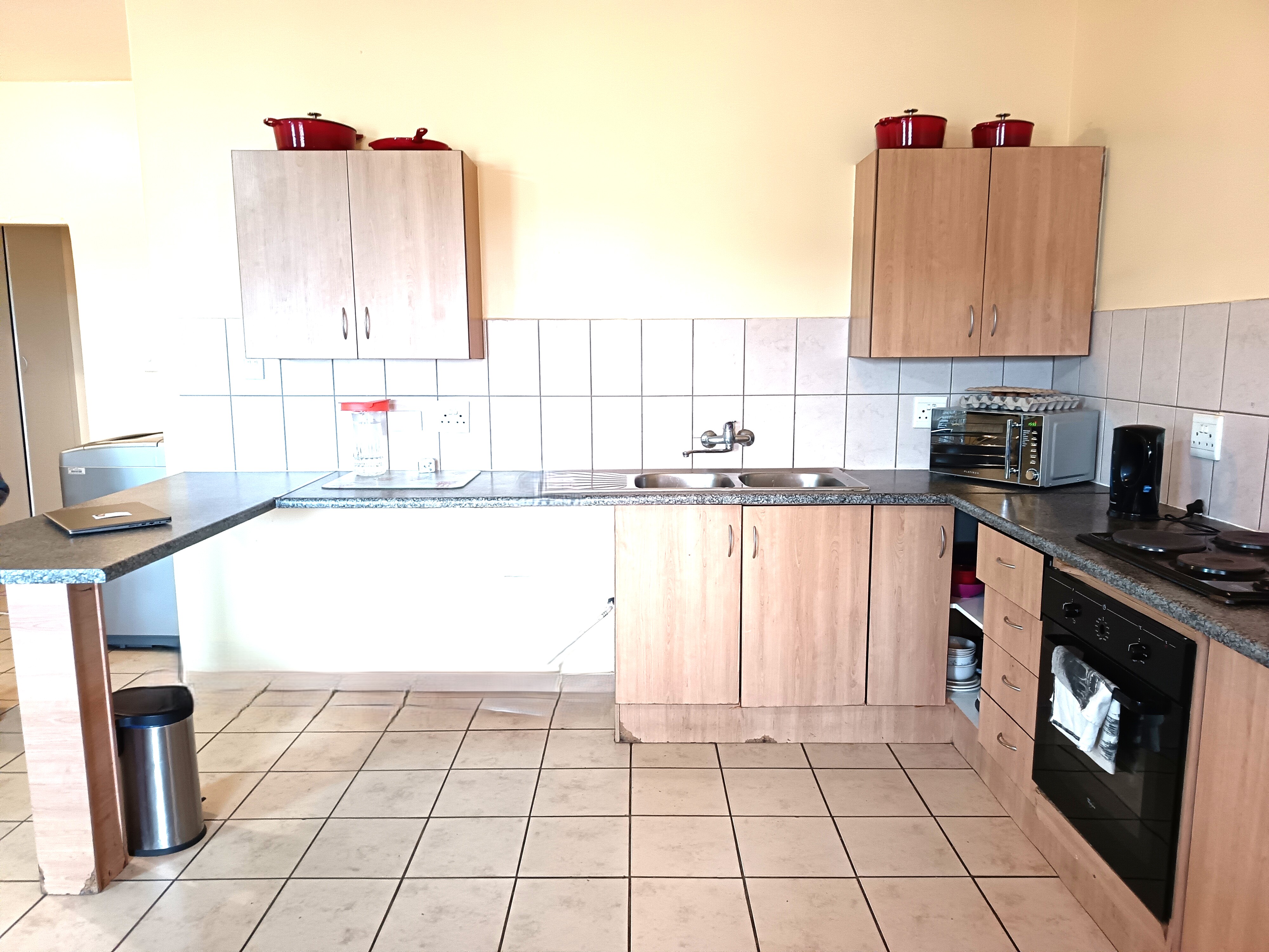 The open-plan living area seamlessly connects the lounge and dining room to a modern kitchen, fitted with oak-finished melamine cupboards, a breakfast bar, electric hob, undercounter oven, and plumbing for a washing machine. There's also room for your fridge. The living area opens onto a private balcony that overlooks the complex and children’s play area — perfect for relaxing.