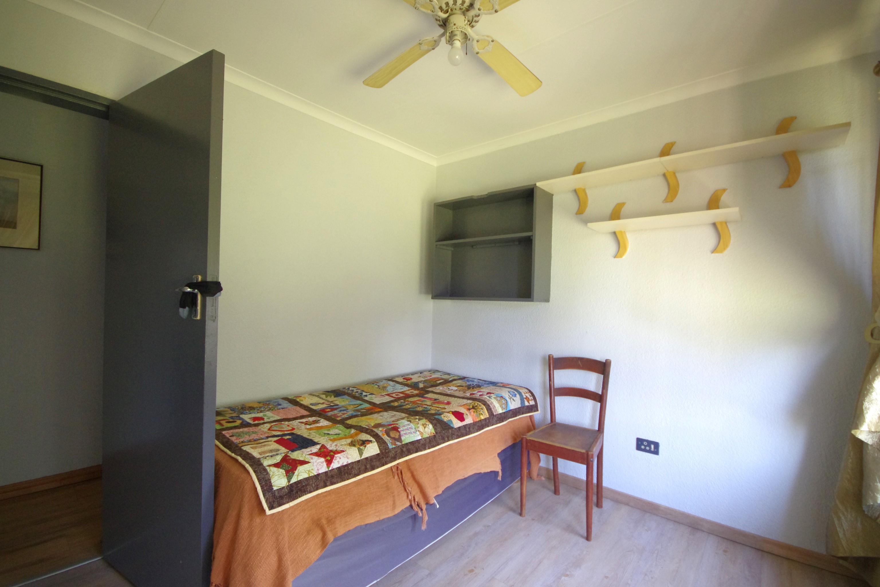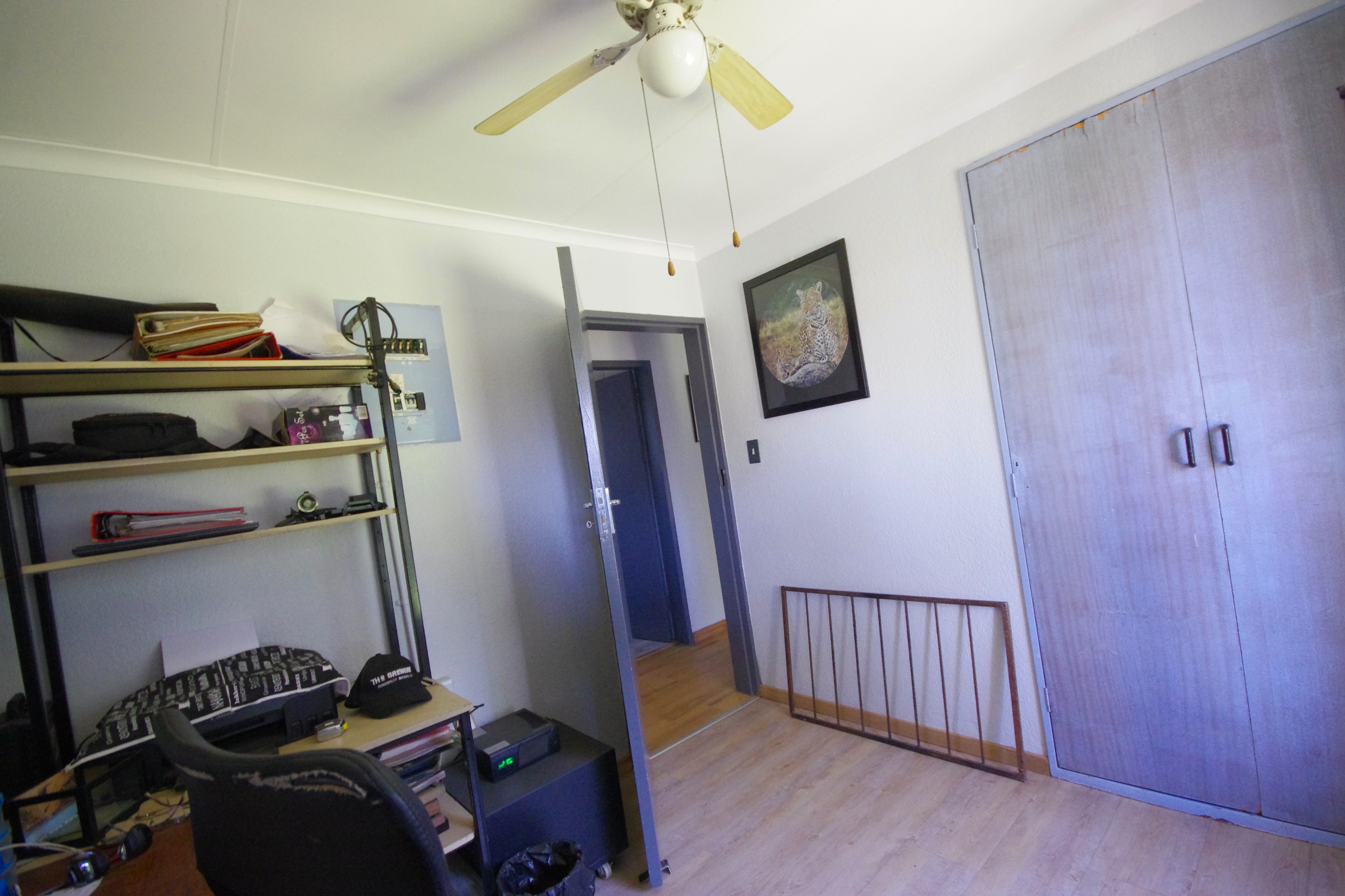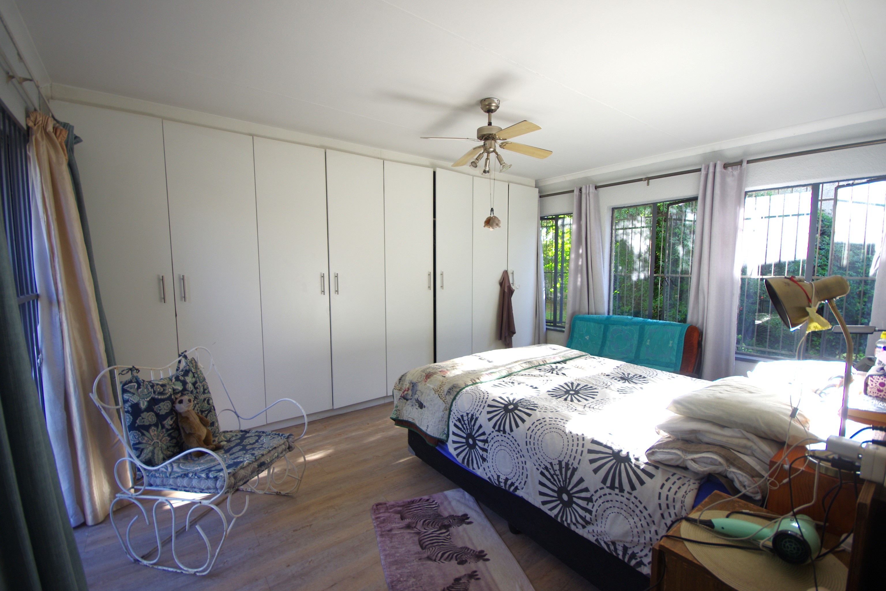 Step into a bright, open-plan lounge and dining area with laminated flooring, where natural light creates a warm, inviting atmosphere—ideal for family gatherings or cozy evenings. The functional kitchen, featuring cherry wood cupboards and a tiled finish, caters to busy family life. Five well-sized bedrooms provide flexibility for a growing family, home office, or guest rooms. The main bedroom, with built-in cupboards and direct backyard access, accommodates a king bed, while others offer a mix of laminated, carpeted, or cement flooring, with roof fans for comfort. One bedroom includes an en suite storeroom, easily convertible into a bathroom or walk-in closet.