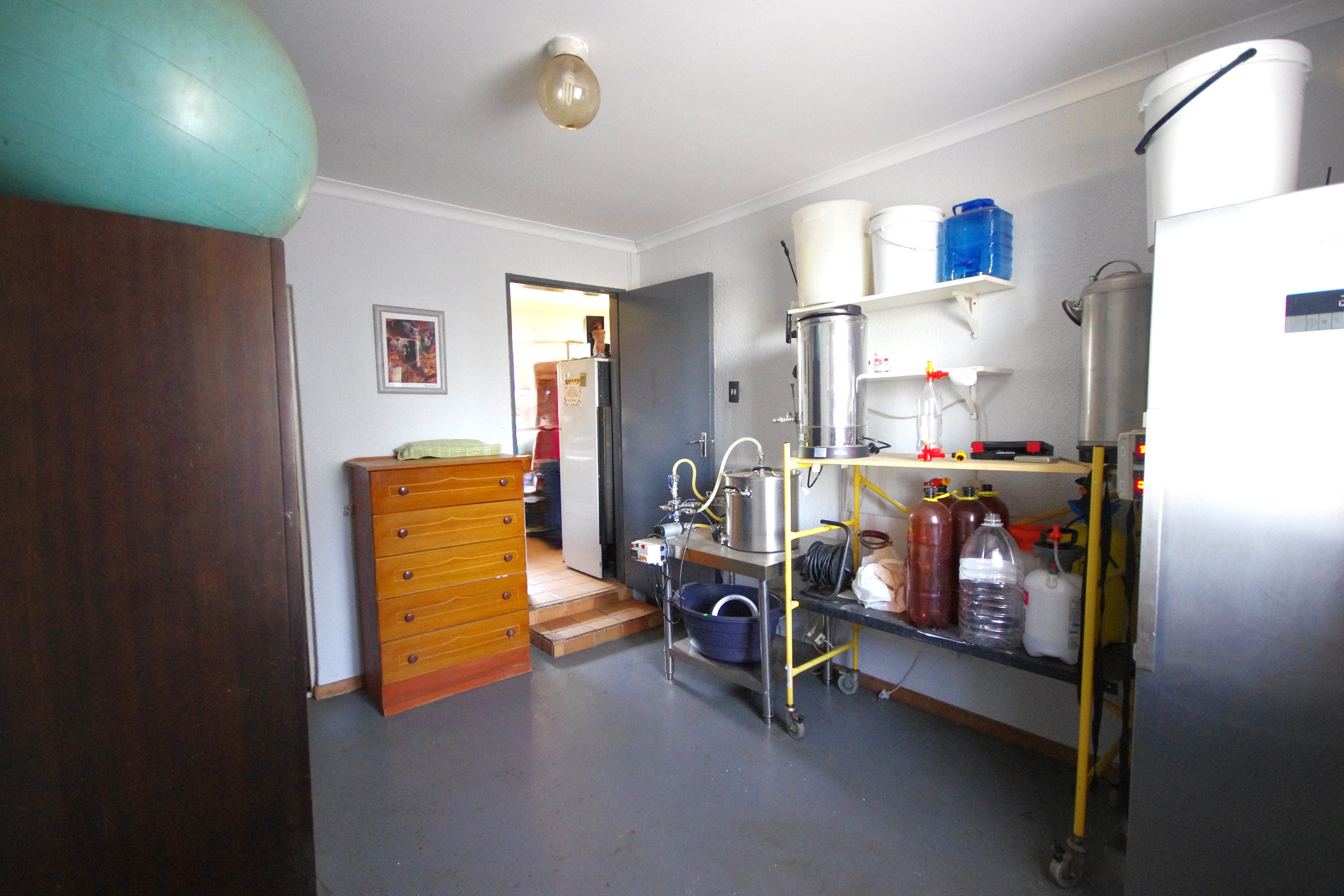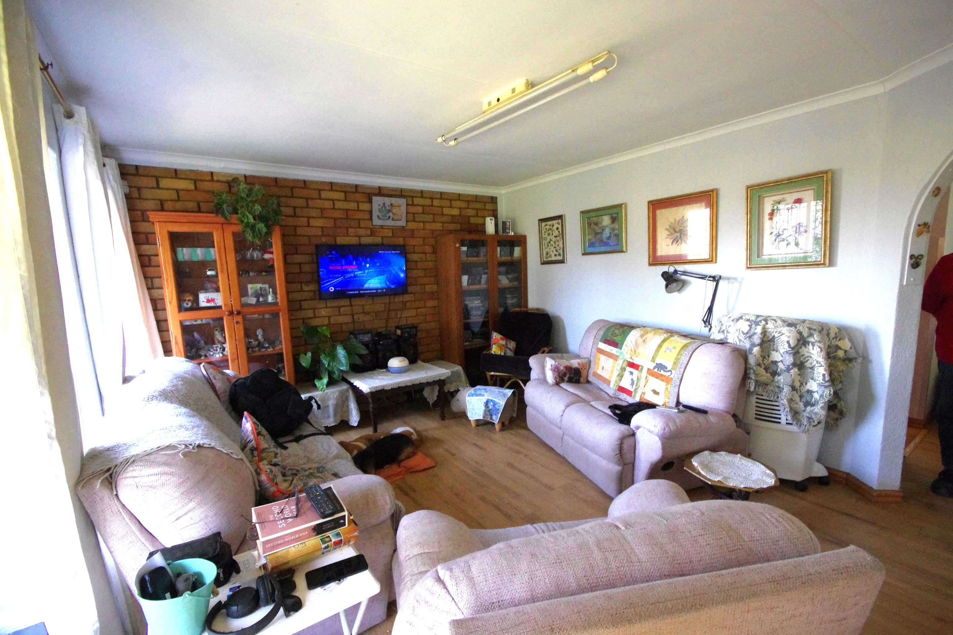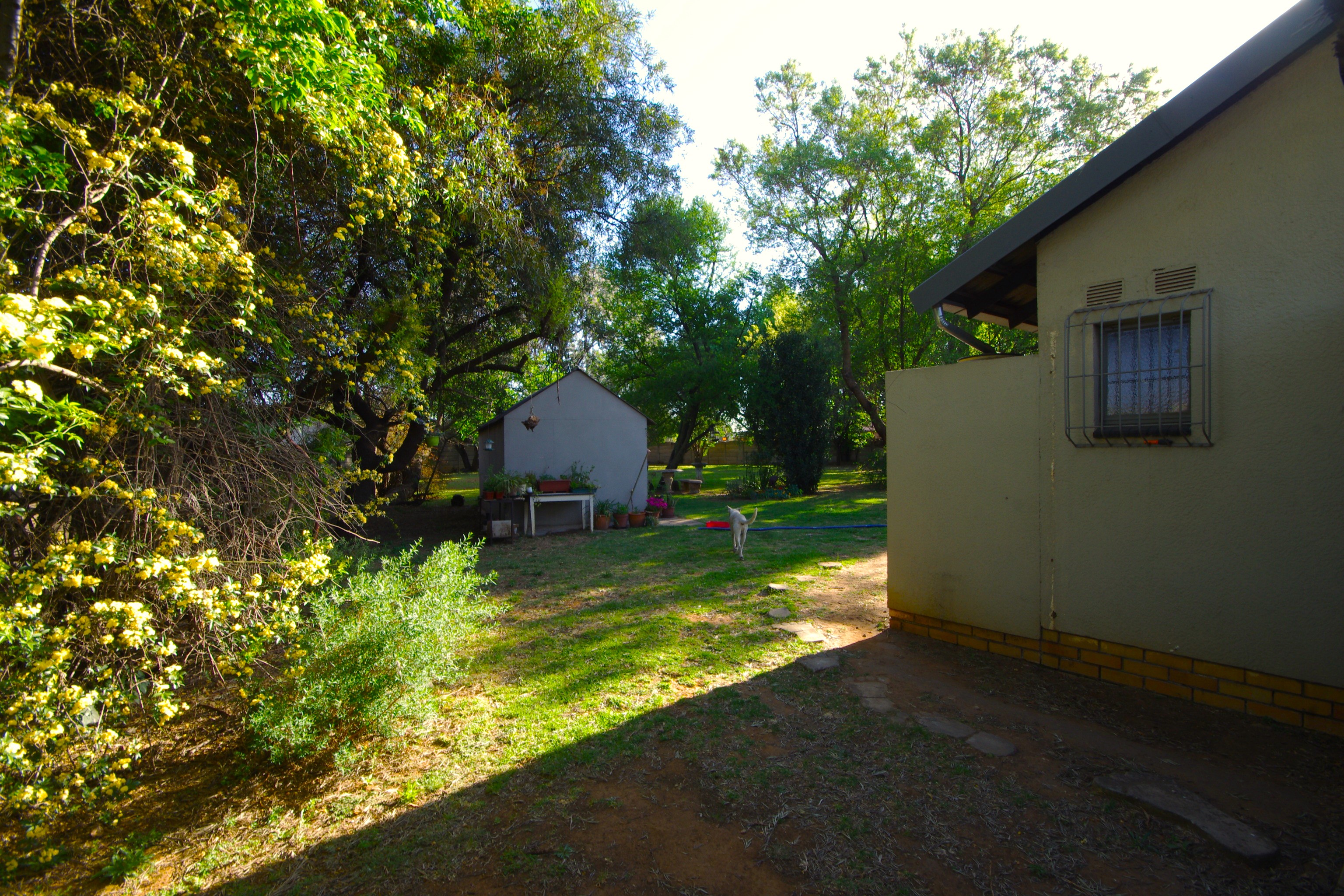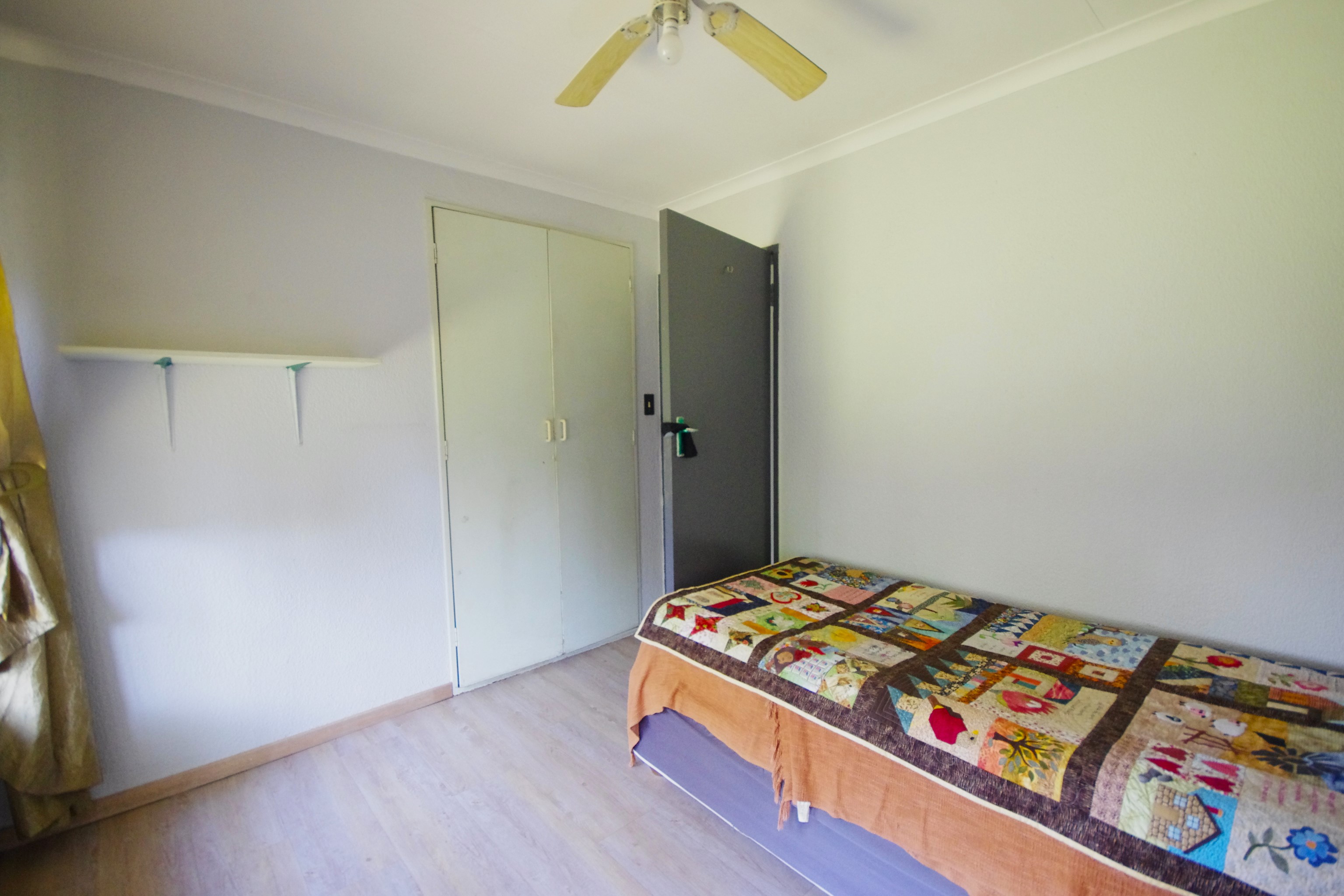 Step into a bright, open-plan lounge and dining area with laminated flooring, where natural light creates a warm, inviting atmosphere—ideal for family gatherings or cozy evenings. The functional kitchen, featuring cherry wood cupboards and a tiled finish, caters to busy family life. Five well-sized bedrooms provide flexibility for a growing family, home office, or guest rooms. The main bedroom, with built-in cupboards and direct backyard access, accommodates a king bed, while others offer a mix of laminated, carpeted, or cement flooring, with roof fans for comfort. One bedroom includes an en suite storeroom, easily convertible into a bathroom or walk-in closet.