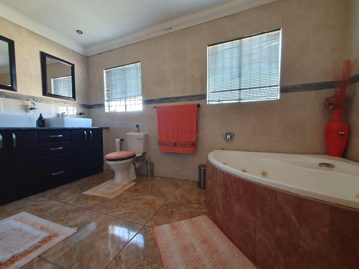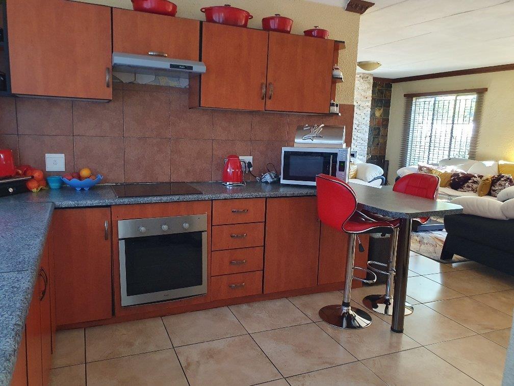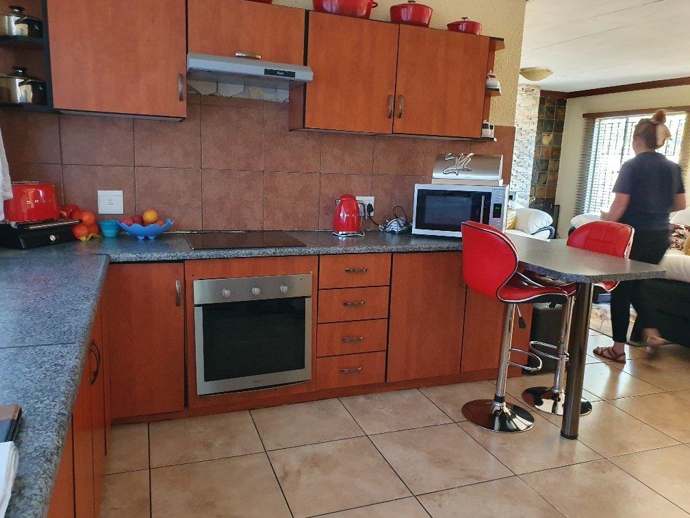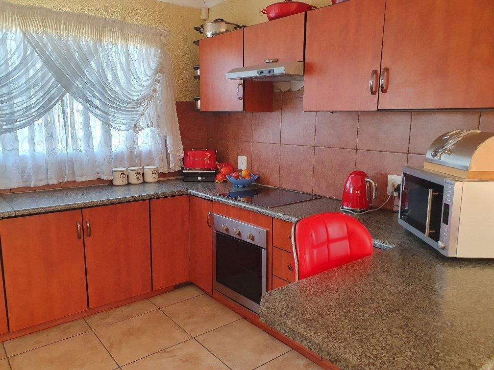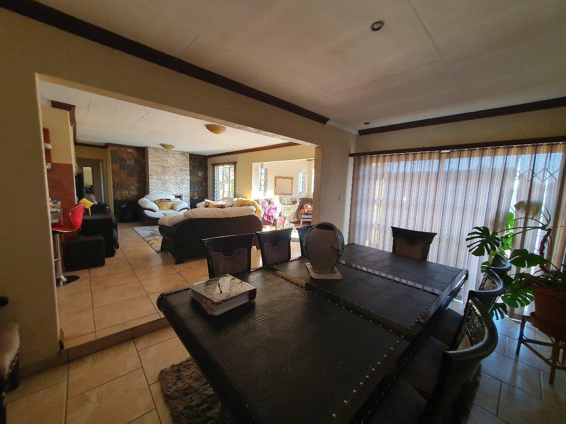 Large modern family home with four bedrooms, two bathrooms, one en-suite to the main bedroom. The property boasts a large lounge with fireplace that is open-plan to the dining room and kitchen which are also spacious. The kitchen is fitted with ample built-in units in a cherrywood finish. The living areas are all tiled with sensible tiles and the bedrooms are carpeted. The house has a gorgeous street appeal with palisade fencing in front and precast walls at the back and side. There is a double garage with brick paved driveway. All of this on a 973 square meter stand. This is well worth viewing.