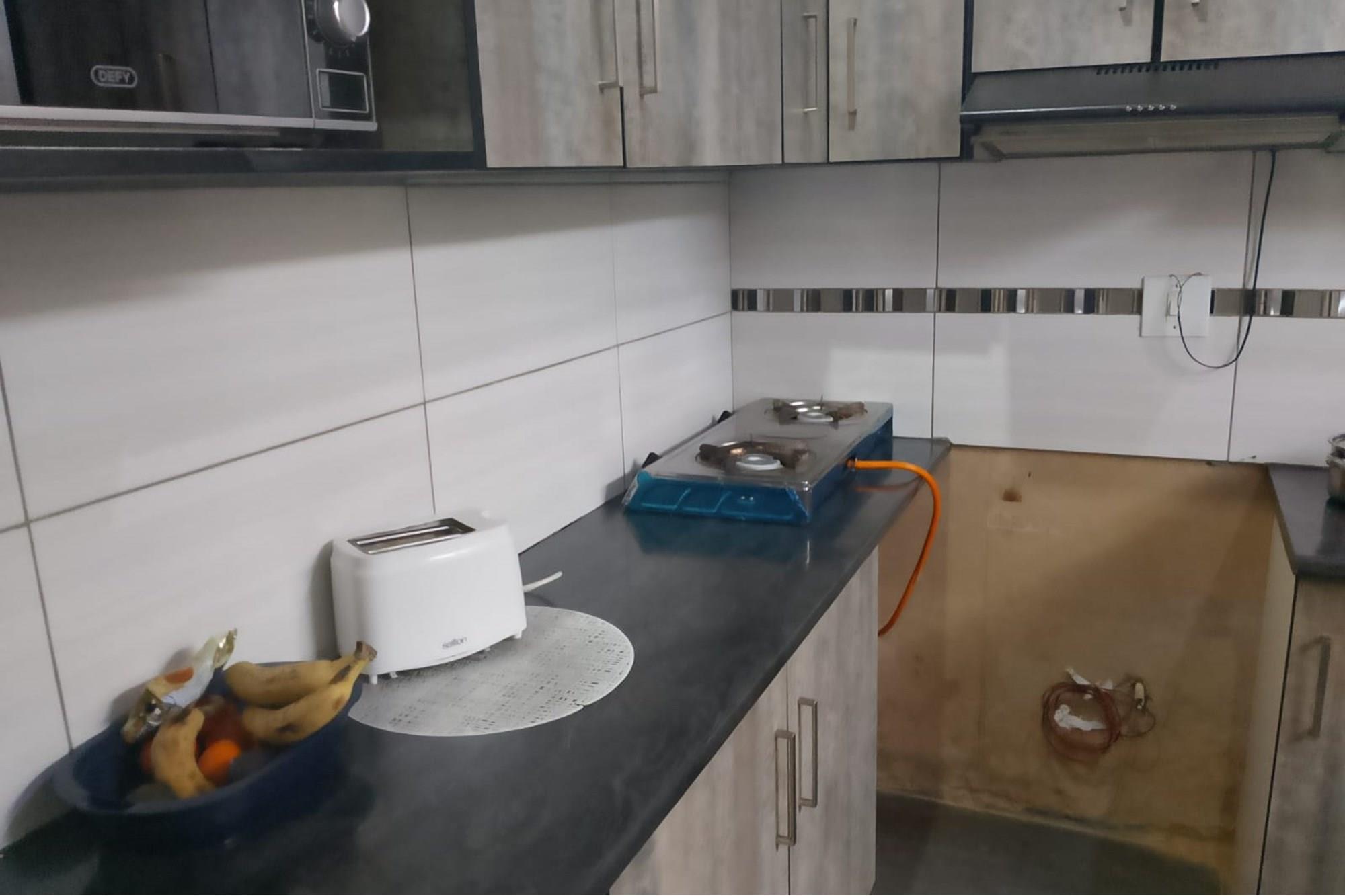 A beautiful 2 bedroom house with a kitchen open plan living room and dining room and a bathroom. the kitchen is fitted with wall units and has some mordern finishes. on the outside the house has 4 extra rooms that can be rented out or used as extra bedrooms if you have a large family. the yard is paved with bricks and has wall right round the yard.