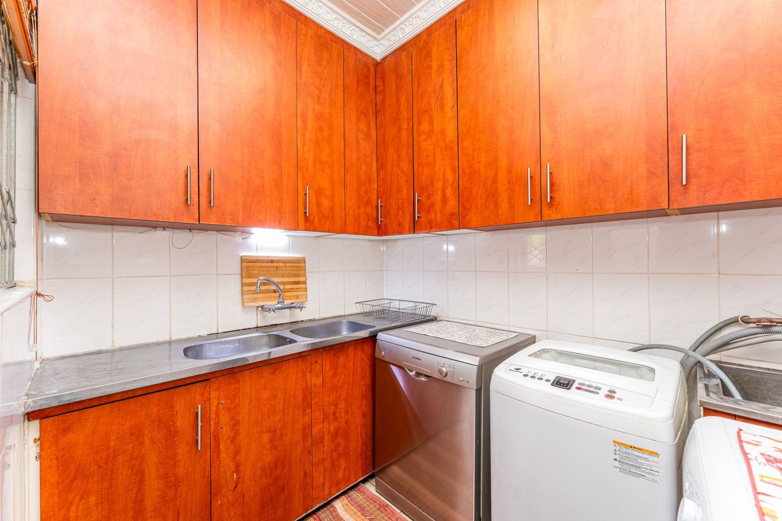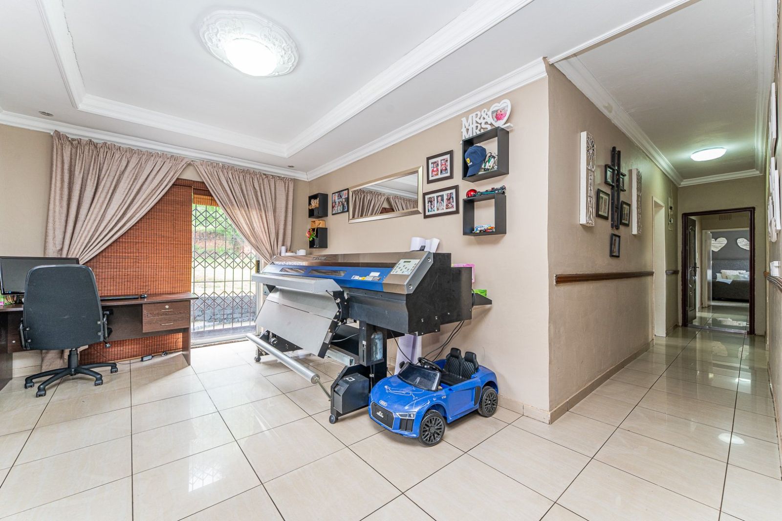 Inside, the home features three sunny, well-proportioned bedrooms, all filled with natural light. The main bedroom includes its own bathroom, while a second neat bathroom services the rest of the home. Three spacious reception areas provide versatile living options—perfect for families who need room to spread out. One of these spaces can easily be used as a dedicated study or home office. The kitchen is well laid out and includes a separate scullery and laundry, keeping the main space organised and functional.