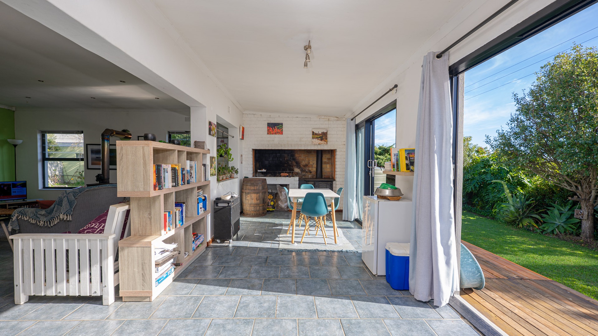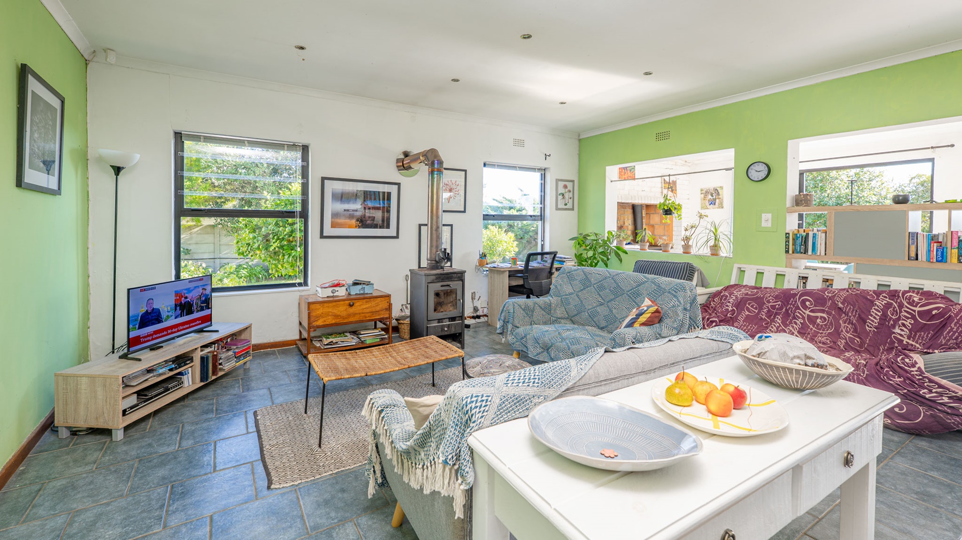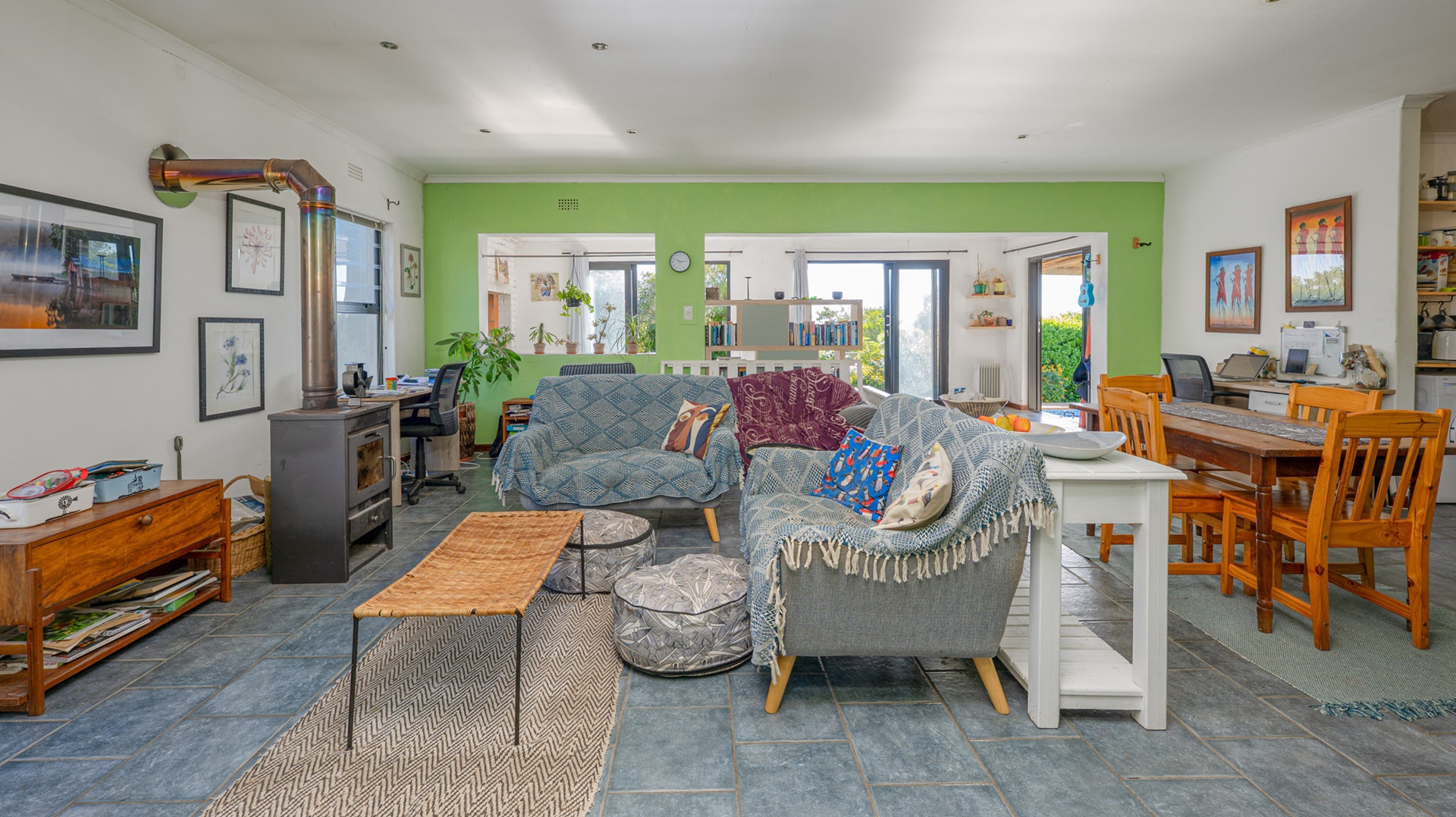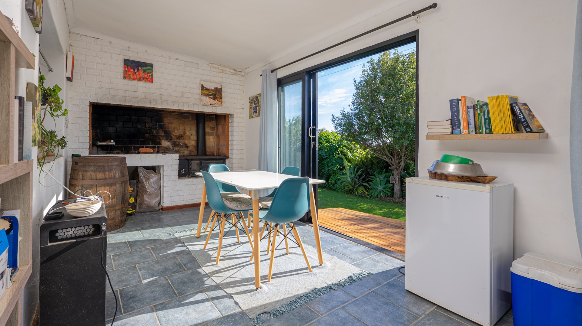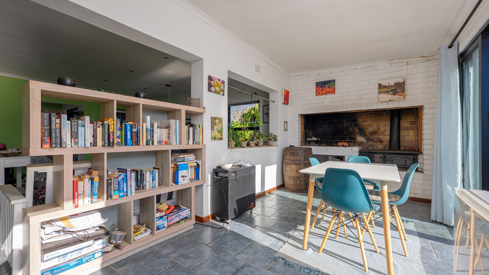 Step into a light-filled open-plan lounge, kitchen and dining area, ideal for moments of quiet relaxation and socialising. A central fireplace offers a comforting focal point, promising cozy winter nights. For those who love to entertain, the integrated indoor braai with Dover stove is a standout feature, perfect for creating memorable moments with friends and family.