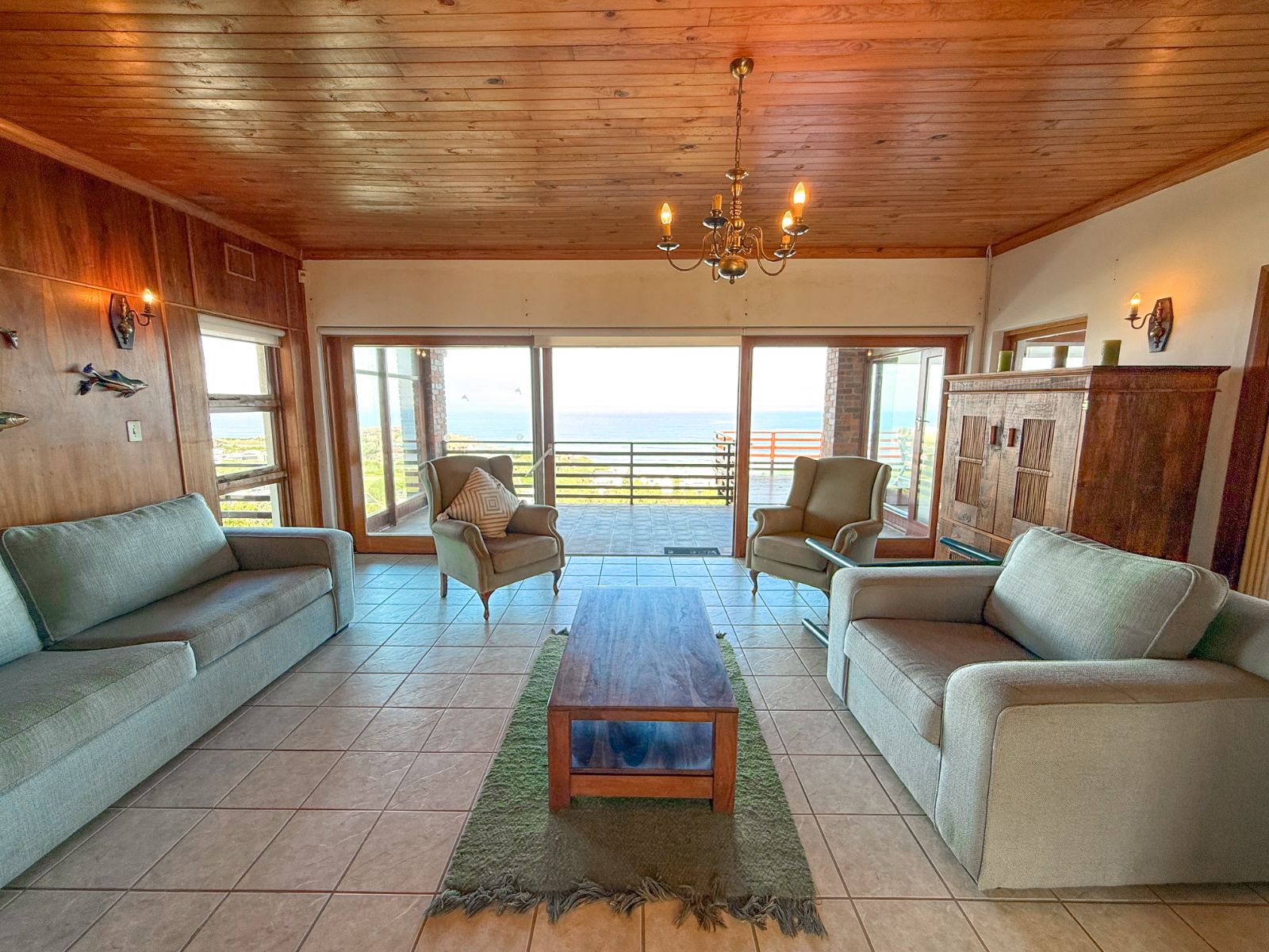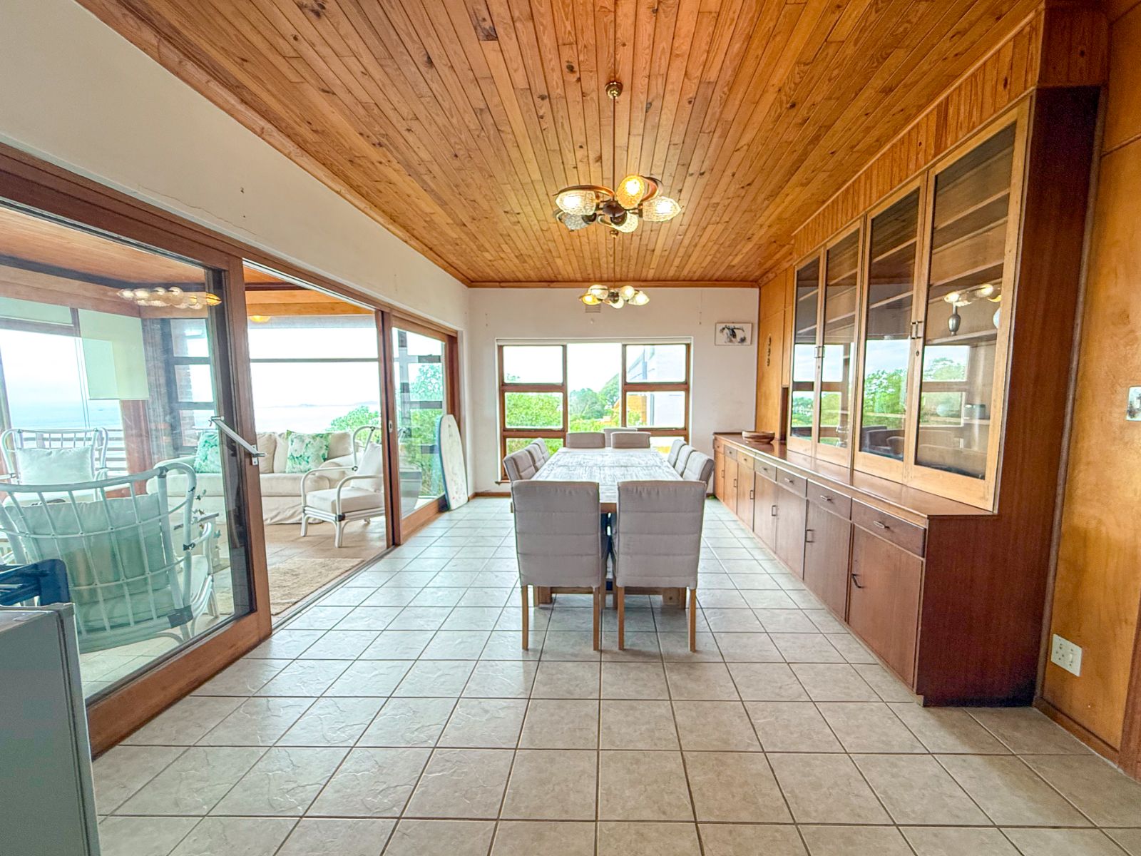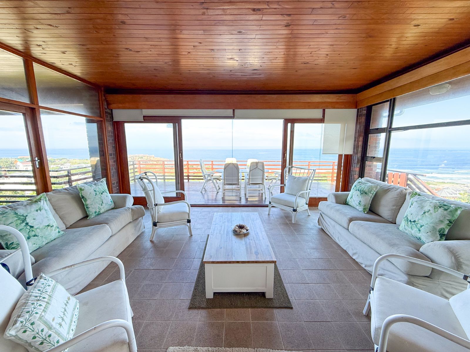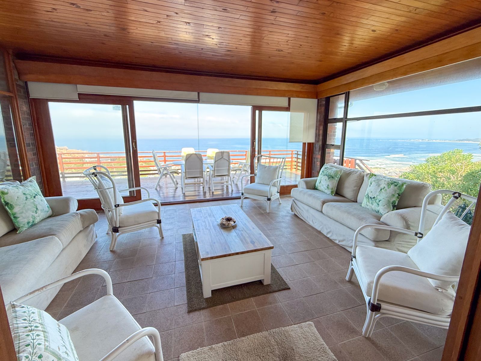 The living area is open-plan with a lounge and dining room that flows into a sunny sunroom looking out over the sea. It’s a lovely space to relax or spend time with friends and family. It flows out onto a big wooden deck where you can enjoy the fresh air and incredible panoramic ocean views.
