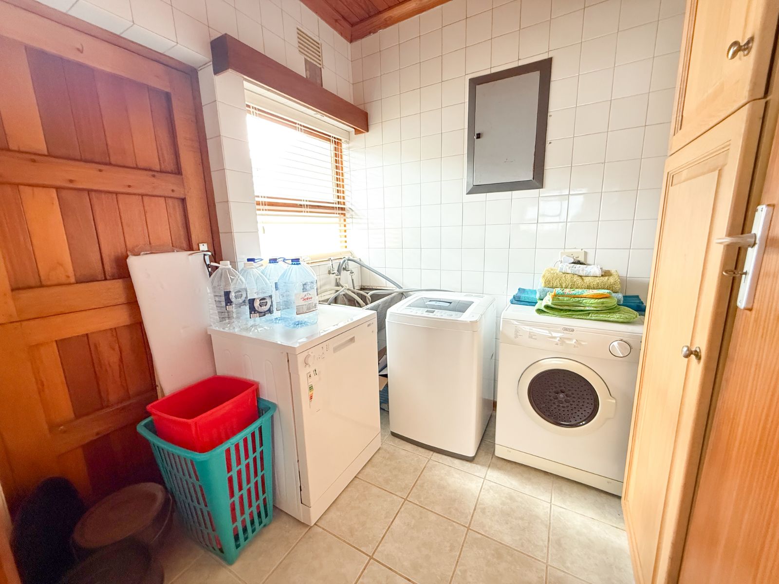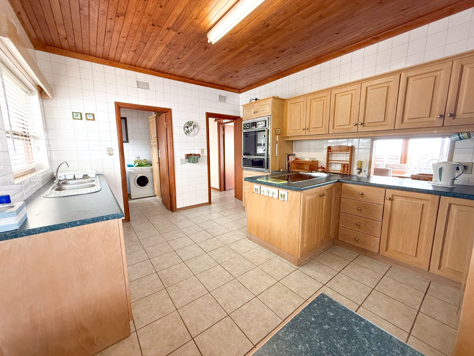 The kitchen is neat and functional, and there’s a separate laundry area.