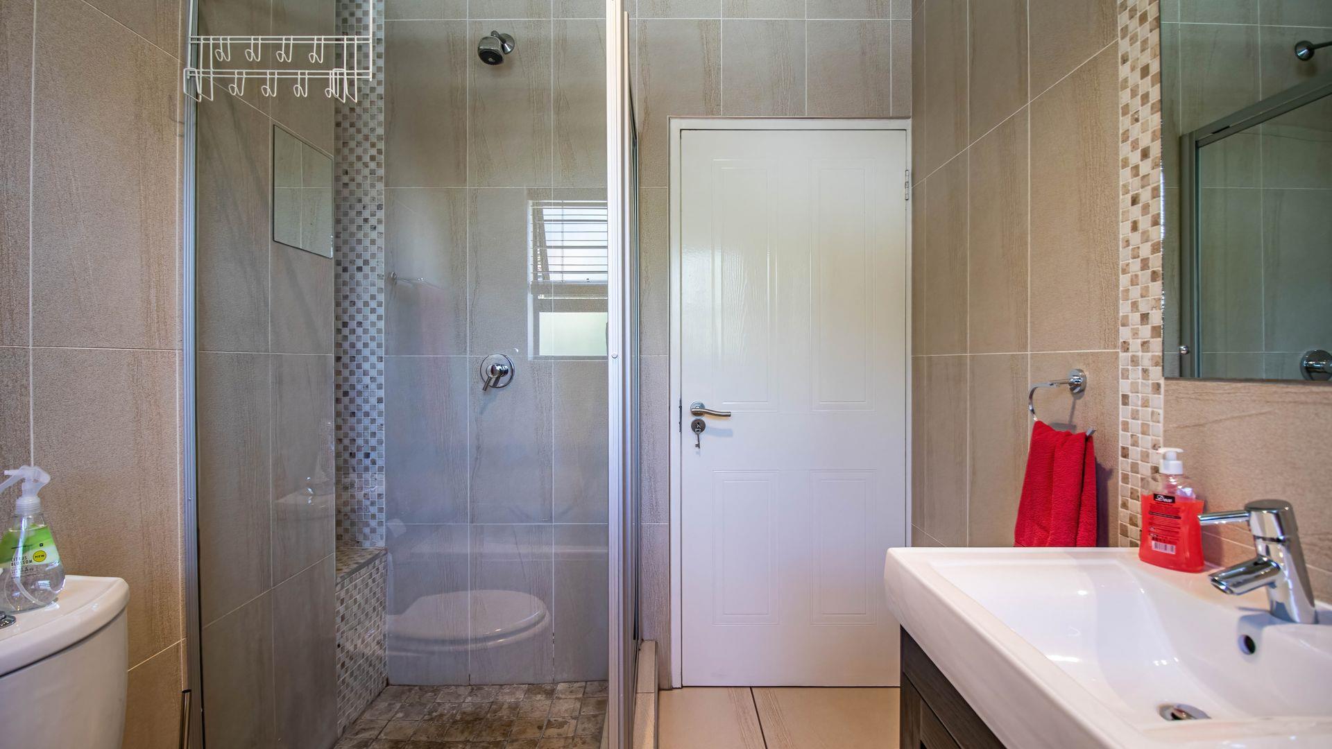 For culinary enthusiasts, the open-plan kitchen is a true delight. It boasts melamine and granite finishes, a breakfast nook, and a top-of-the-line Bosch freestanding gas stove. A concealed scullery/laundry area adds to the convenience of this well-designed kitchen. The ground floor also features a guest suite with an en-suite bathroom and an additional guest loo.