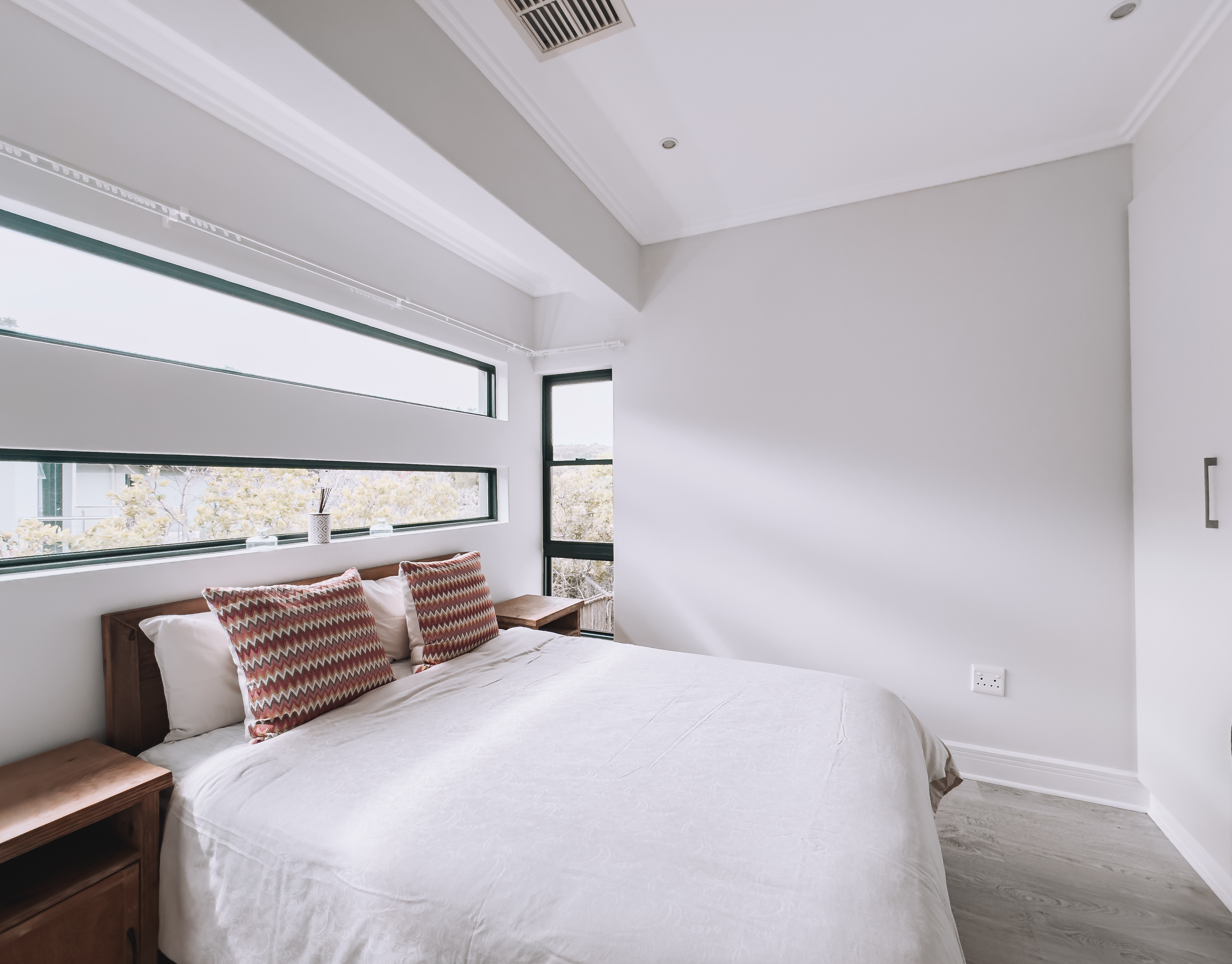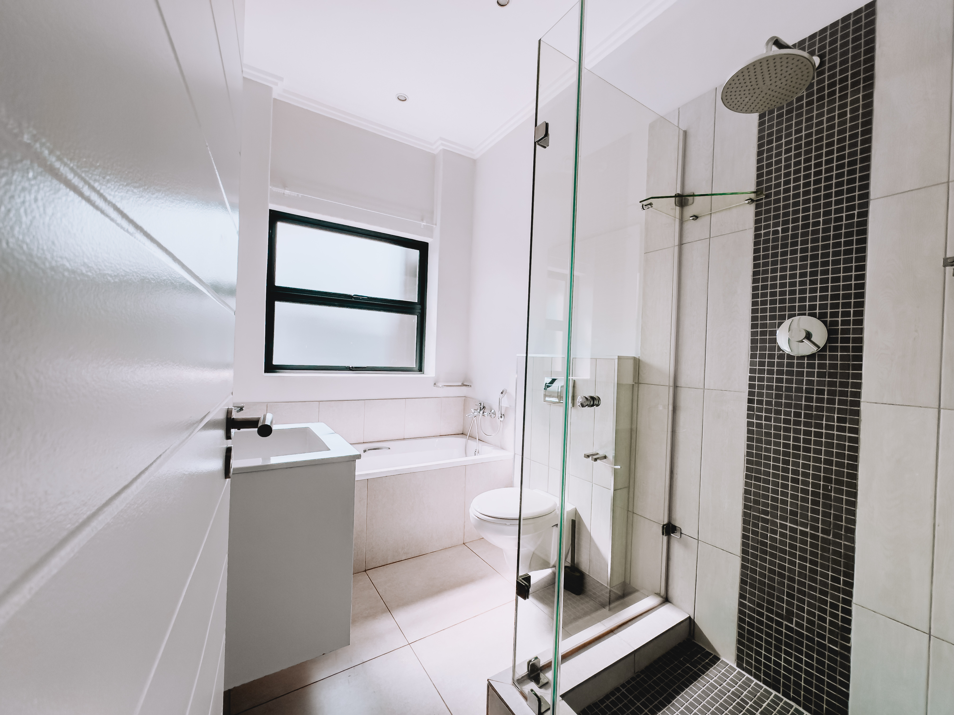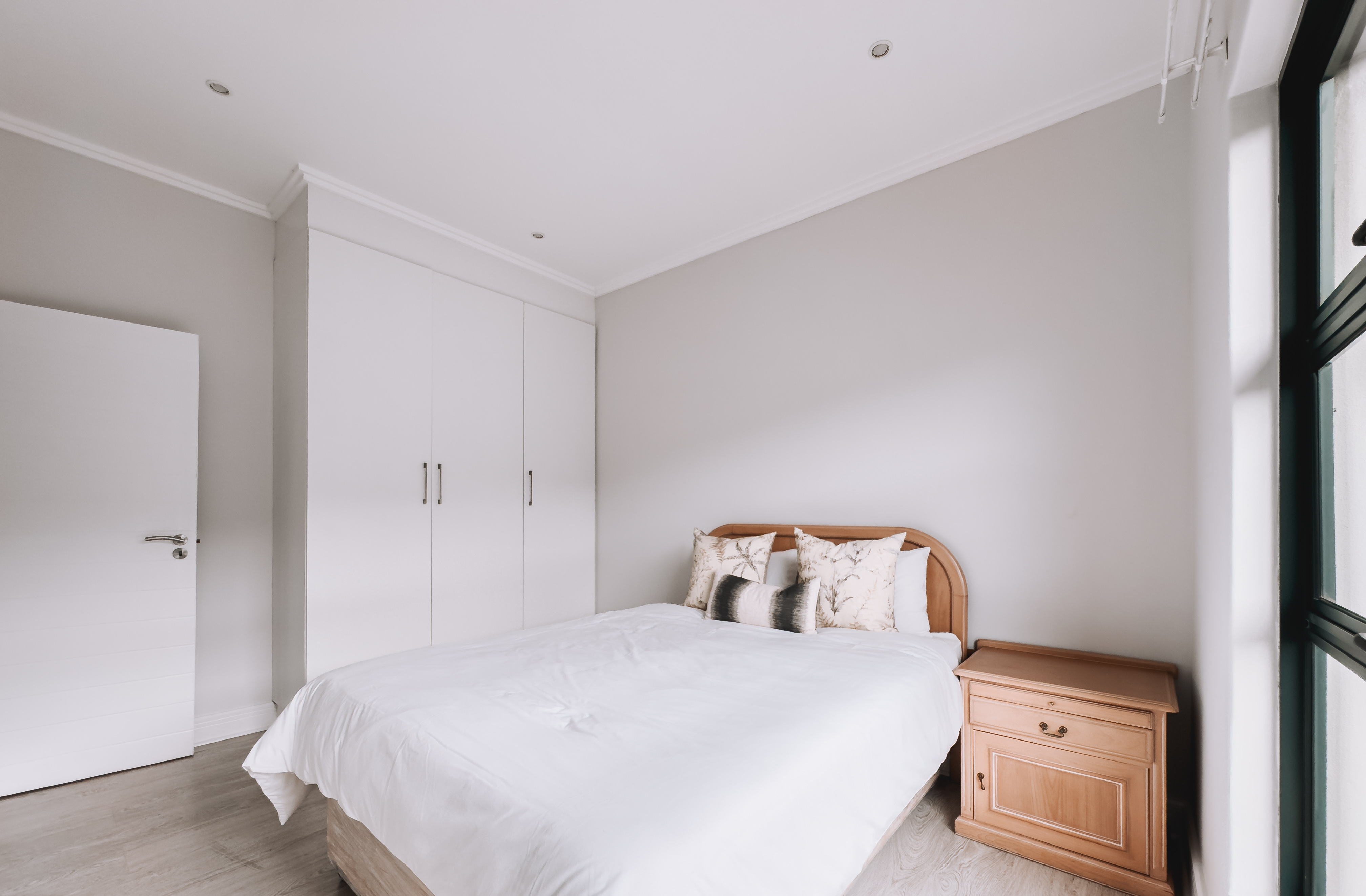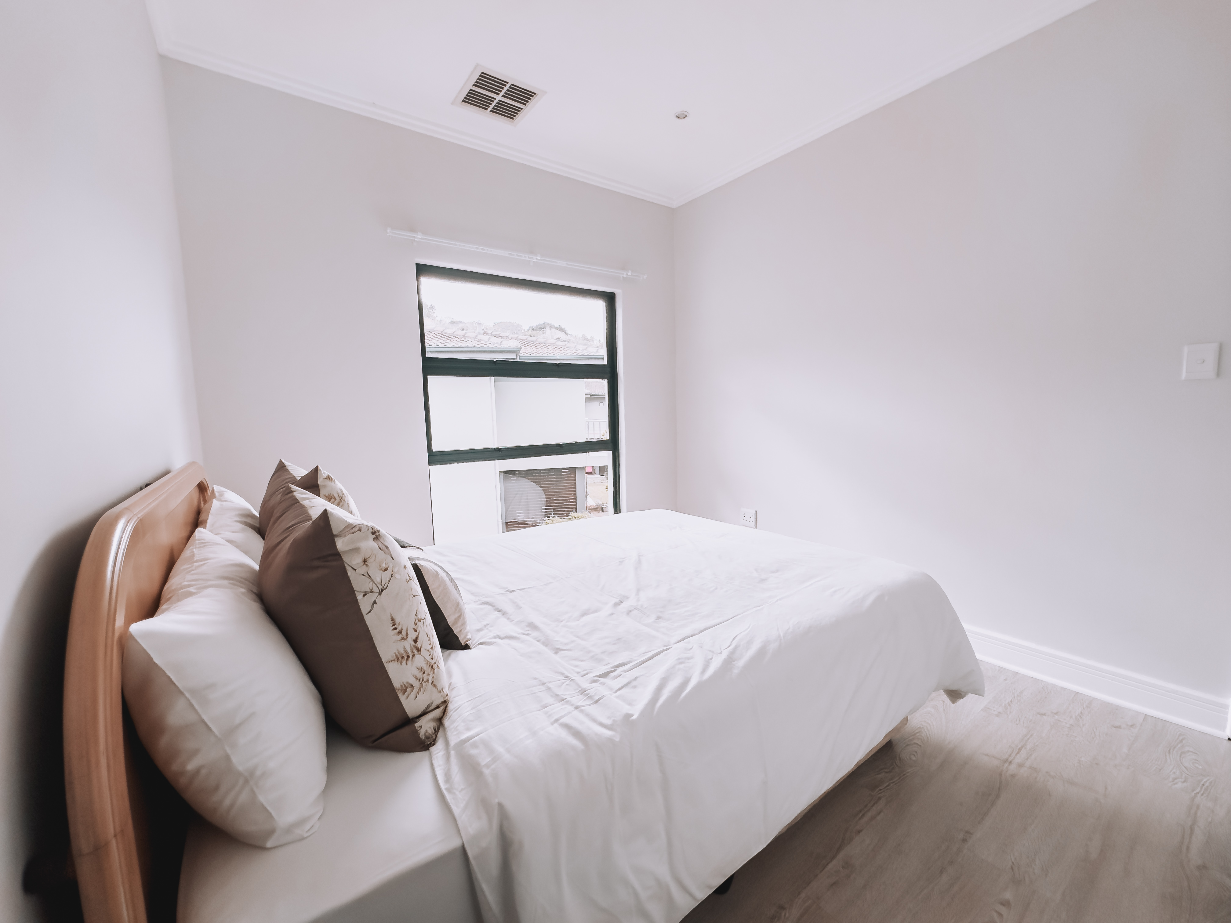 All three bedrooms are generously sized, featuring built-in cupboards and large windows inviting natural light throughout. The main suite includes a stylish en-suite bathroom, while the additional bedrooms share a modern full bathroom. The home also includes a double garage with direct access, a separate scullery, and air-conditioning for year-round comfort.