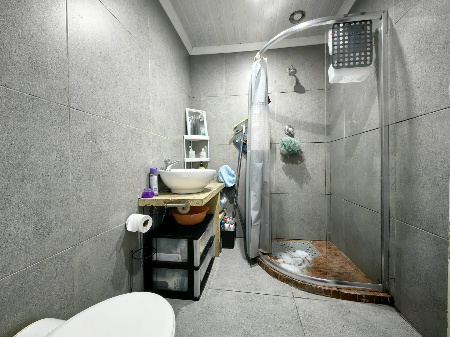 - Fully tiled bathroom with shower and vanity basin