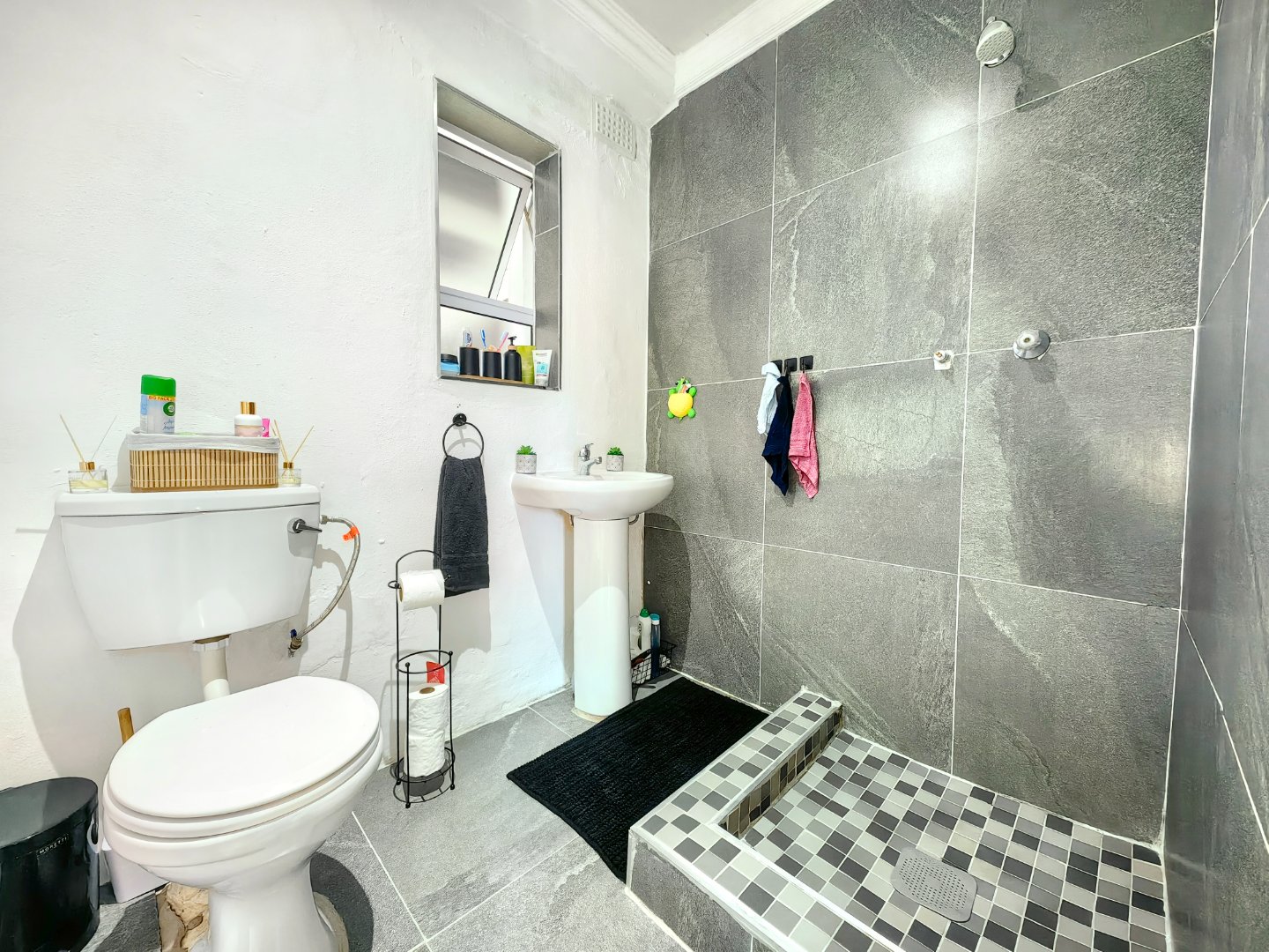 - Tiled bathroom with walk-in shower