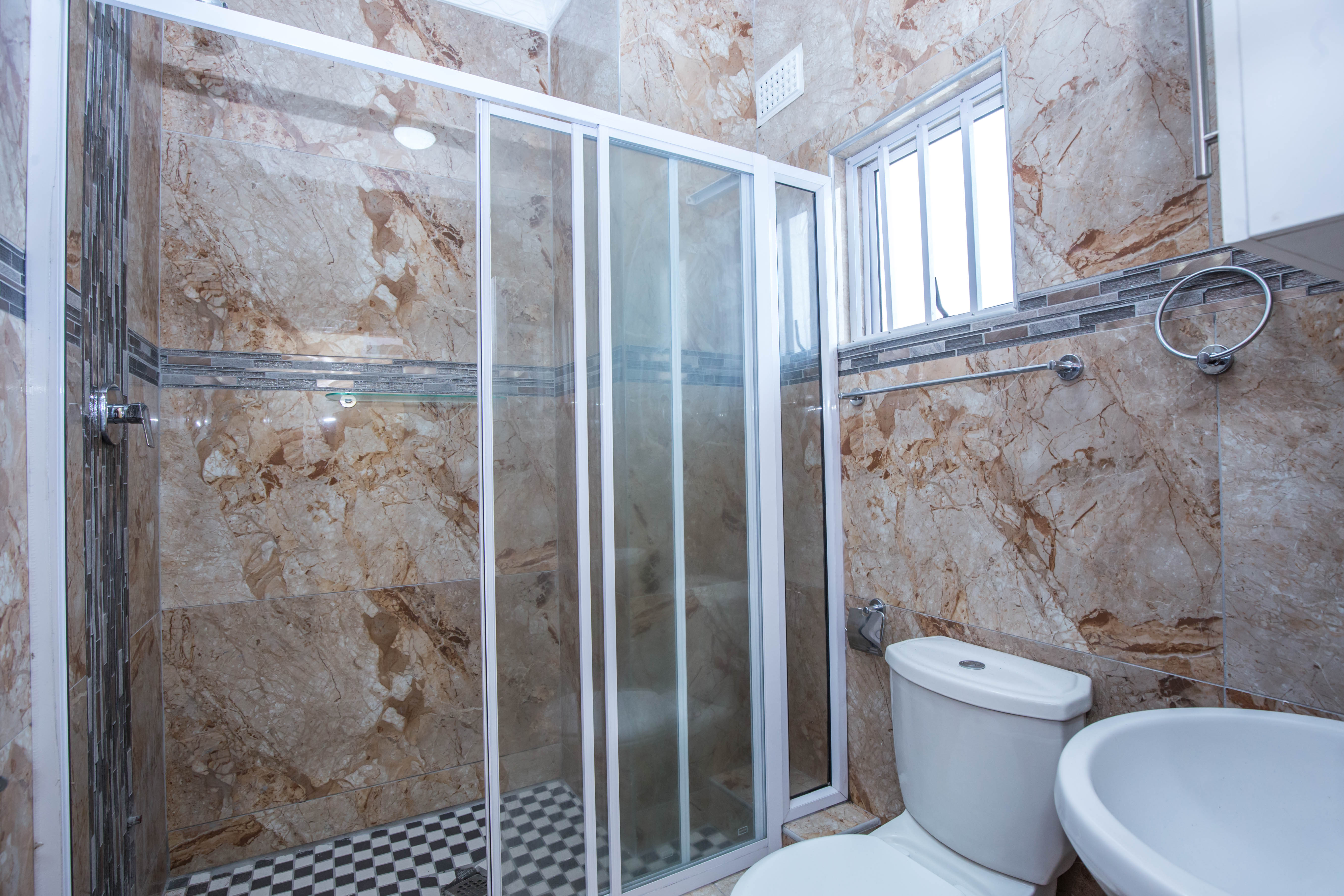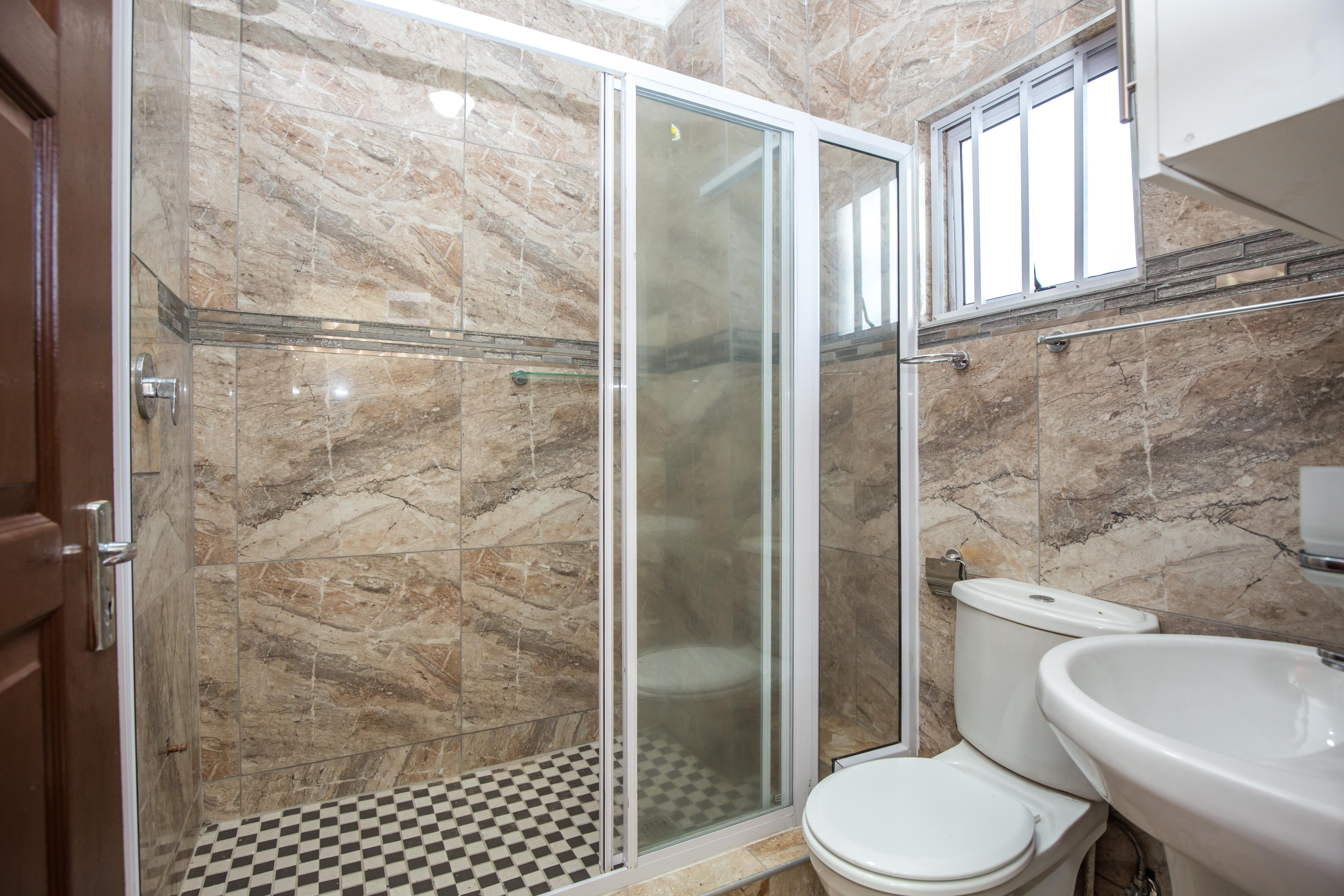 Bathroom with large shower, toilet and basin, fully tiled.