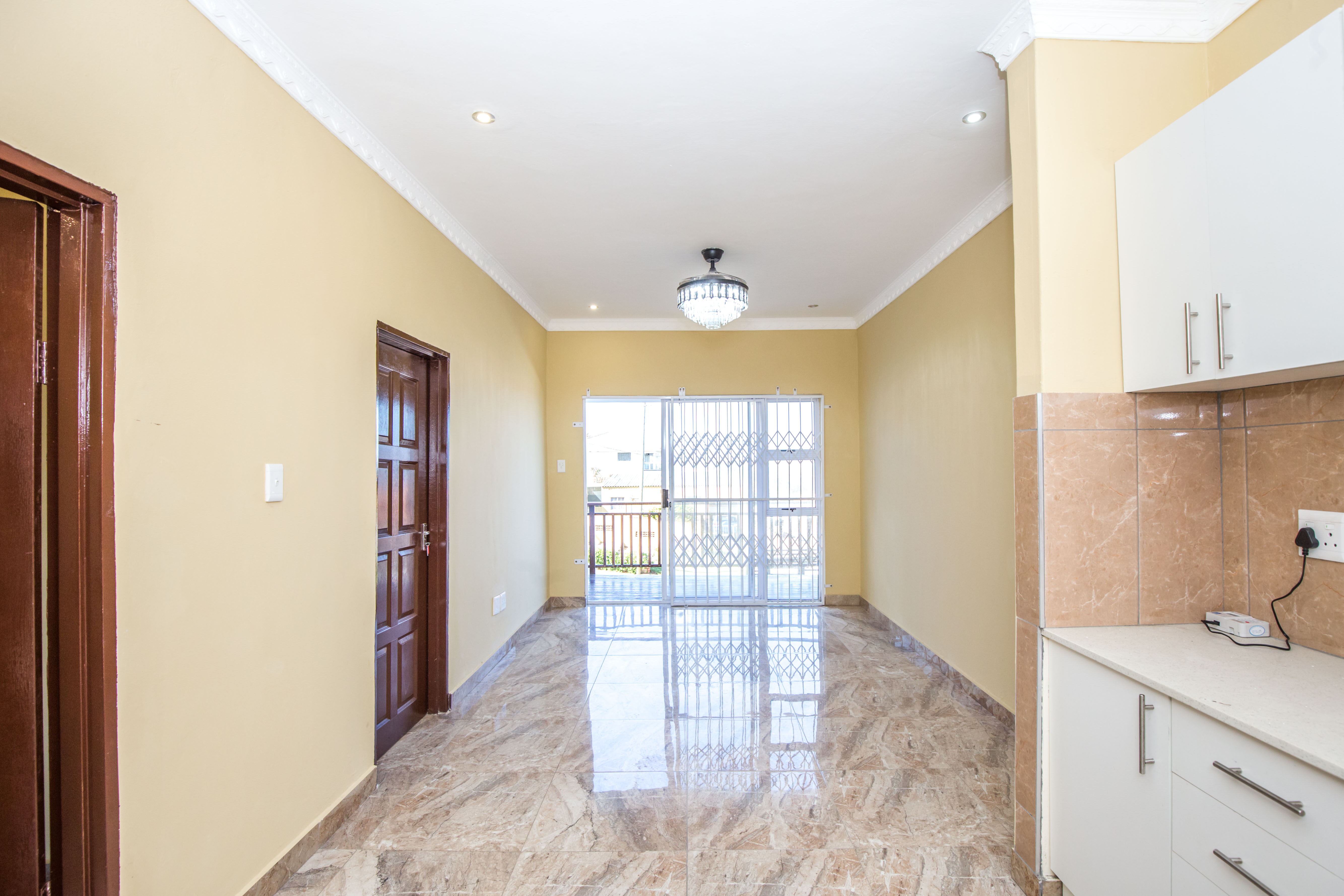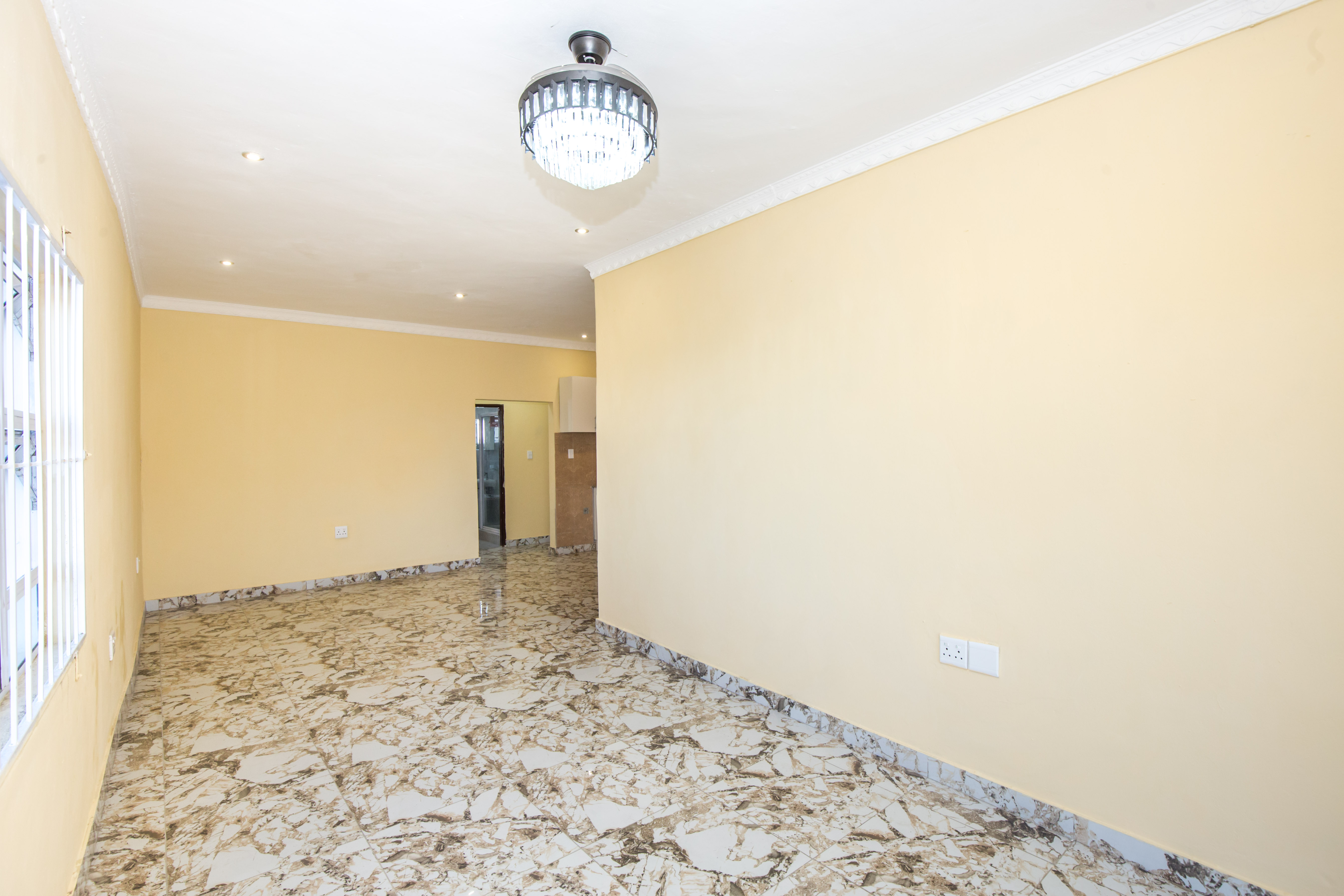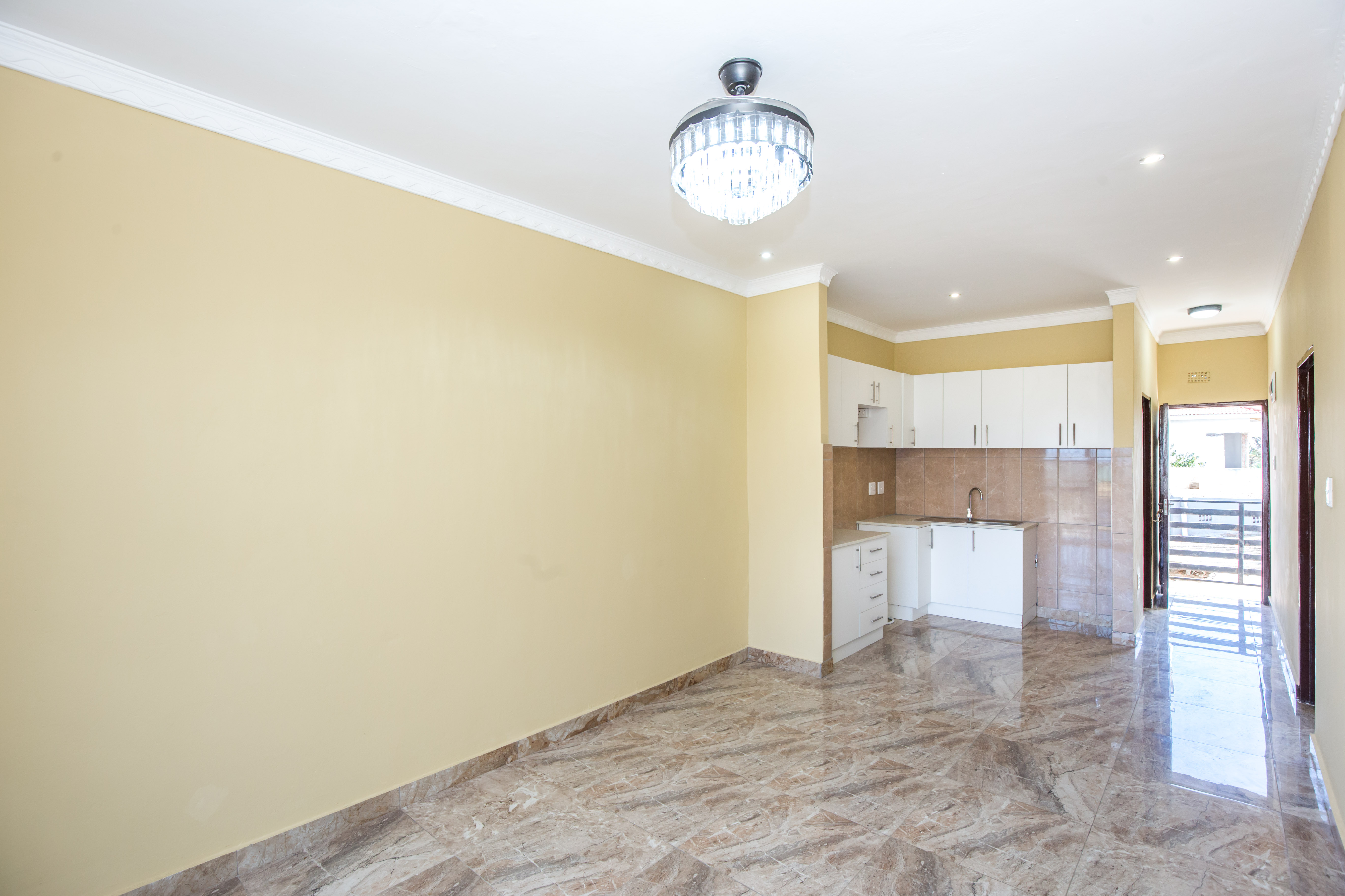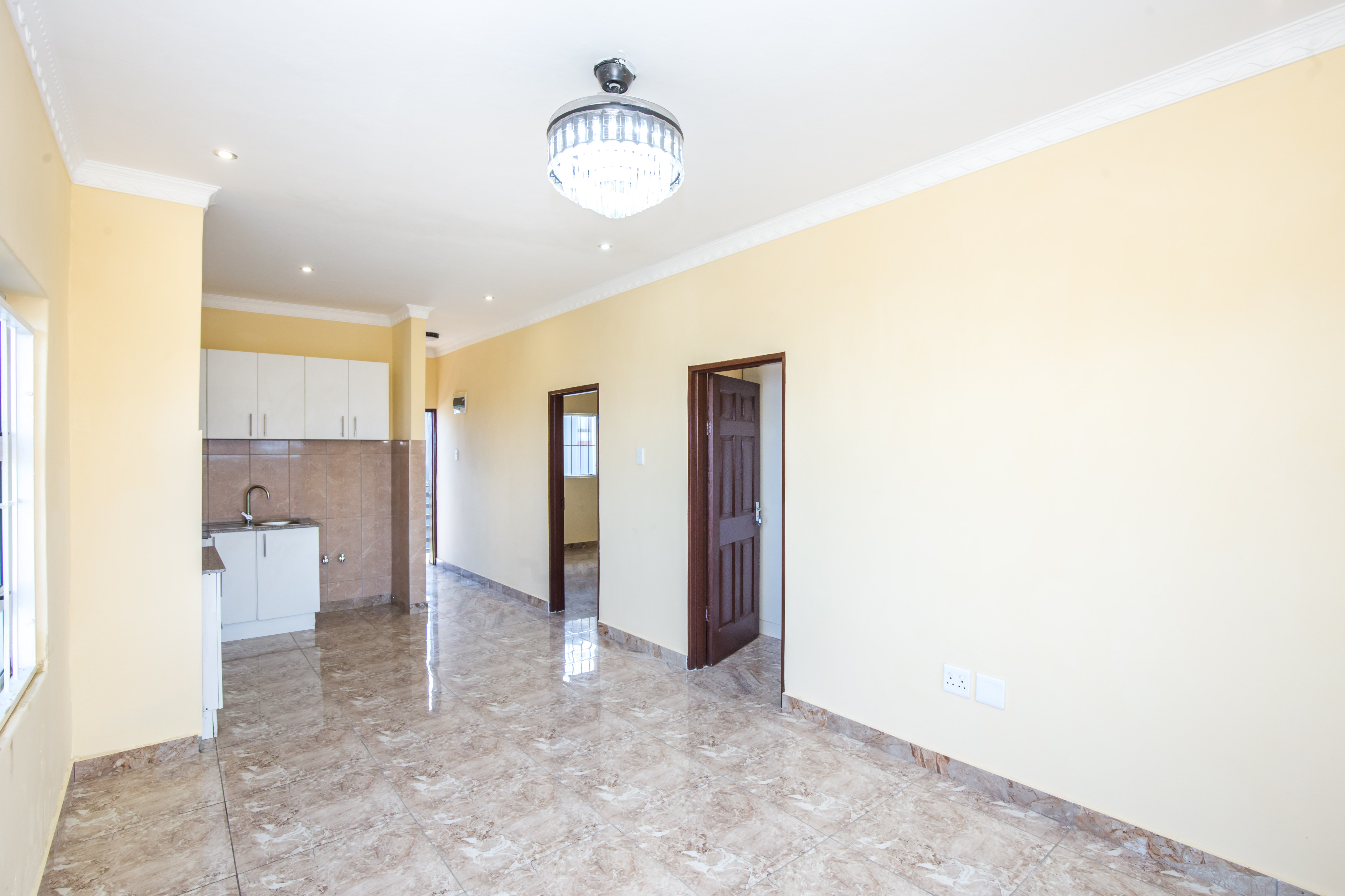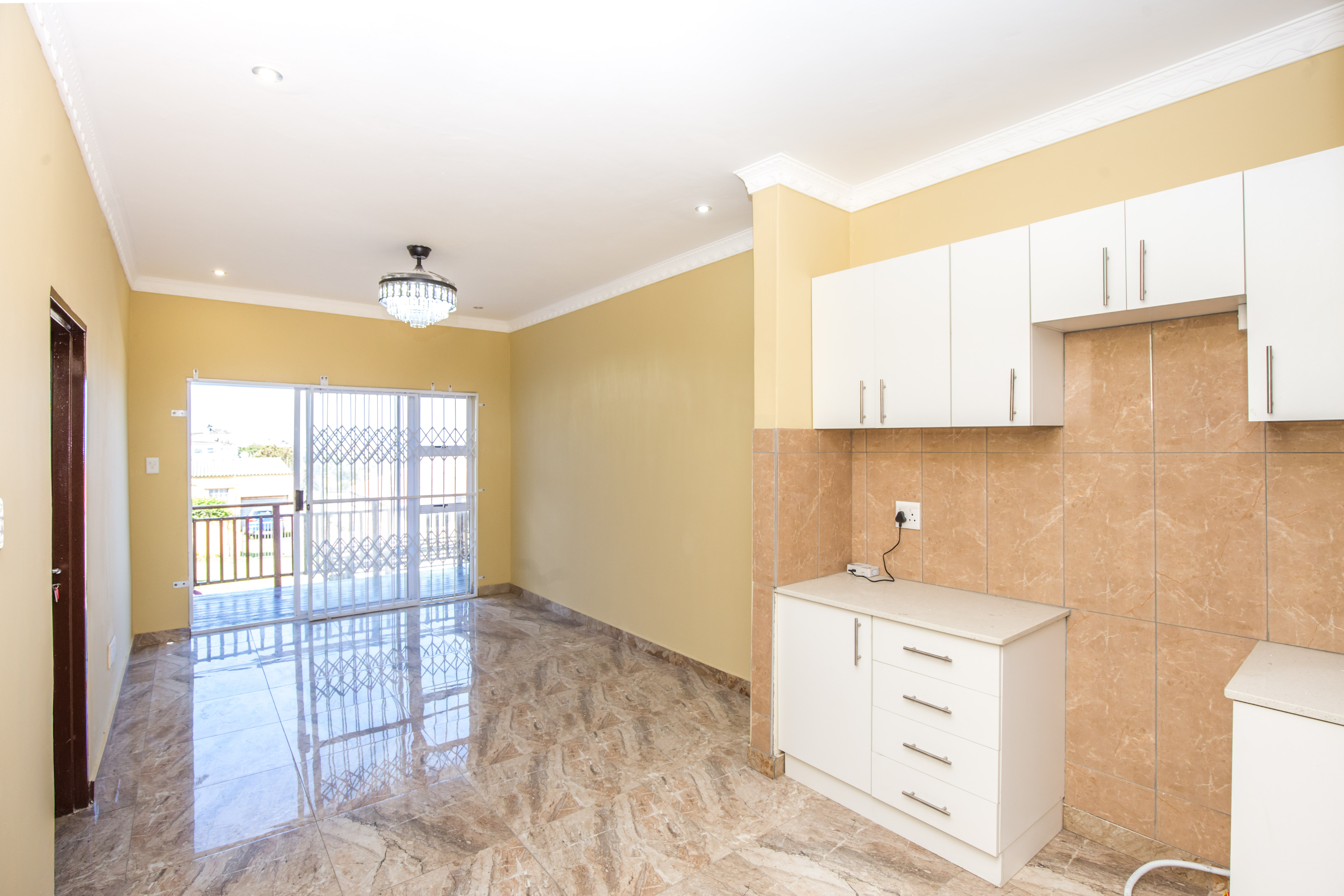 Open plan lounge and dining room fully tiled.