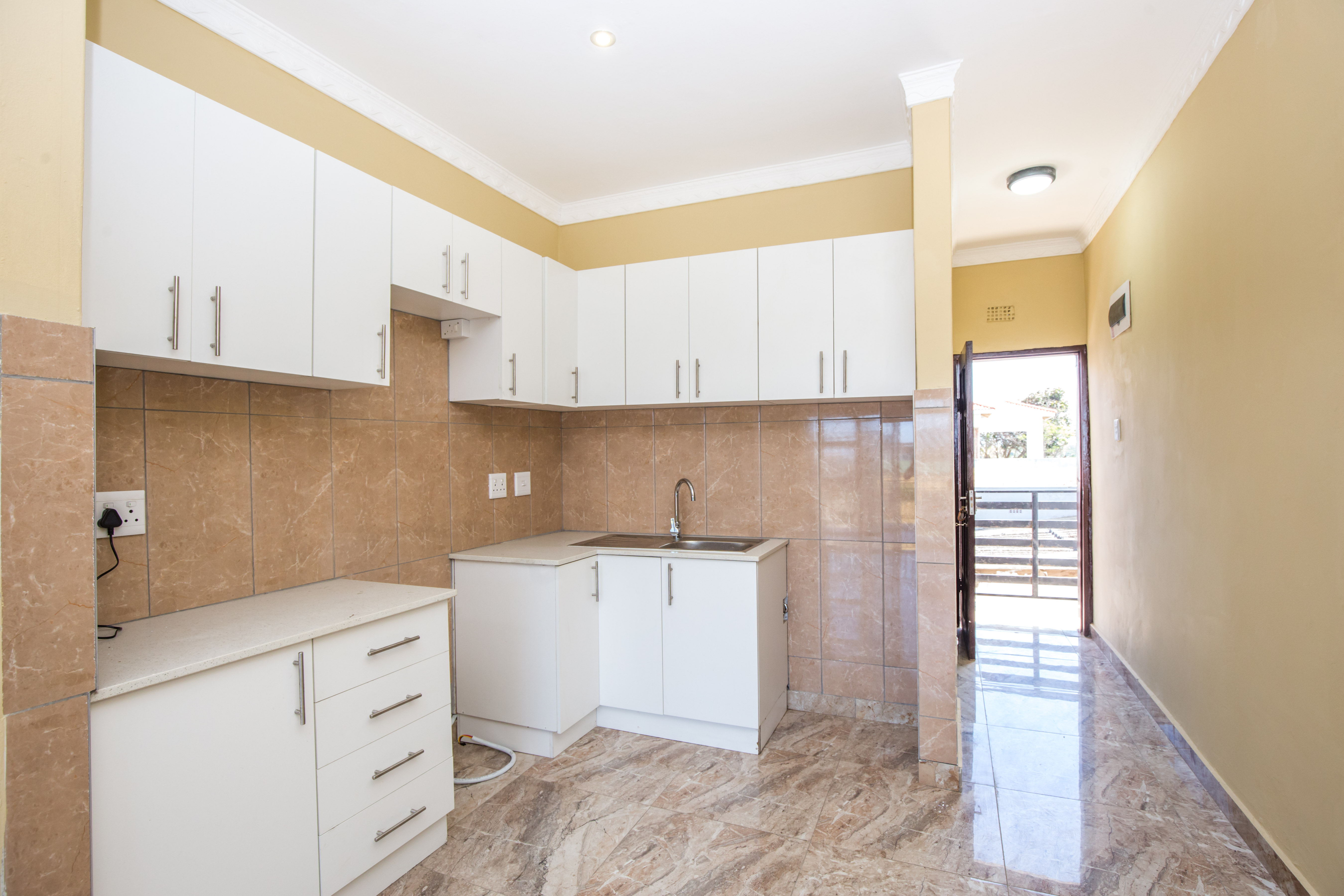 Open plan kitchen with fitted cupboard and plumbed for washing machine.