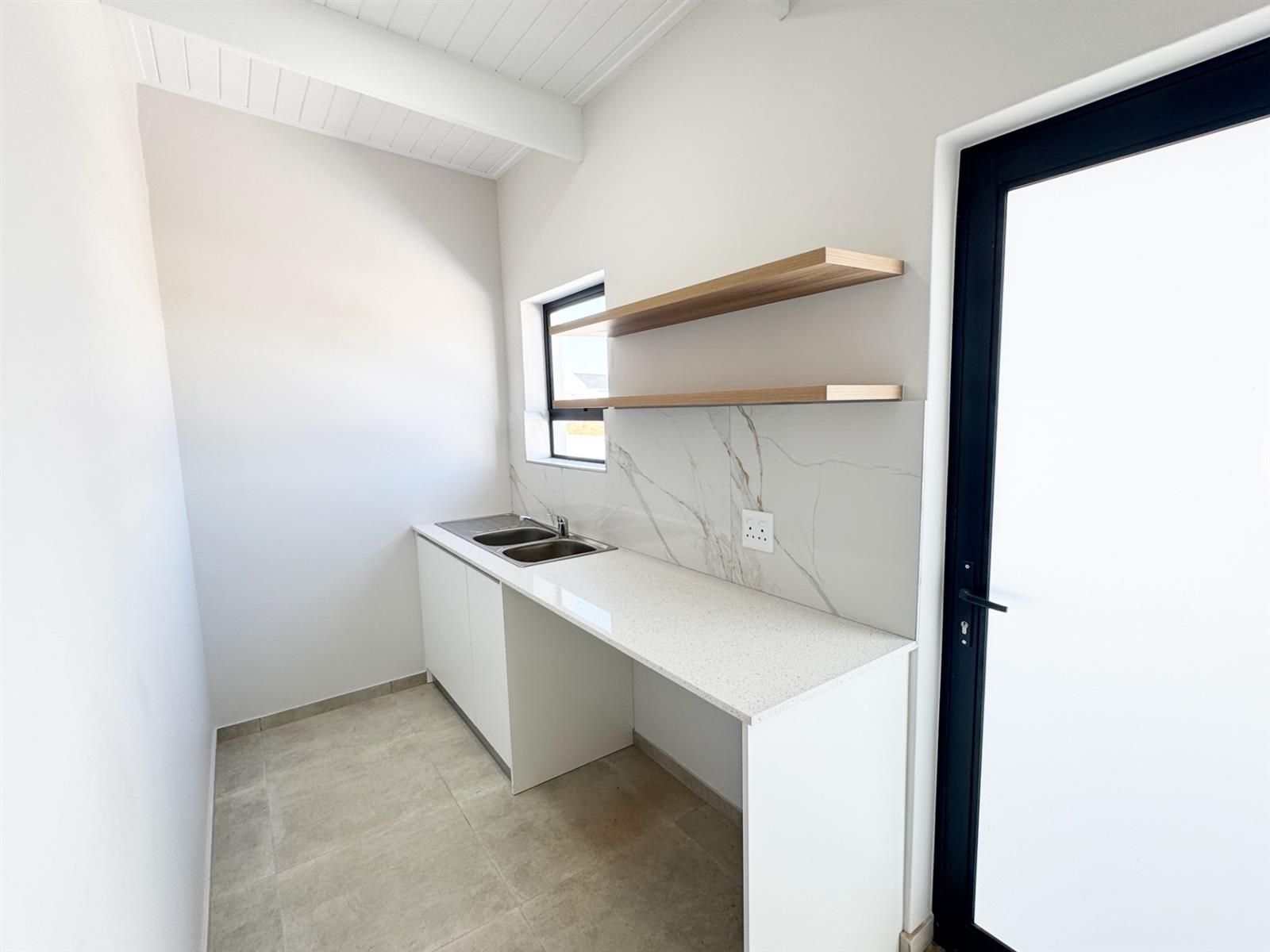 The modern kitchen is fitted with sleek quartz countertops, a central island, ample cabinetry, and a 9-litre gas bottle-ready cupboard, combining beauty and practicality. A separate scullery provides additional storage and appliance space, keeping the main living area clutter-free.