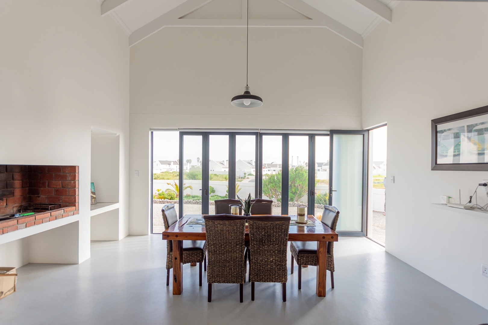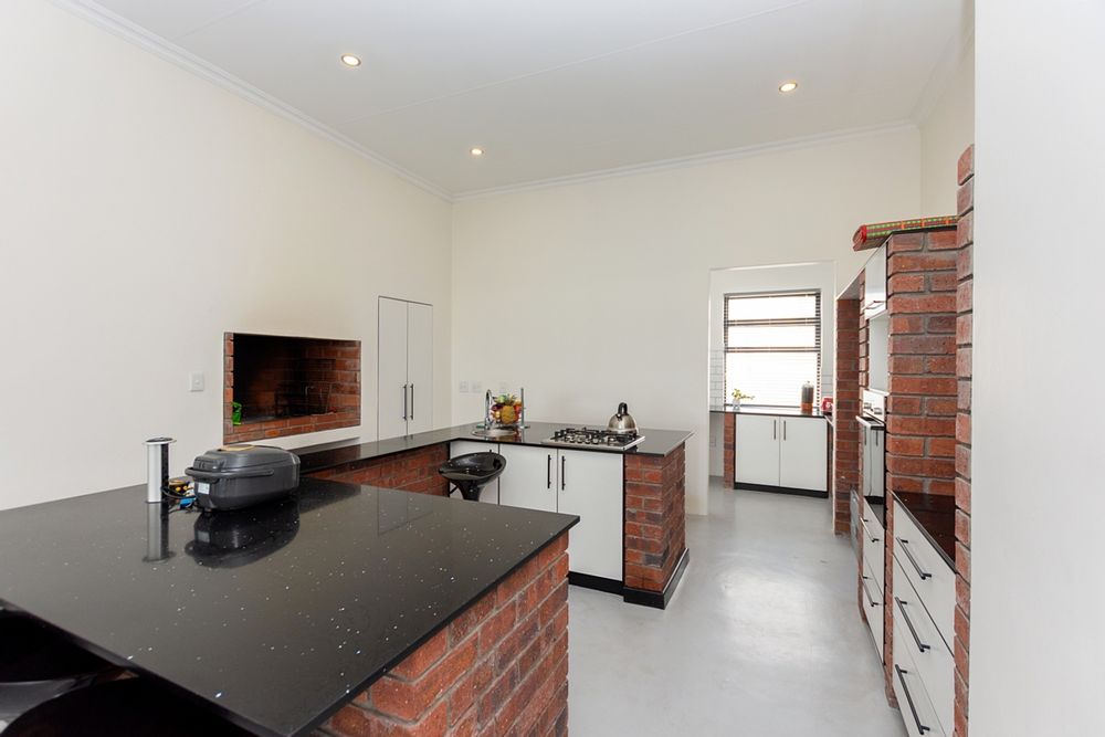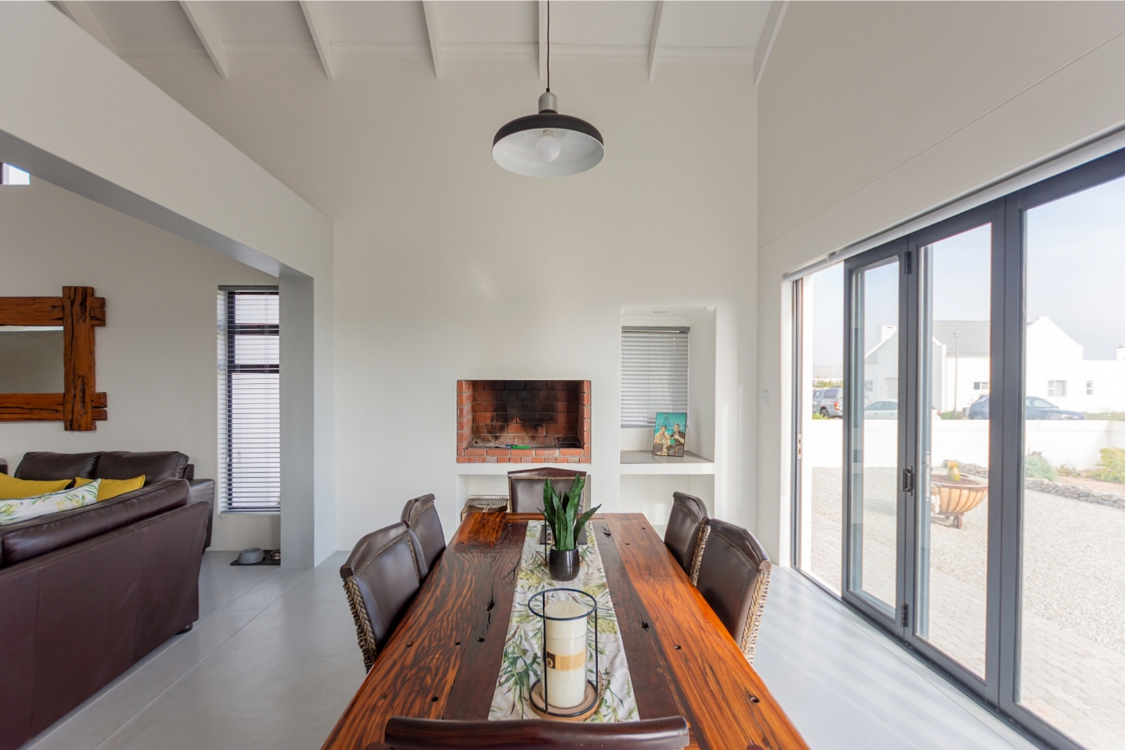 As you enter, you are welcomed into a spacious dining area with a family-friendly indoor braai area and double-volume ceilings, creating a warm and open atmosphere.