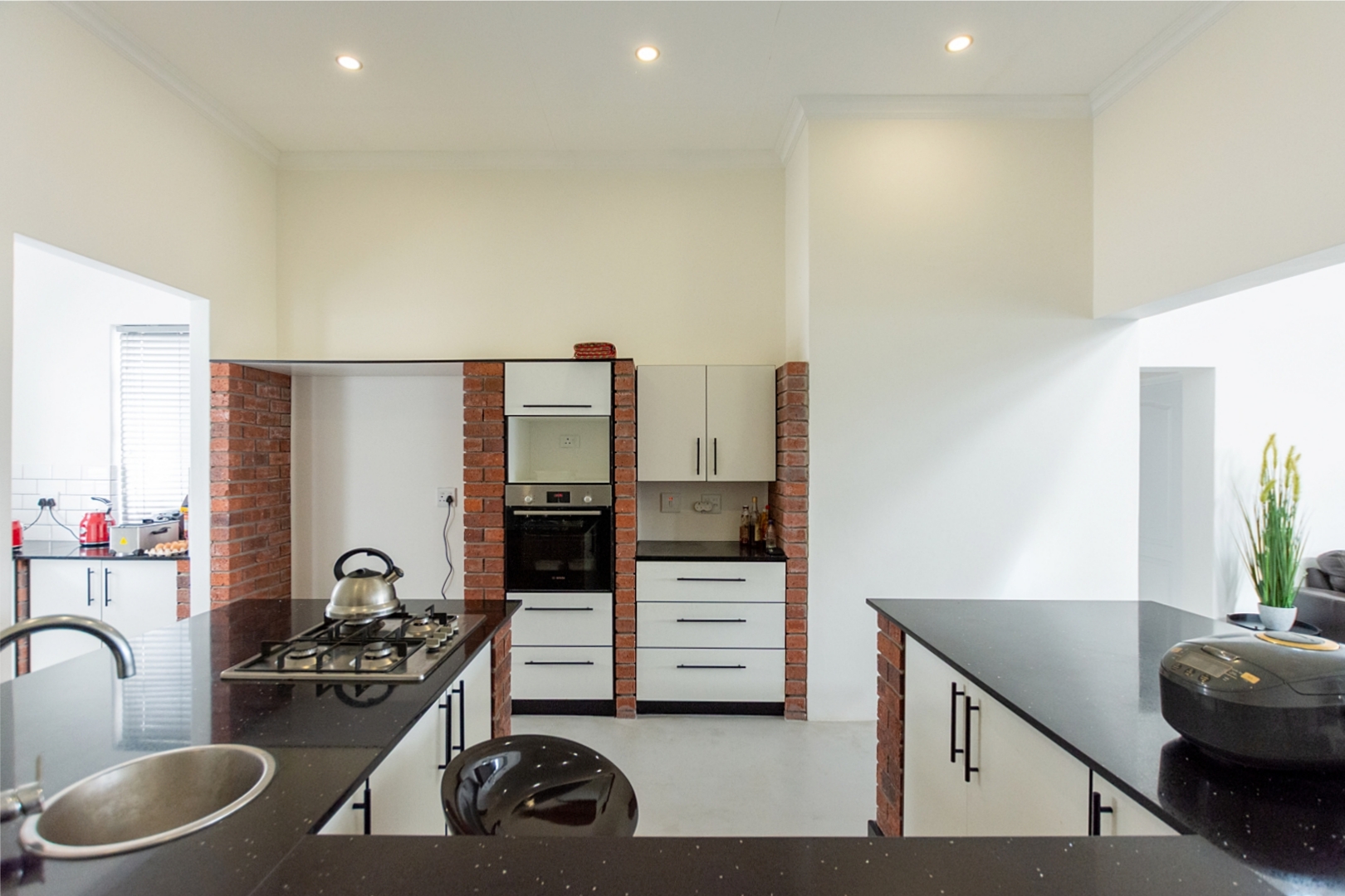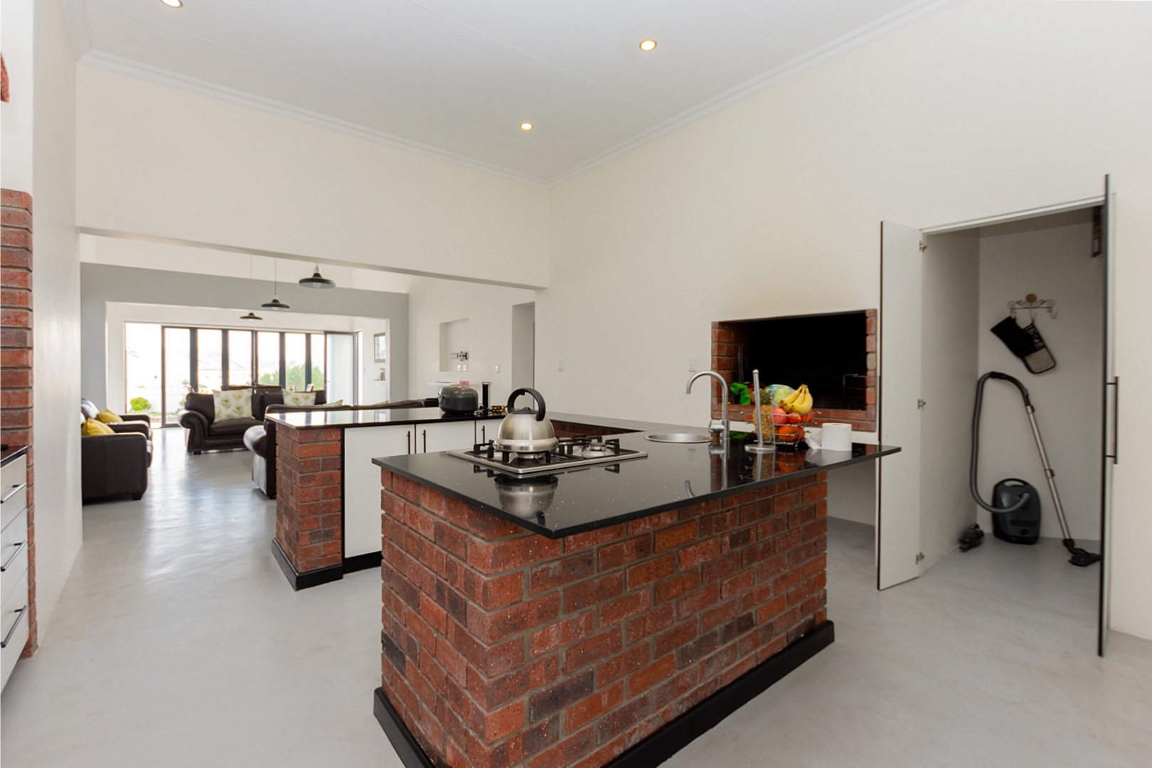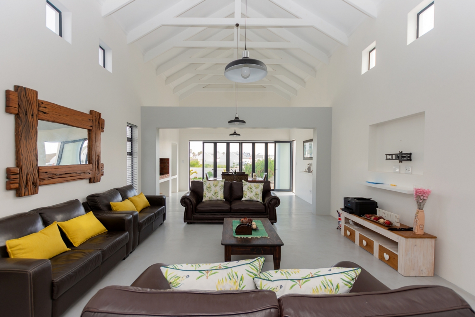 As you enter, you are welcomed into a spacious dining area with a family-friendly indoor braai area and double-volume ceilings, creating a warm and open atmosphere.
