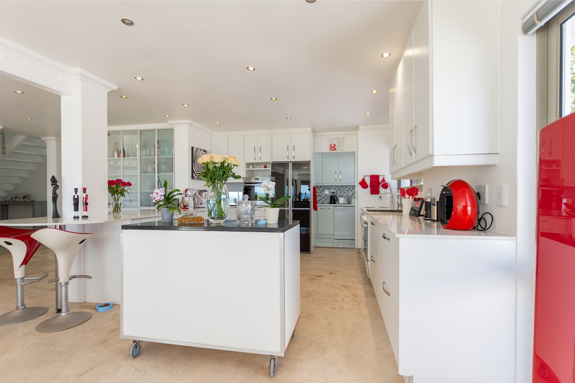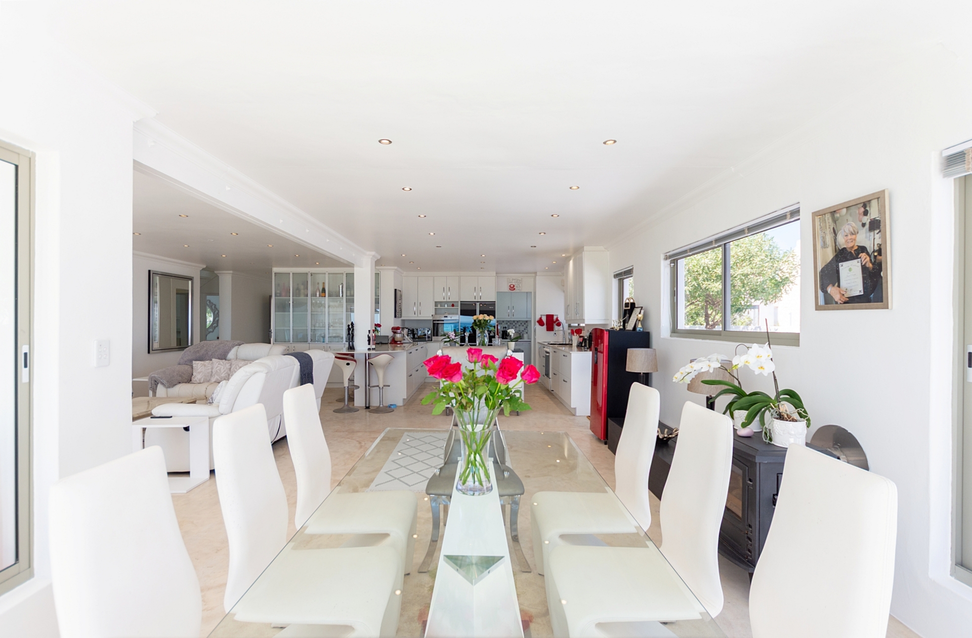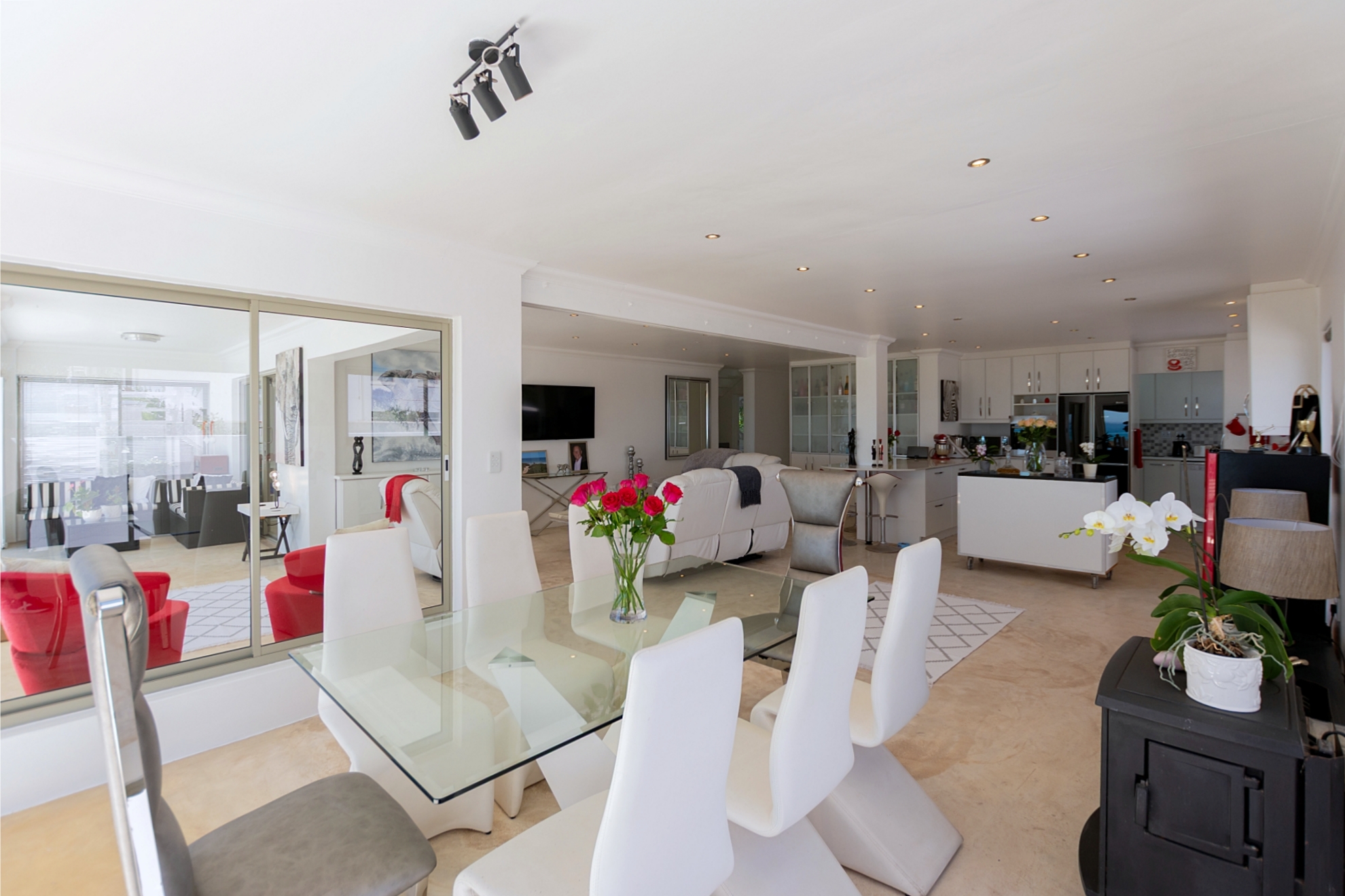 Designed for easy coastal living, the heart of the home is a generous open-plan lounge and dining area with a modern kitchen, Caesarstone and granite countertops, Bosch gas hob, electric oven and separate scullery. Large sliding doors draw in sweeping sea views and open to a wind-protected patio with pool and seating – the perfect place to linger over long summer lunches or relax with a glass of wine as the sun sets.