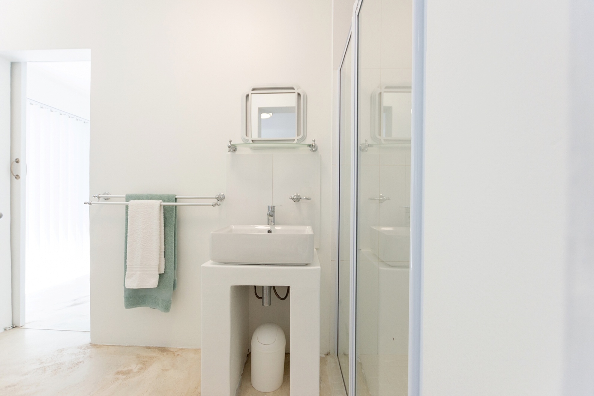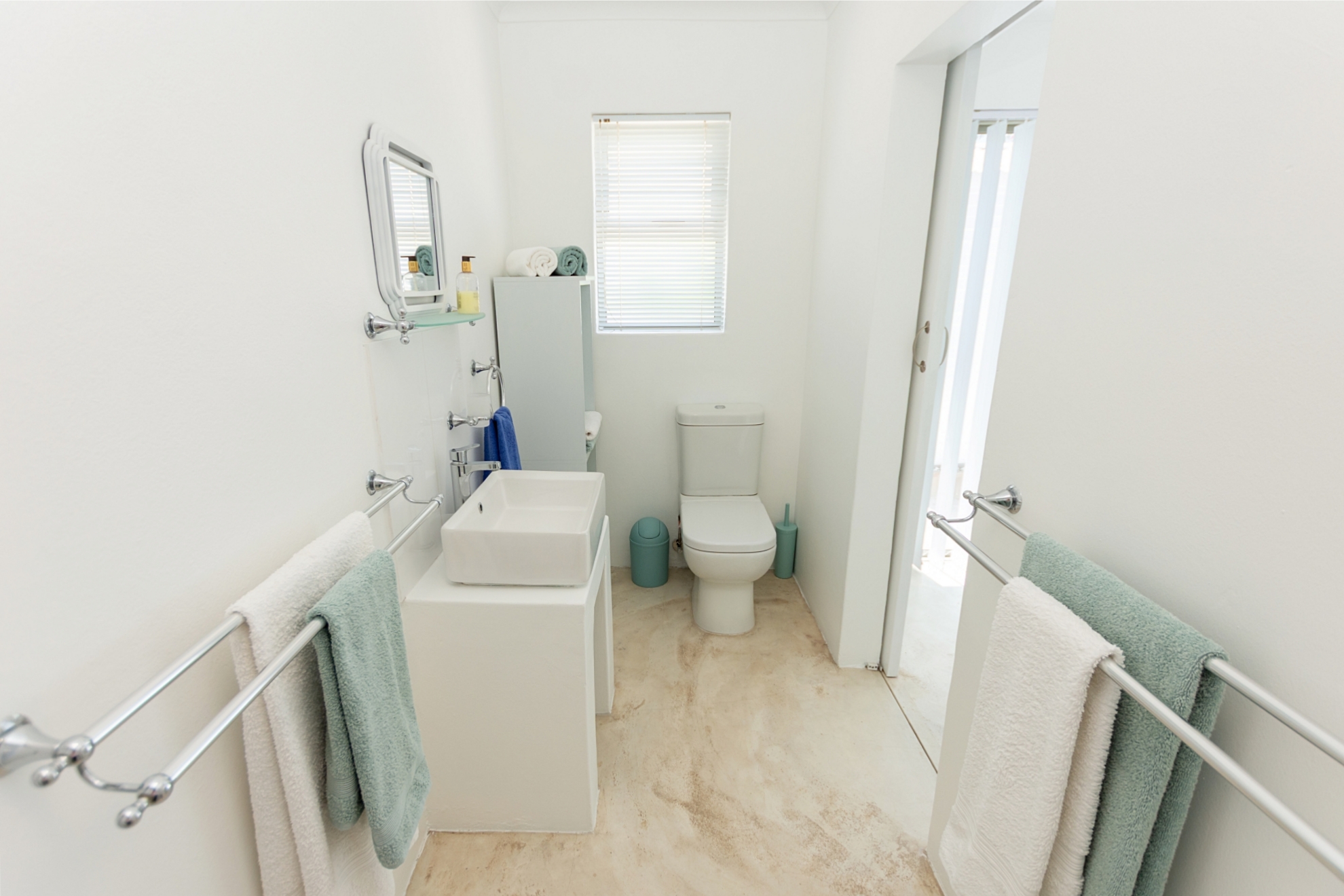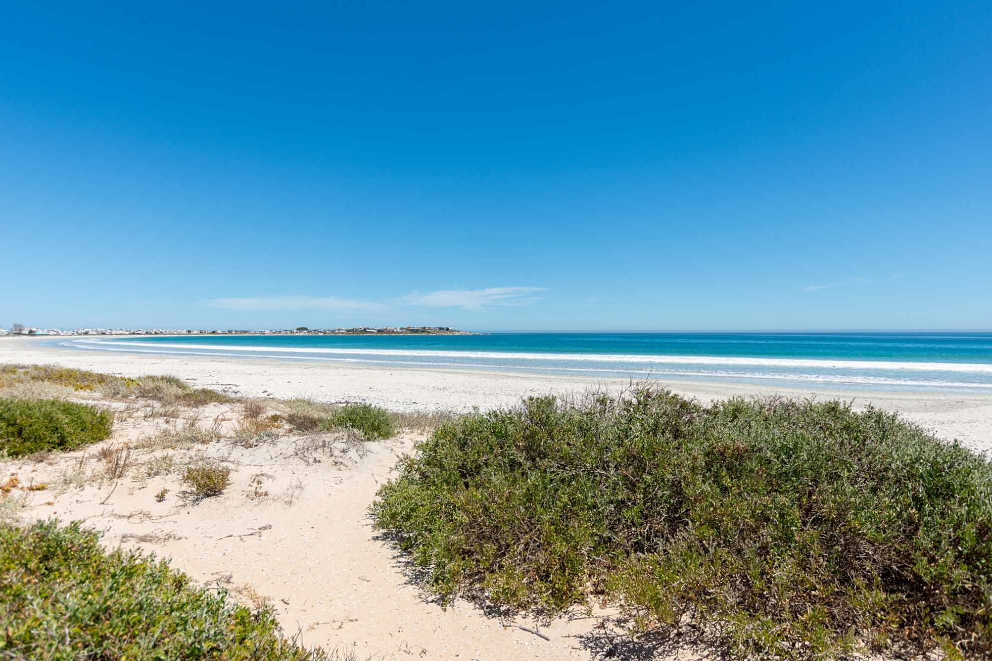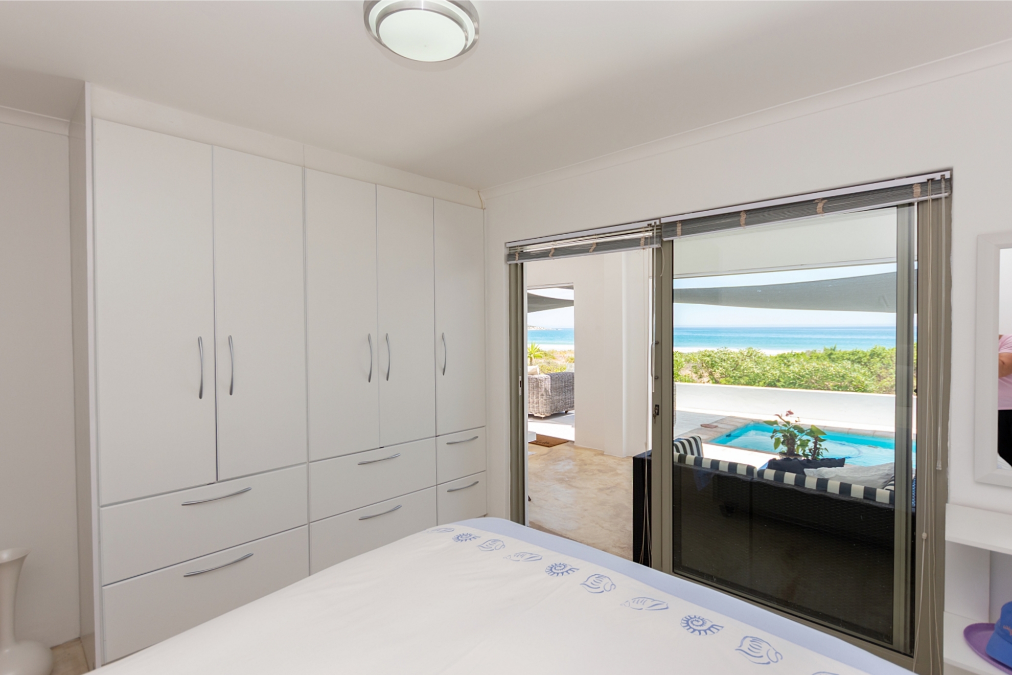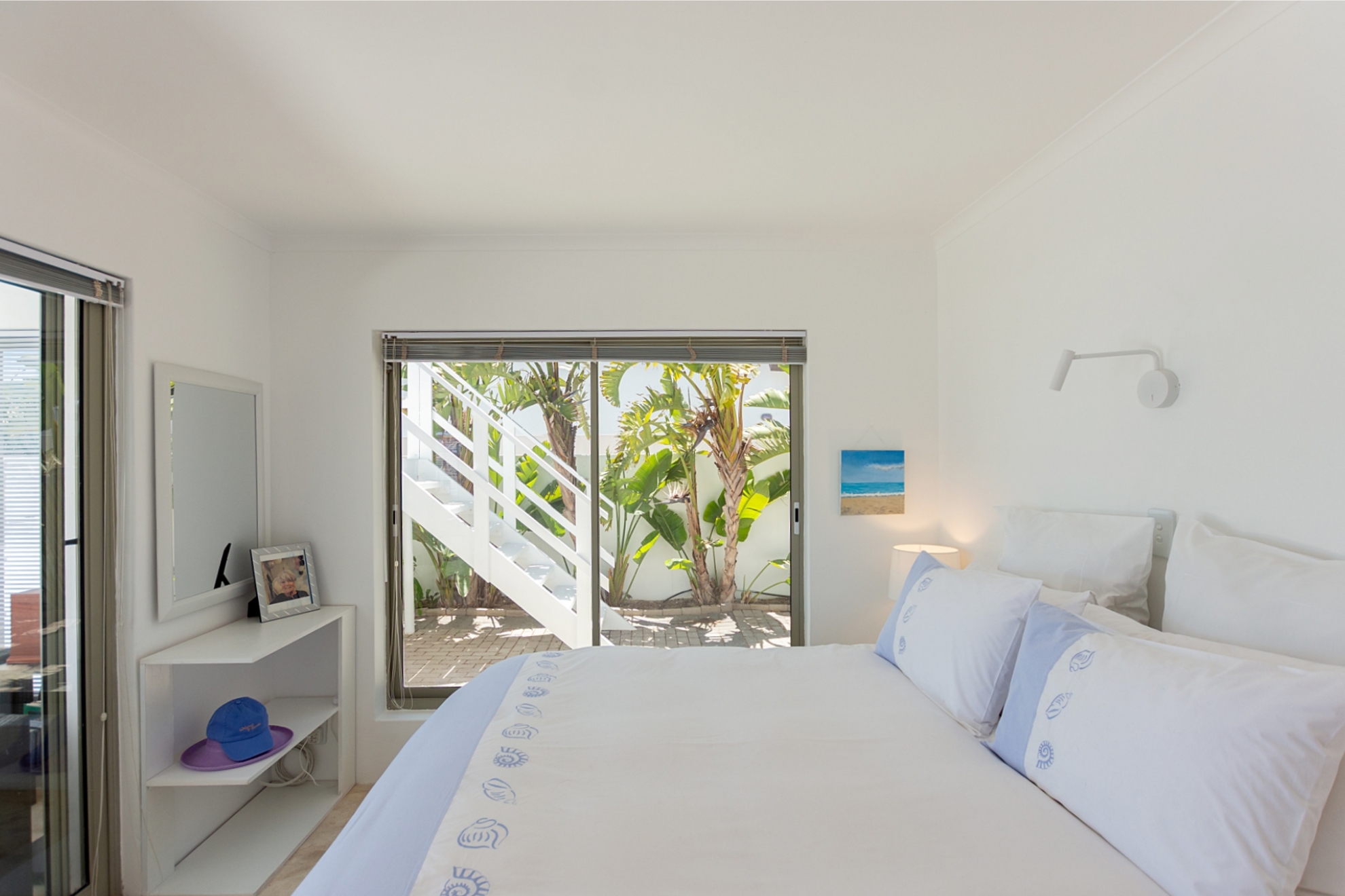 A private walkway leads from the patio through natural coastal vegetation to the soft sands and calm waters of Britannia Bay, known for safe swimming, gentle surf and frequent dolphin and whale sightings.