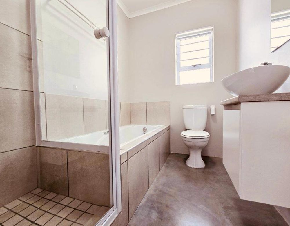 The main bedroom is generously sized and features an en-suite bathroom, complete with contemporary fixtures and a luxurious feel. The second bedroom is equally spacious, offering built-in cupboards and elegant screeded flooring, providing both style and functionality. For added security, the home is equipped with burglar bars and shutters.