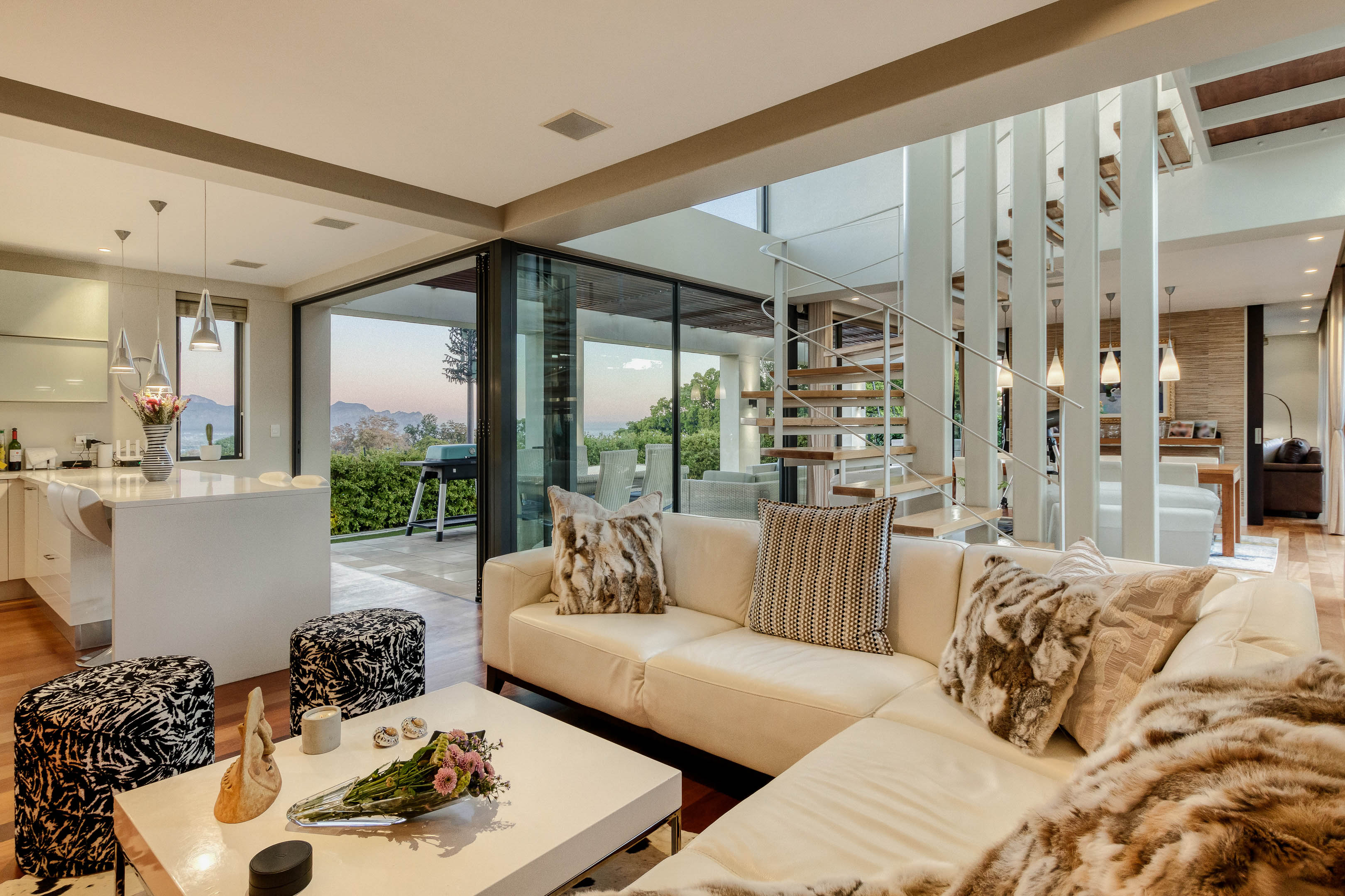 The double-storey design features a dramatic staircase and an open-plan layout that includes two lounges and a separate dining area, perfect for versatile entertaining.