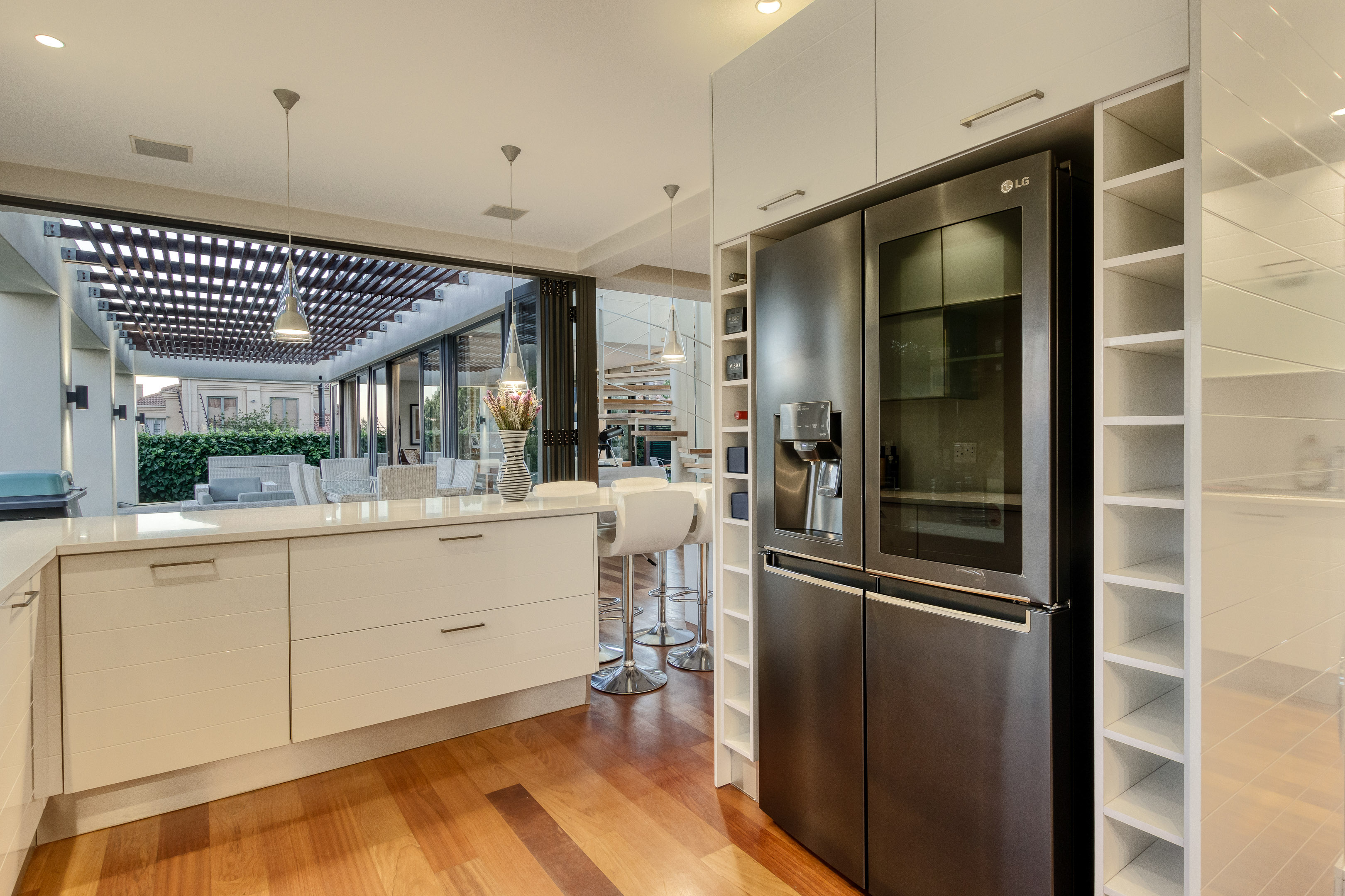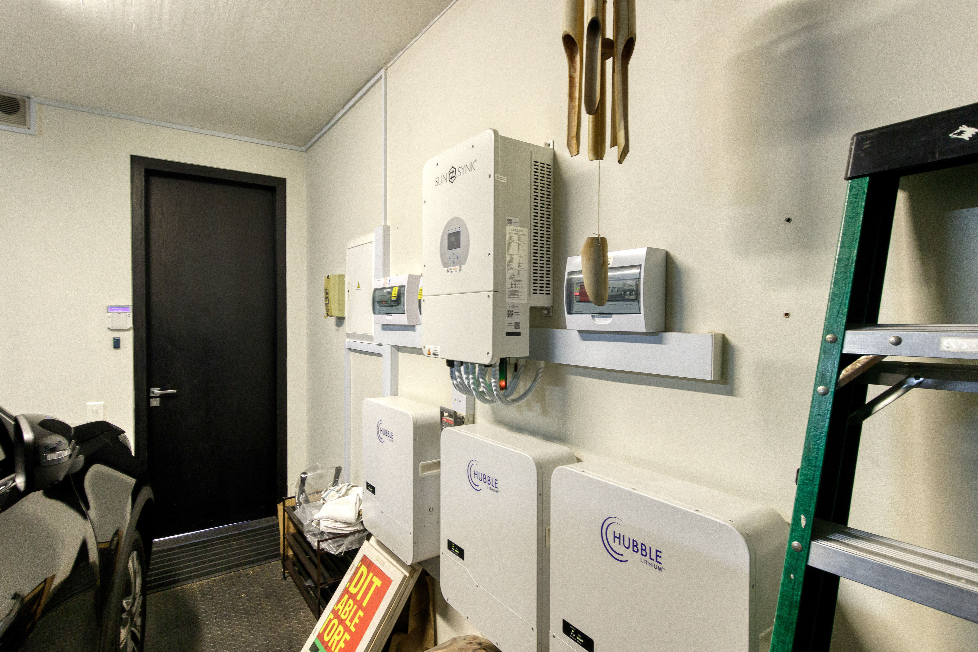 The sleek, contemporary kitchen comes with a premium Smeg hob and a breakfast nook, while stacker doors open to a heated saltwater pool (conversion) on one side and a covered patio on the other, creating seamless indoor-outdoor living. The bedroom wing upstairs provides privacy and space, complemented by 3.5 well-appointed bathrooms. Extra features include eight energy-efficient inverter air conditioners, custom window shades, and a solar power system with an inverter and batteries for reliable, eco-friendly energy.