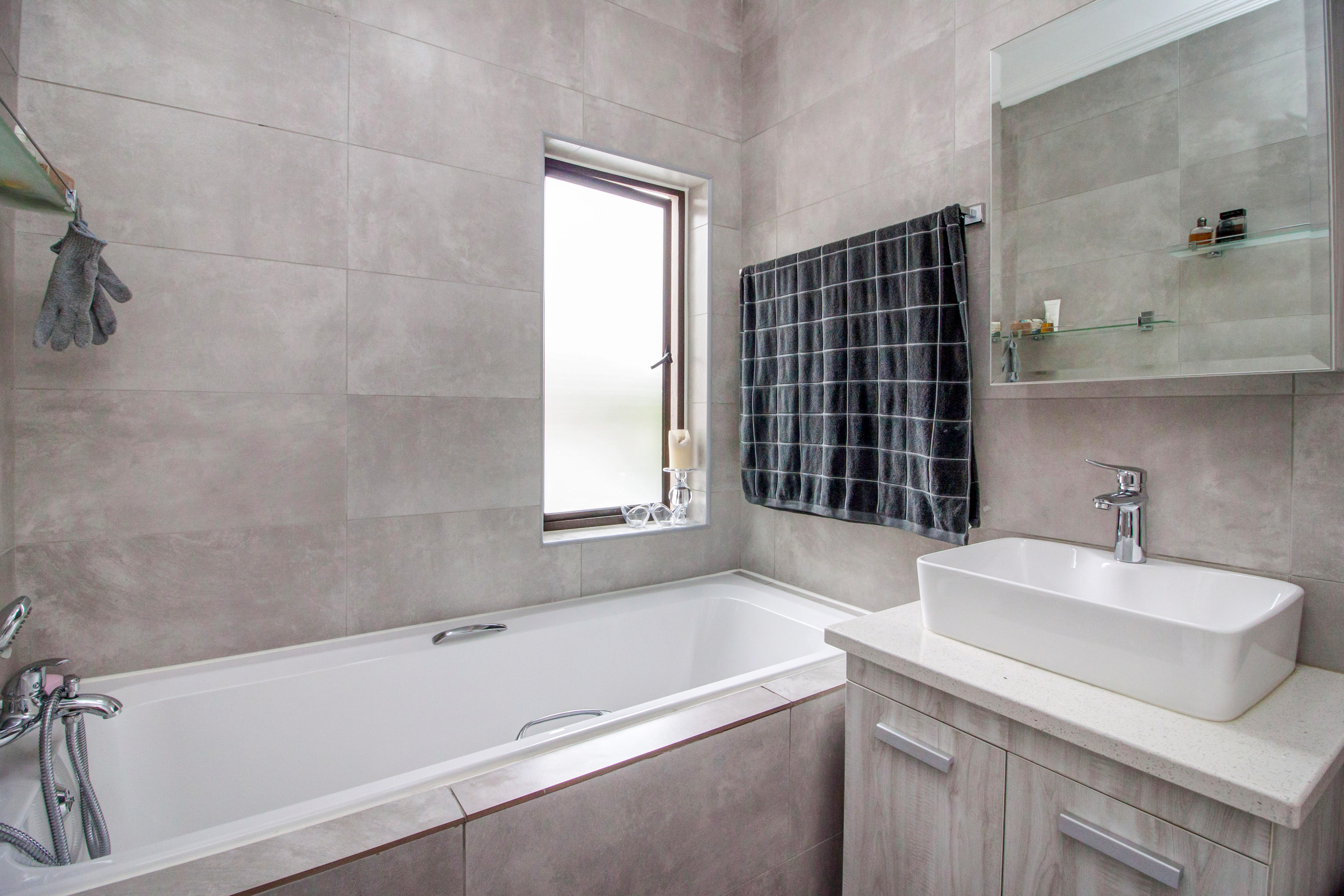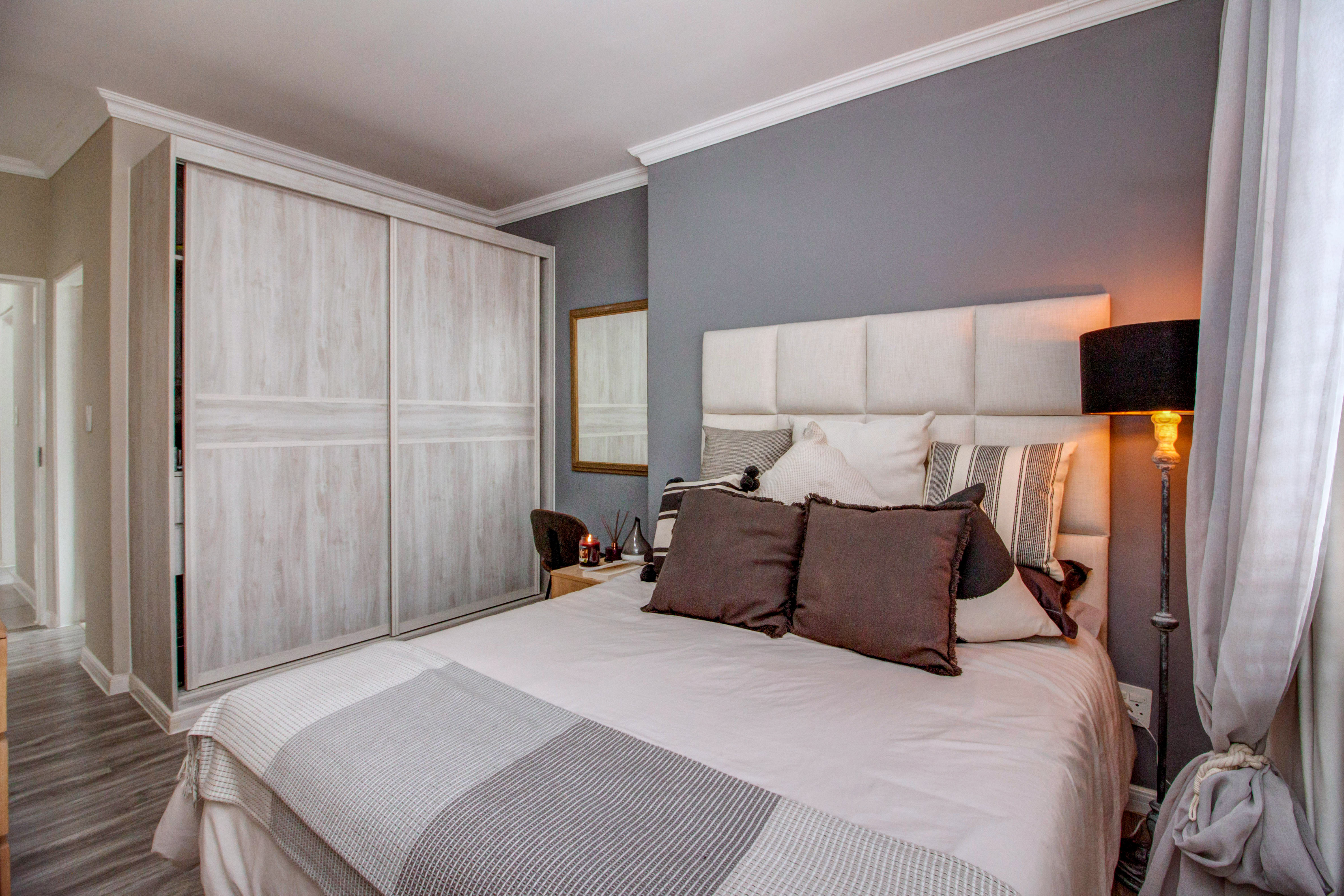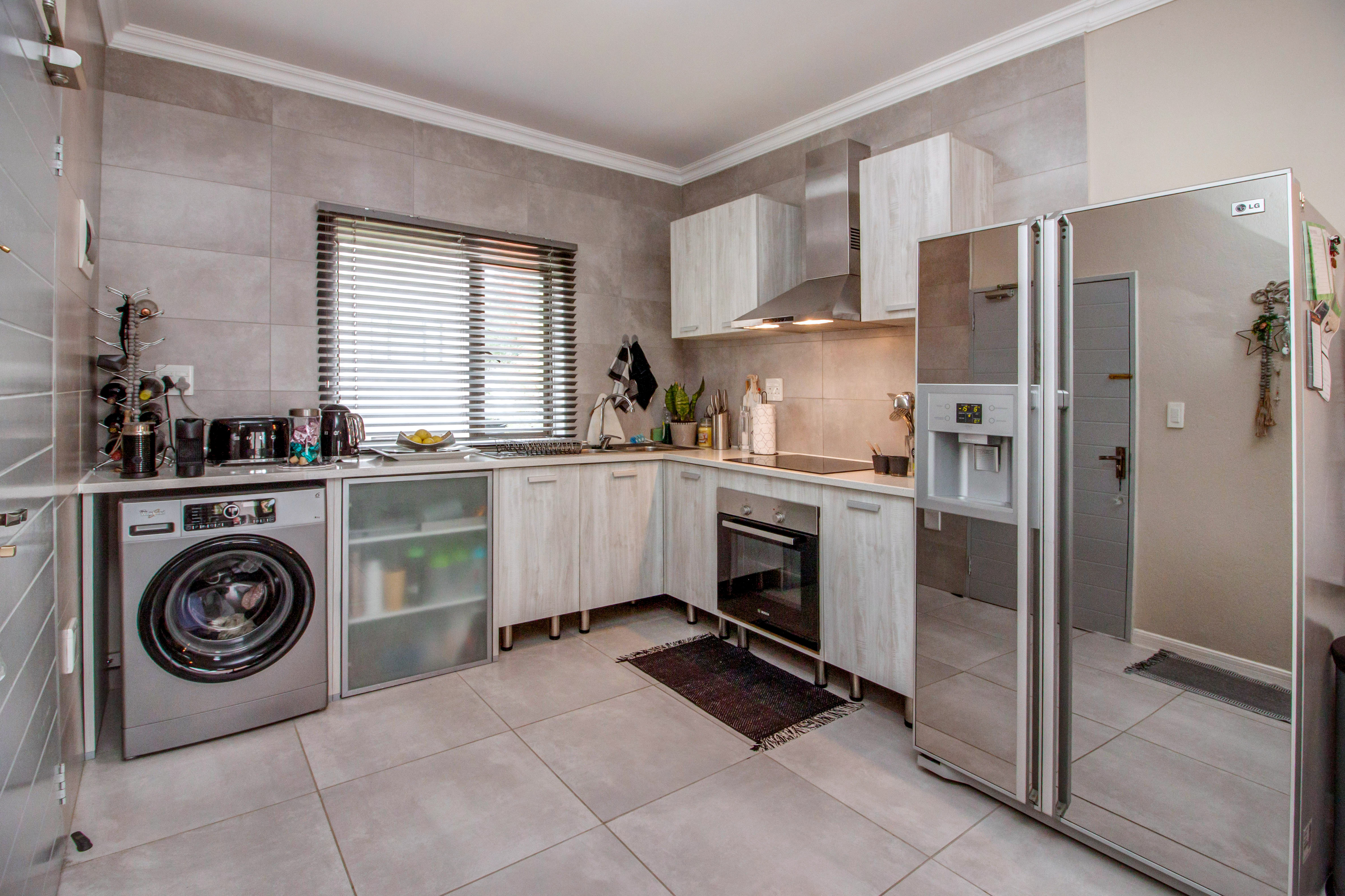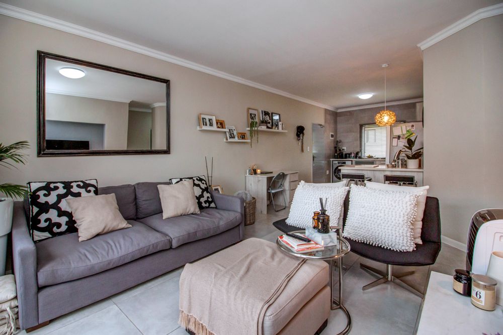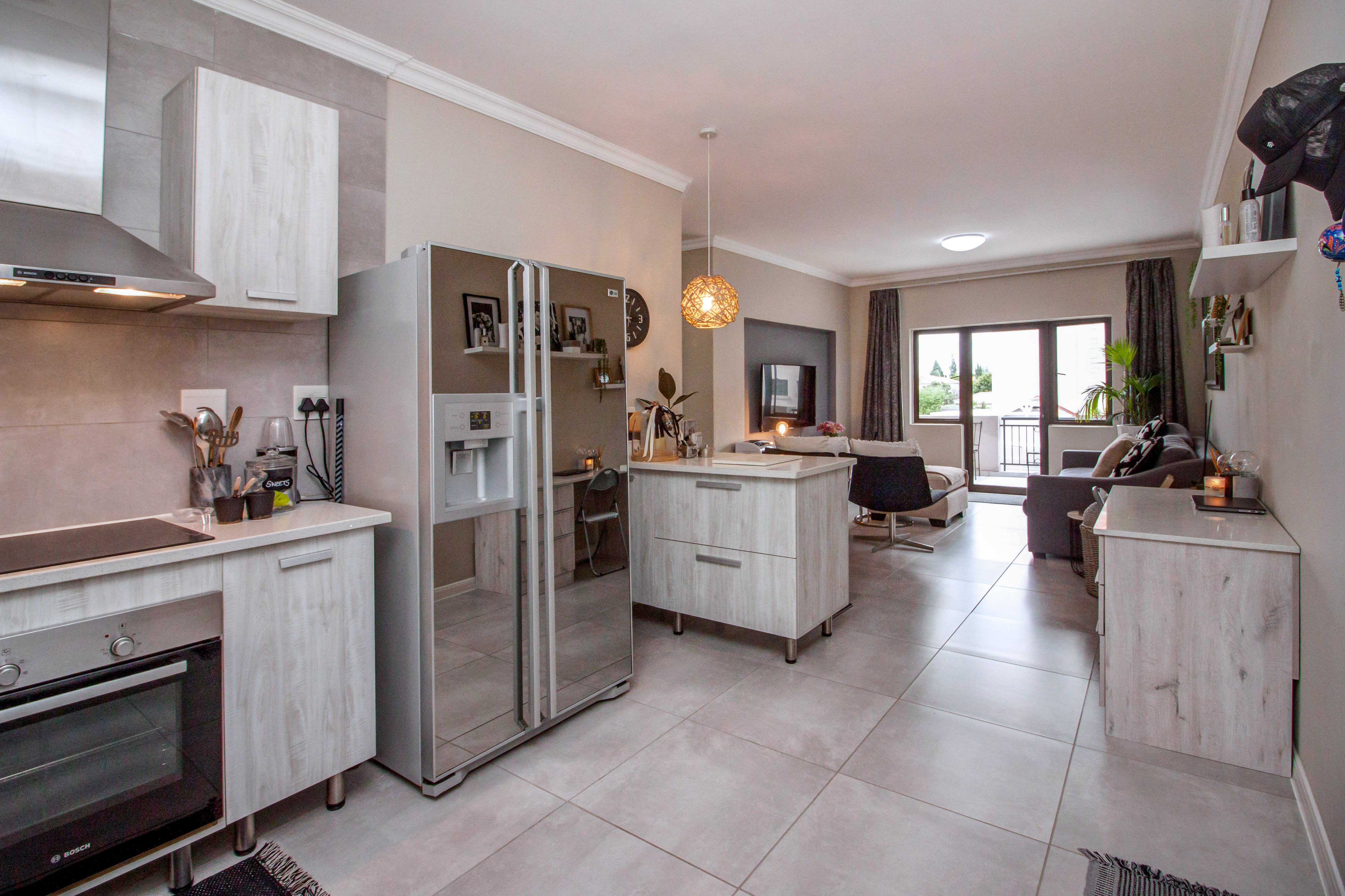 Modern, spacious, 2-bedroom, 2-bathroom apartment, well situated at the back of the complex. Top floor, corner unit, with only 1 neighbour and nobody above you, featuring: Open plan, fitted kitchen with Caesar Stone countertops and breakfast bar. Space for 2 undercounter appliances.
