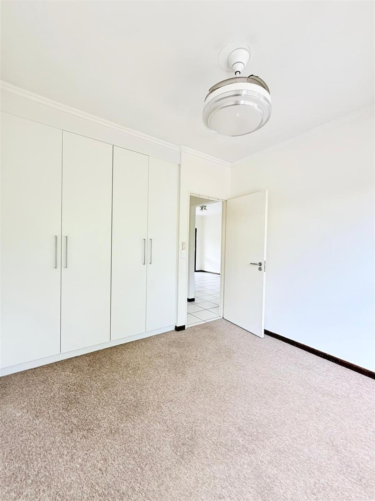 The apartment offers two spacious, fully carpeted bedrooms with built-in cupboards and plenty of natural light. The modern bathroom is fitted with both a bath and a shower.