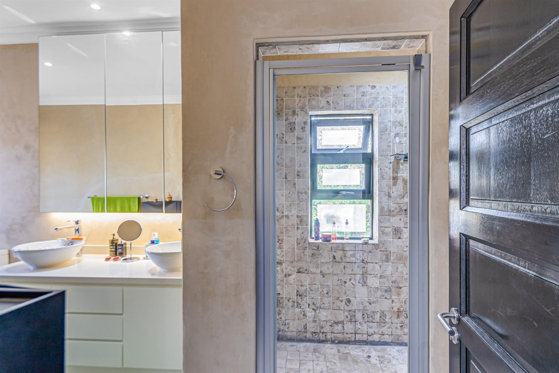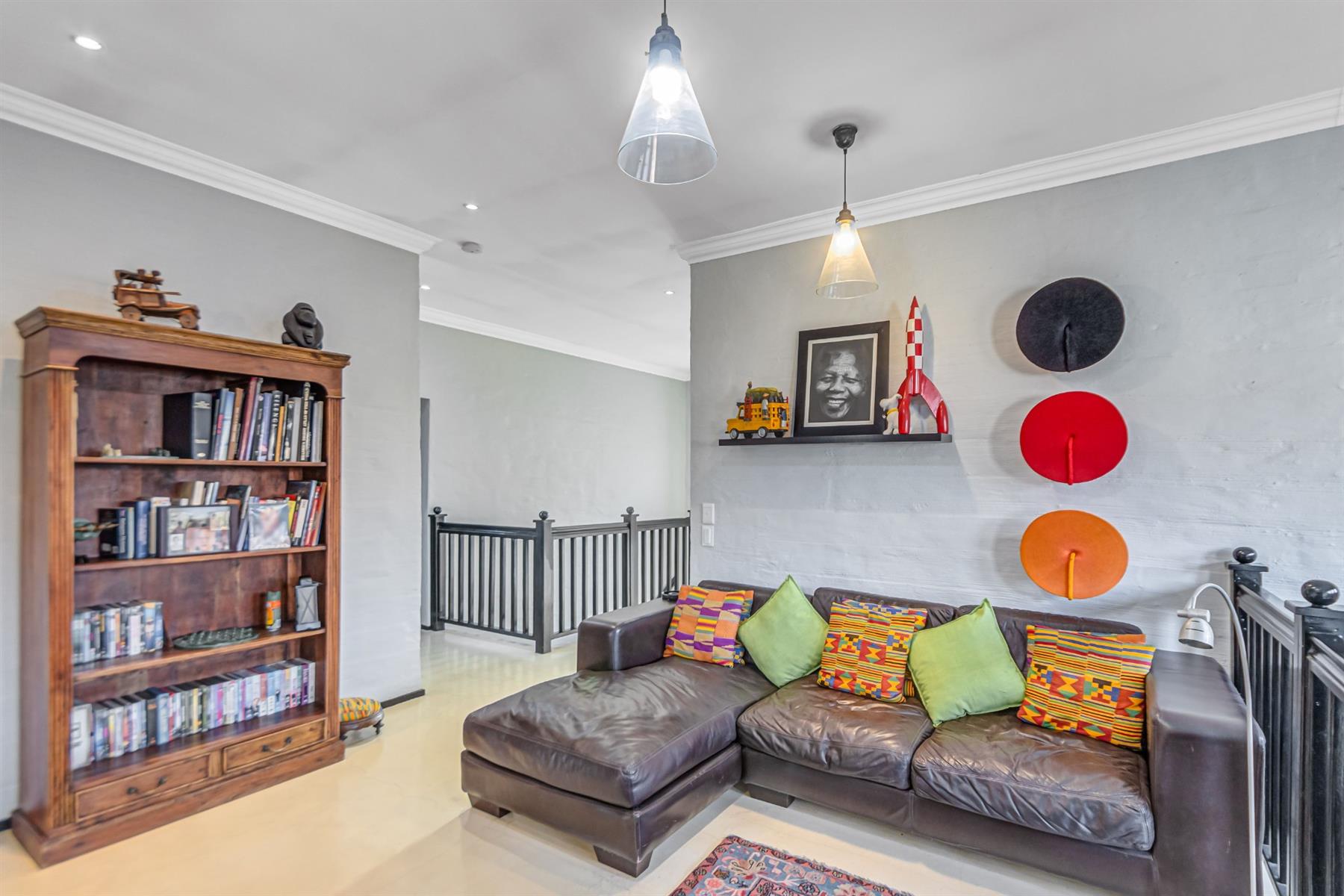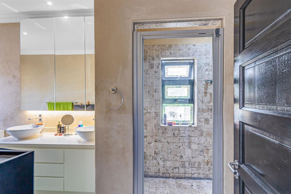 Upstairs, you’ll find three well-sized bedrooms, each with its own Juliet balcony. A spacious pajama lounge connects the rooms, offering a cozy family retreat or play space. The master bedroom is a serene haven, featuring air conditioning, ample cupboard space, and a luxurious full en-suite bathroom with double vanity. The second and third bedrooms share a full bathroom.