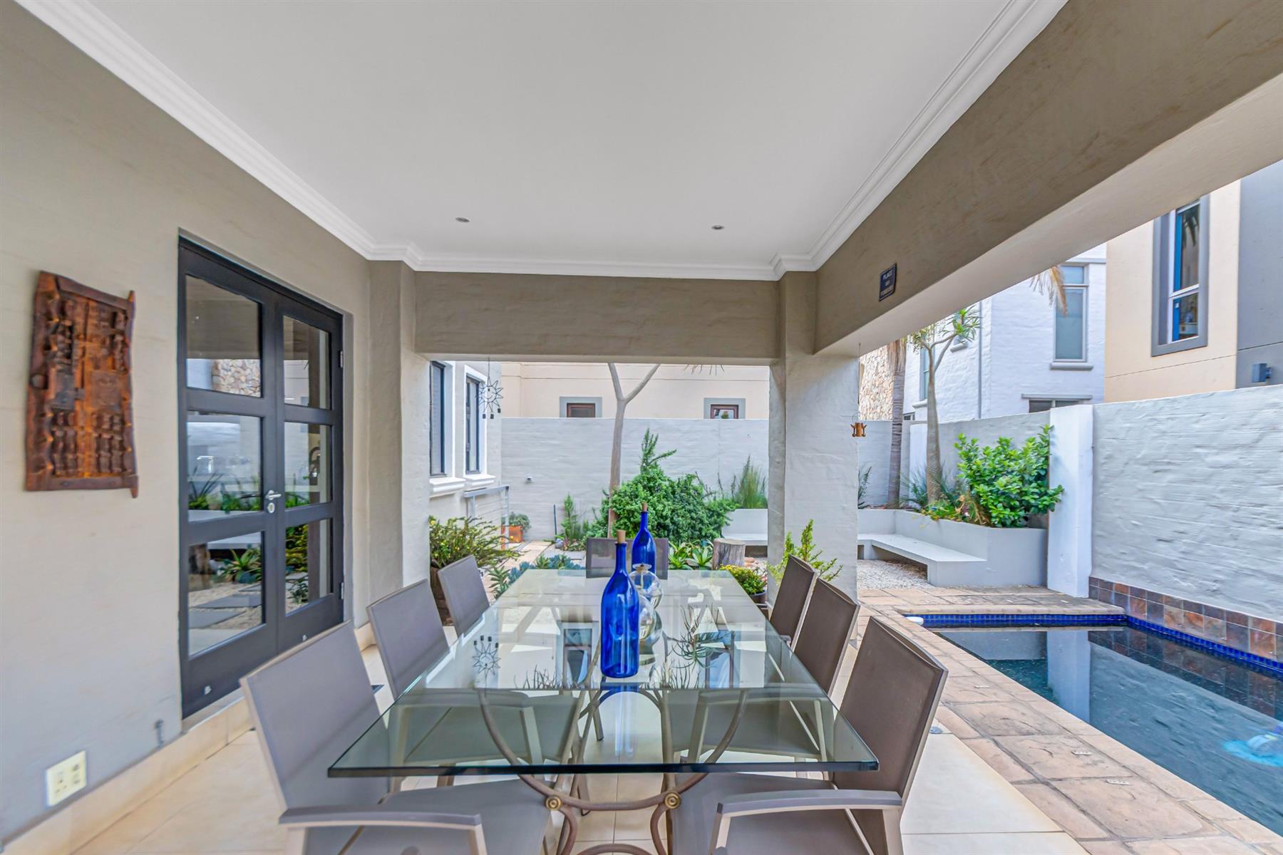 Glass doors open onto a covered patio, overlooking a solar-heated swimming pool and a low-maintenance garden filled with striking succulents — the ideal space for year-round relaxation and outdoor gatherings.