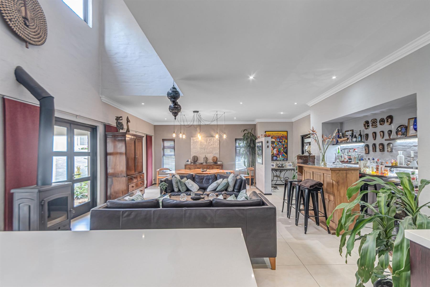 Step into a world of comfort and sophistication, where heated tiled flooring downstairs and solid wooden floors in the bedrooms create an inviting, stylish ambiance. The spacious open-plan living areas are ideal for entertaining, featuring a built-in bar on one side and a wood-burning fireplace on the other — bringing warmth and charm to winter evenings.