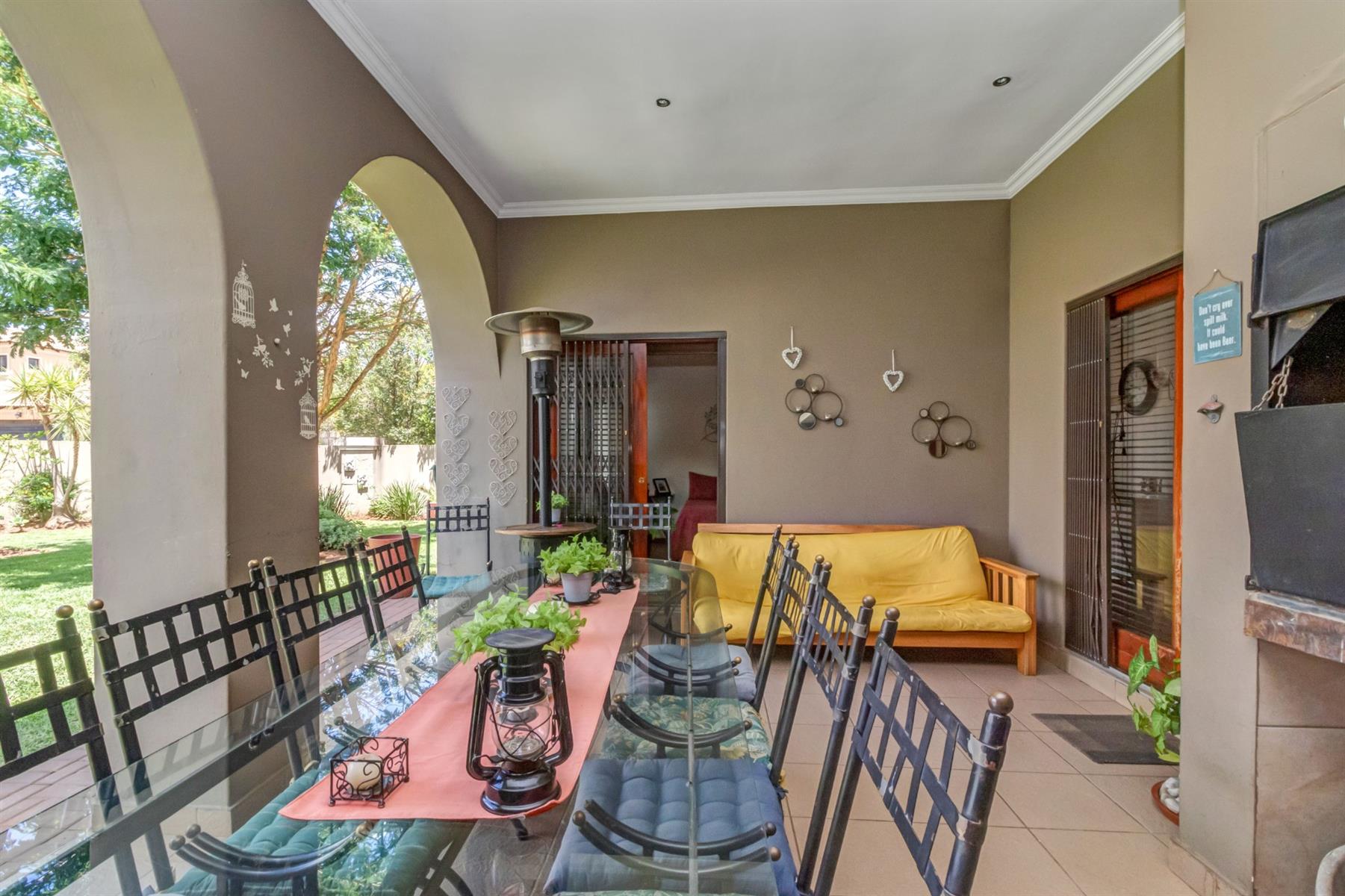 This family home offers entrance hall that leads to living areas consisting of formal lounge, open-plan dining and tv area, both with air-conditioning. Living areas all lead onto a large undercover patio with a built-in braai flowing onto large garden and sparkling pool, ideal for entertainment and relaxation.