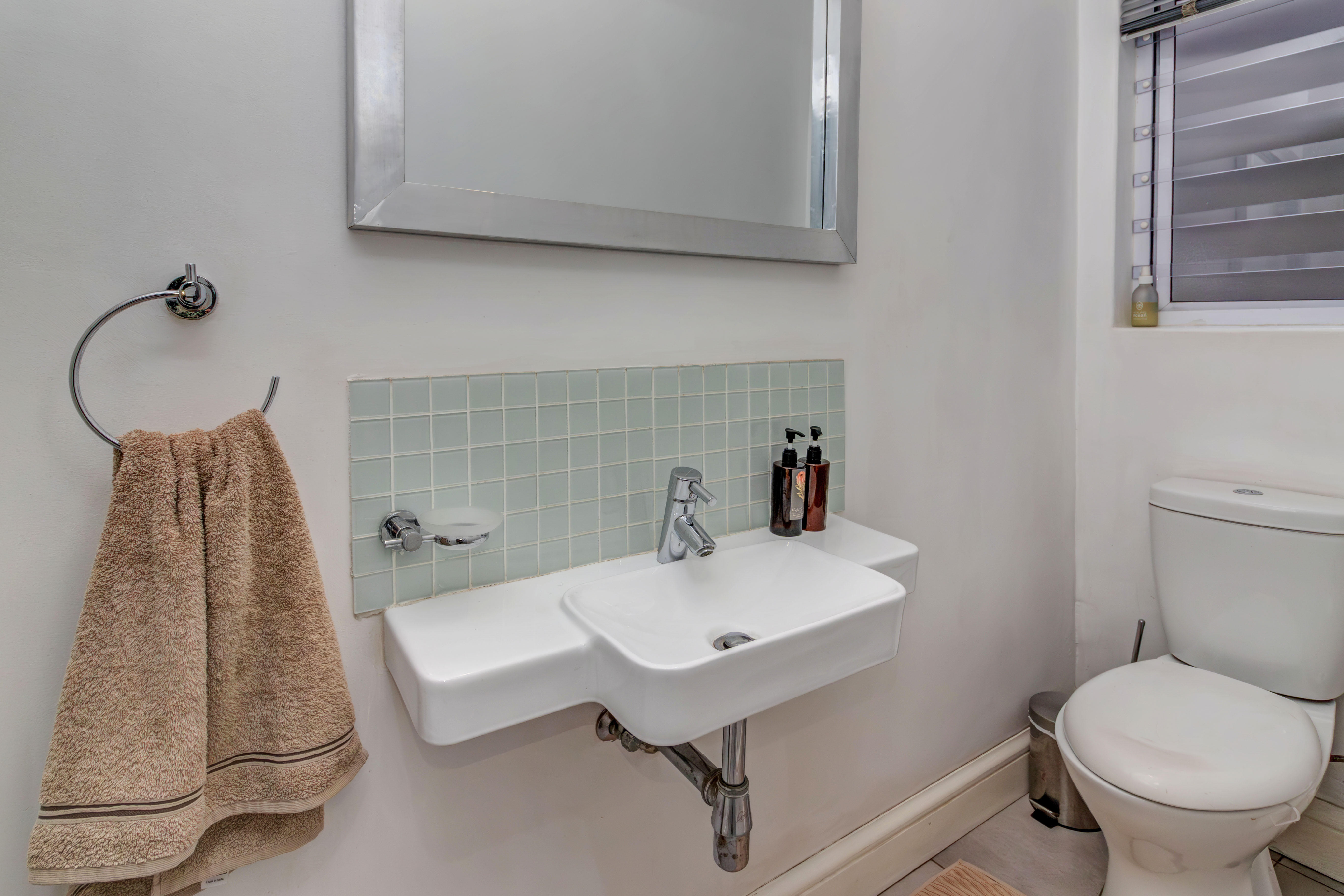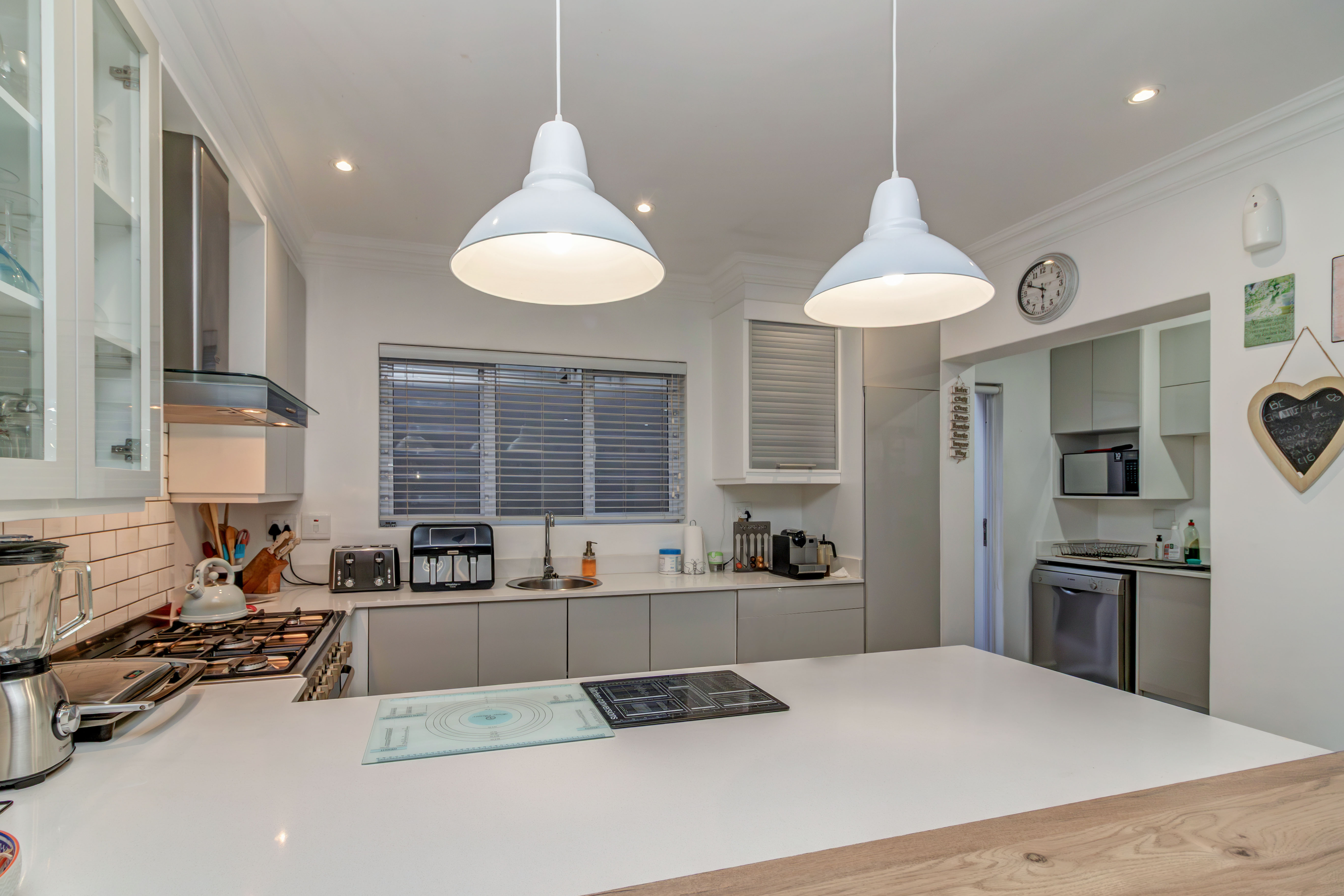 The newly renovated kitchen features Caesarstone countertops, a gas hob, electric oven, breakfast bar, and plenty of storage, with a convenient scullery. The air-conditioned living spaces offer year-round comfort, while a cozy gas fireplace adds warmth in the colder months. Aluminum stacking doors open to an outdoor entertaining area with a covered louvre patio, lush garden, solar-heated pool, outdoor shower, and fire pit—perfect for both relaxation and hosting.