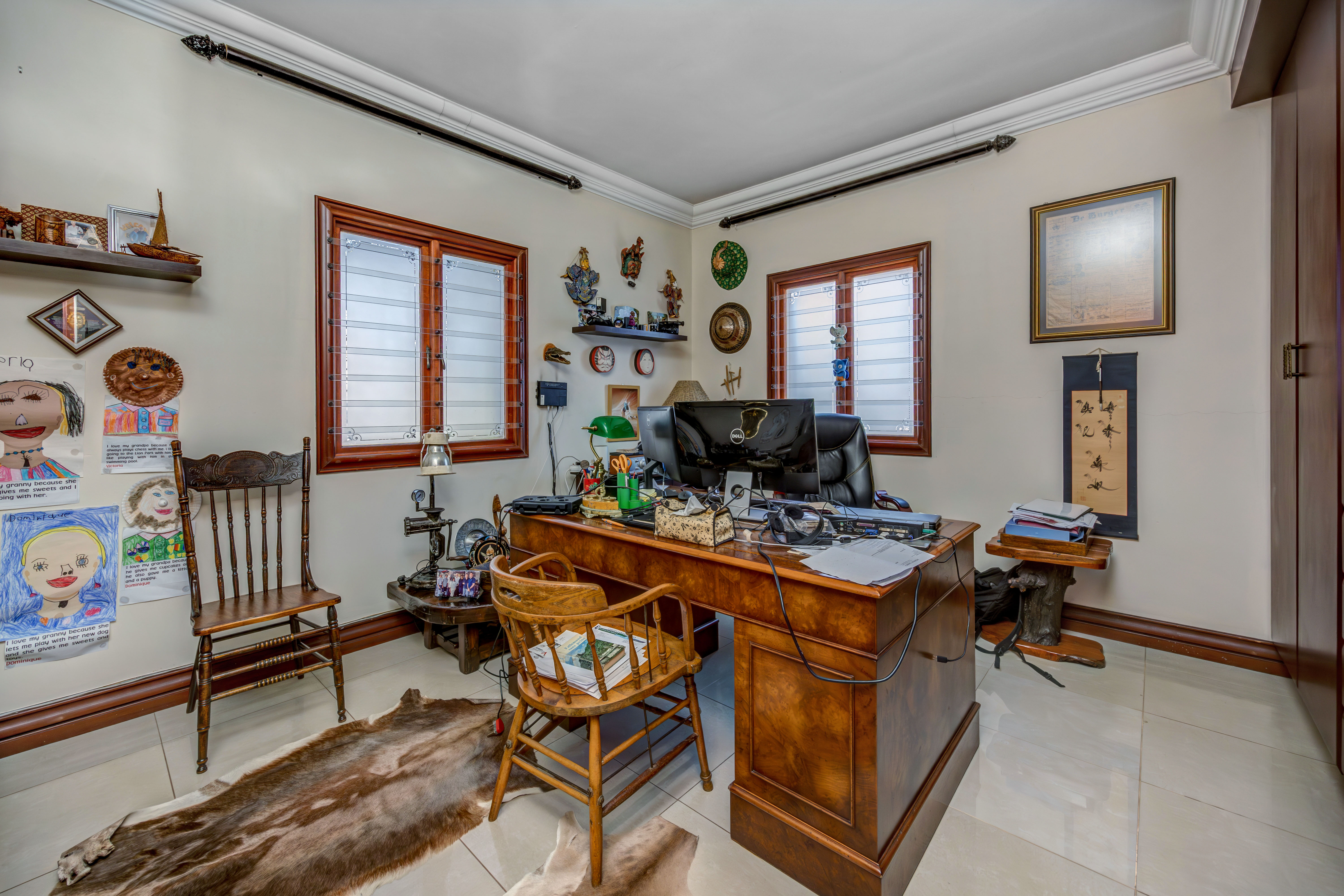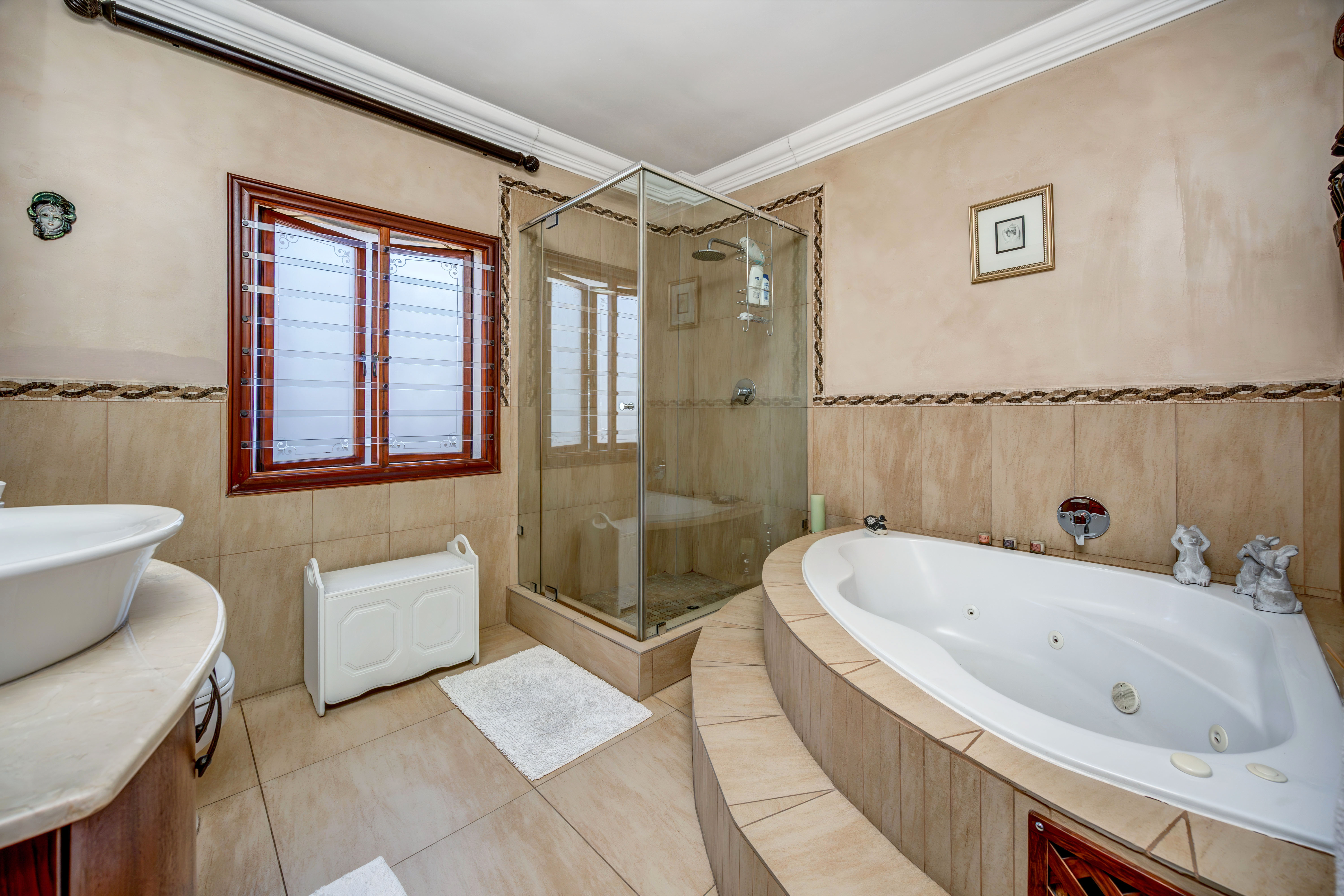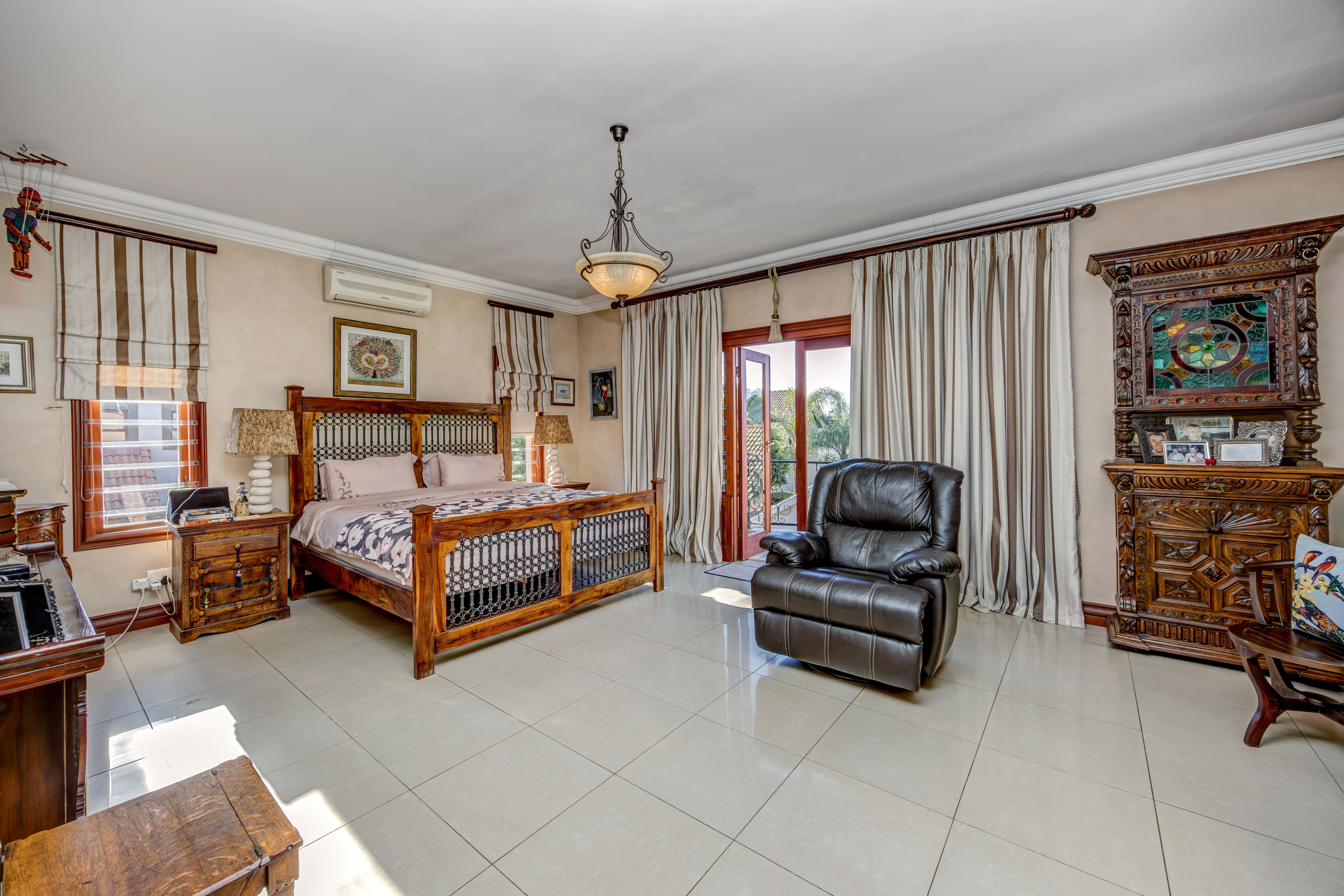 Upstairs, four spacious bedrooms offer teak cupboards and three stylish bathrooms, two en-suite. The main suite has air conditioning, a full en-suite bathroom, and a walk-in closet.