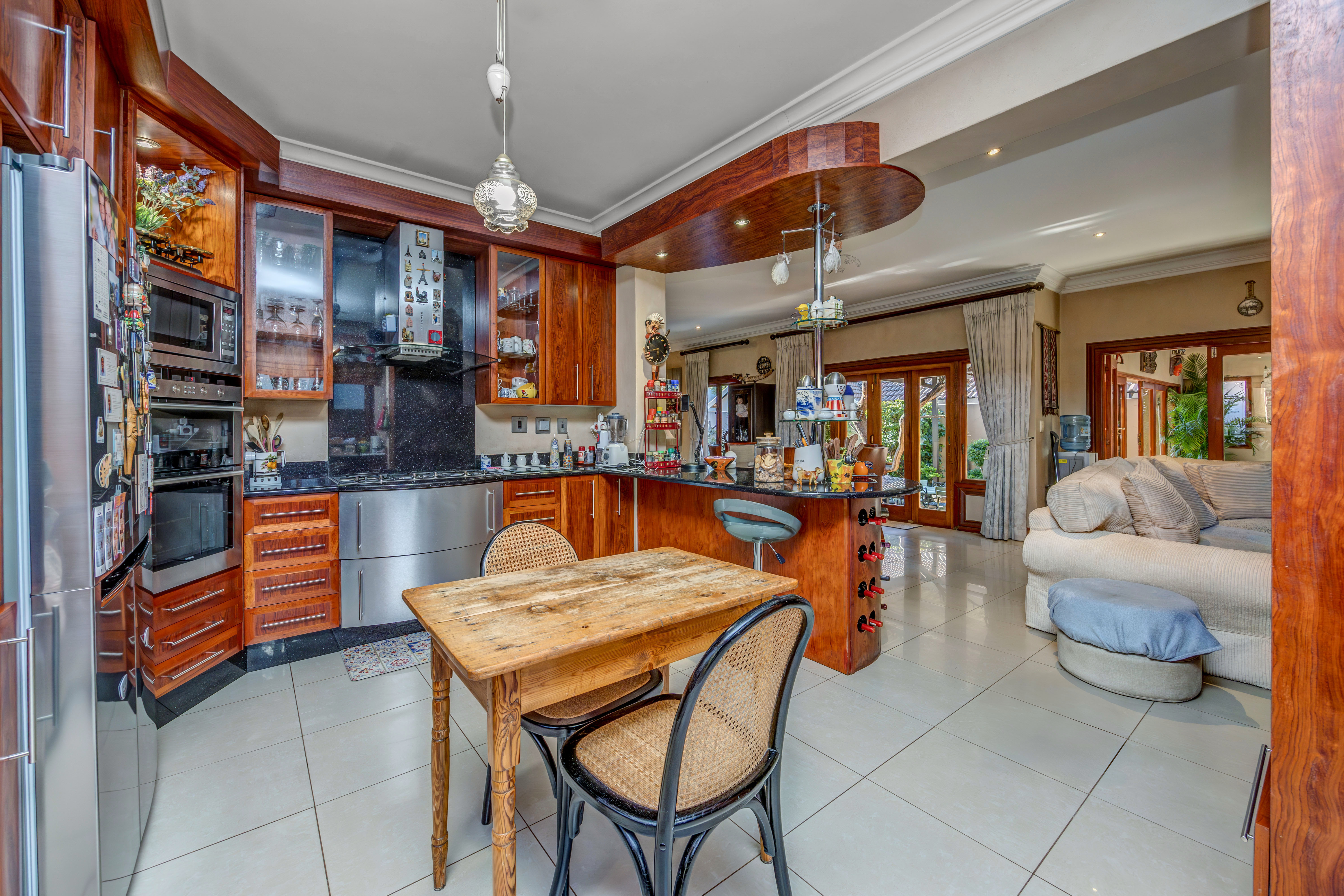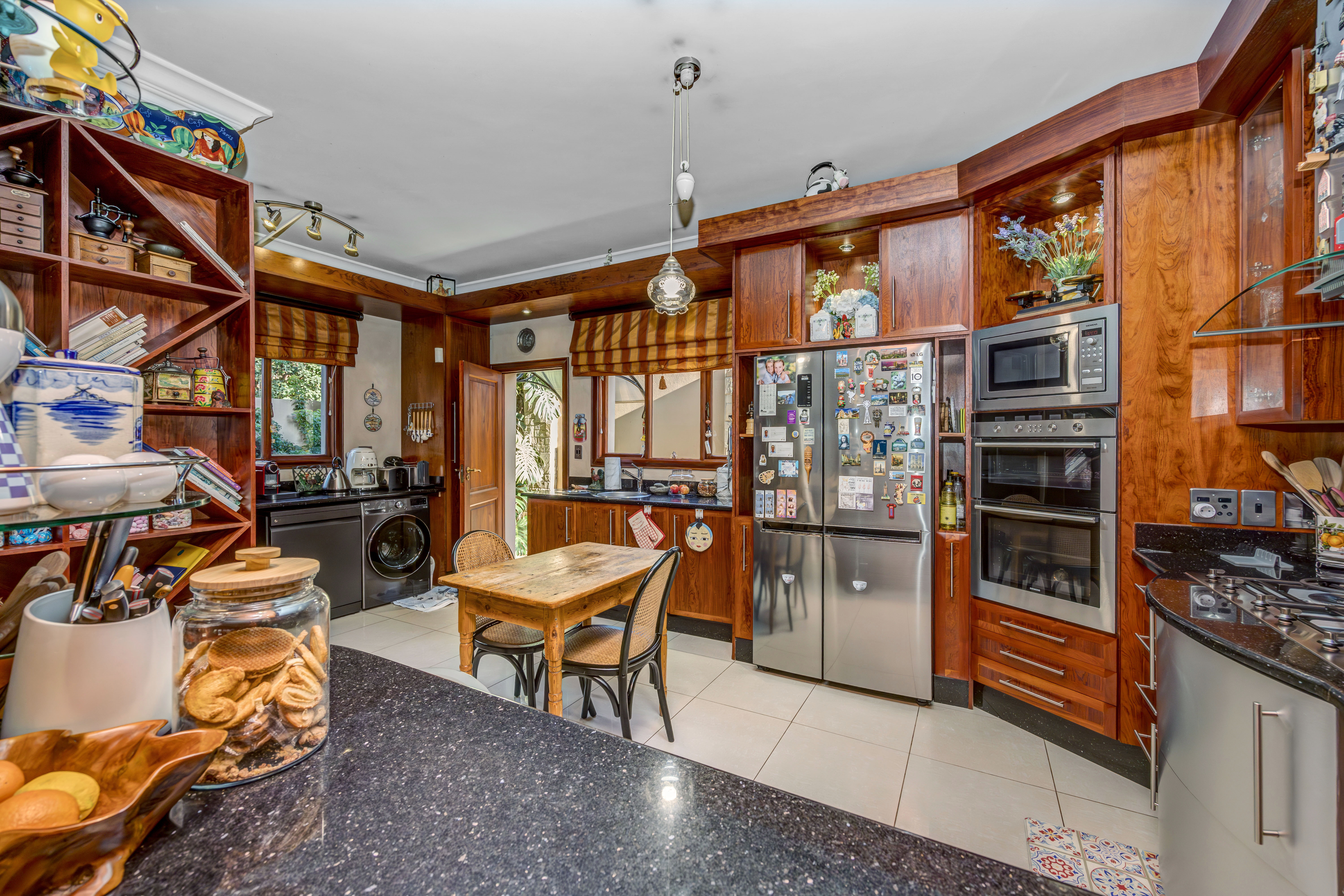 The designer kitchen features granite countertops, a five-plate Smeg gas hob, double eye-level oven, built-in microwave, space for a double-door fridge, and a scullery with room for two plumbed appliances.