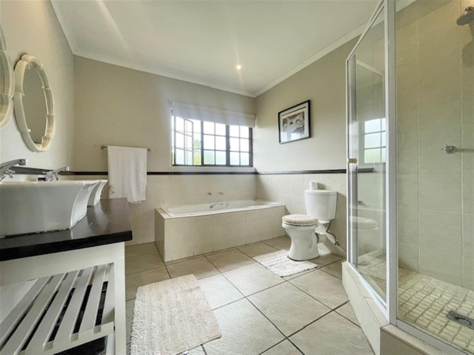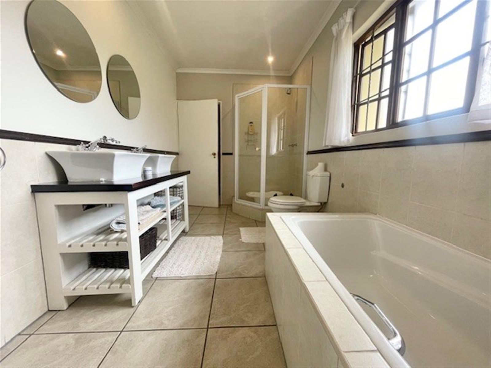 Upstairs, the home offers three well-proportioned bedrooms, with the main bedroom enjoying an en-suite bathroom with private patio, and ample built-in-cupboard space. An additional full bathroom services the remaining two bedrooms. There is also a separate space, separating the two bedrooms, ideal for either a TV lounge or study area.