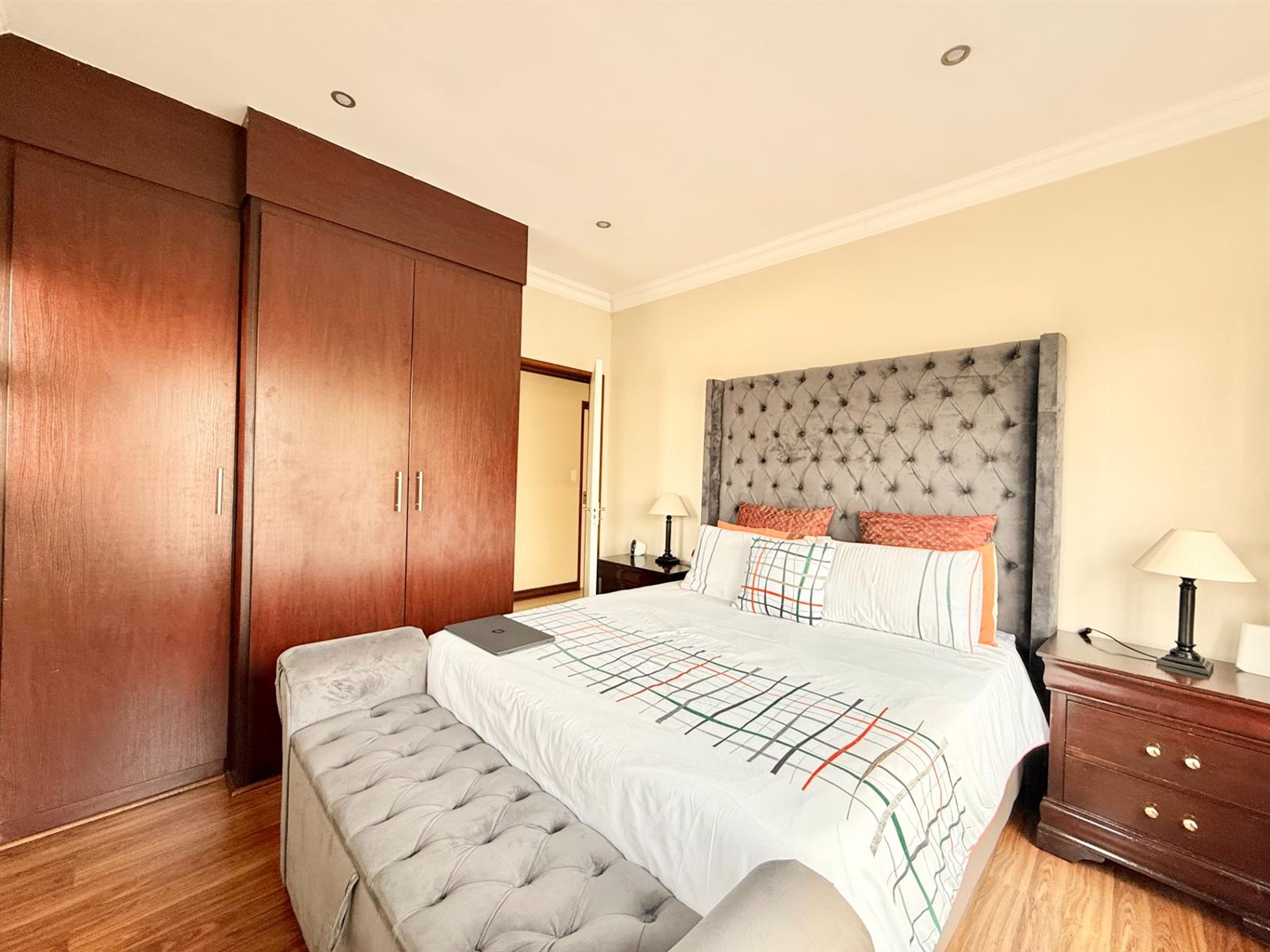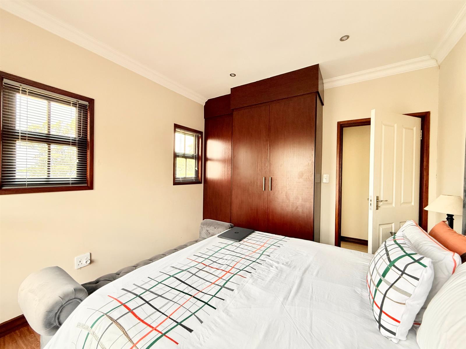 Upstairs, there are 3 spacious bedrooms, each with built-in cupboards and laminated flooring.
