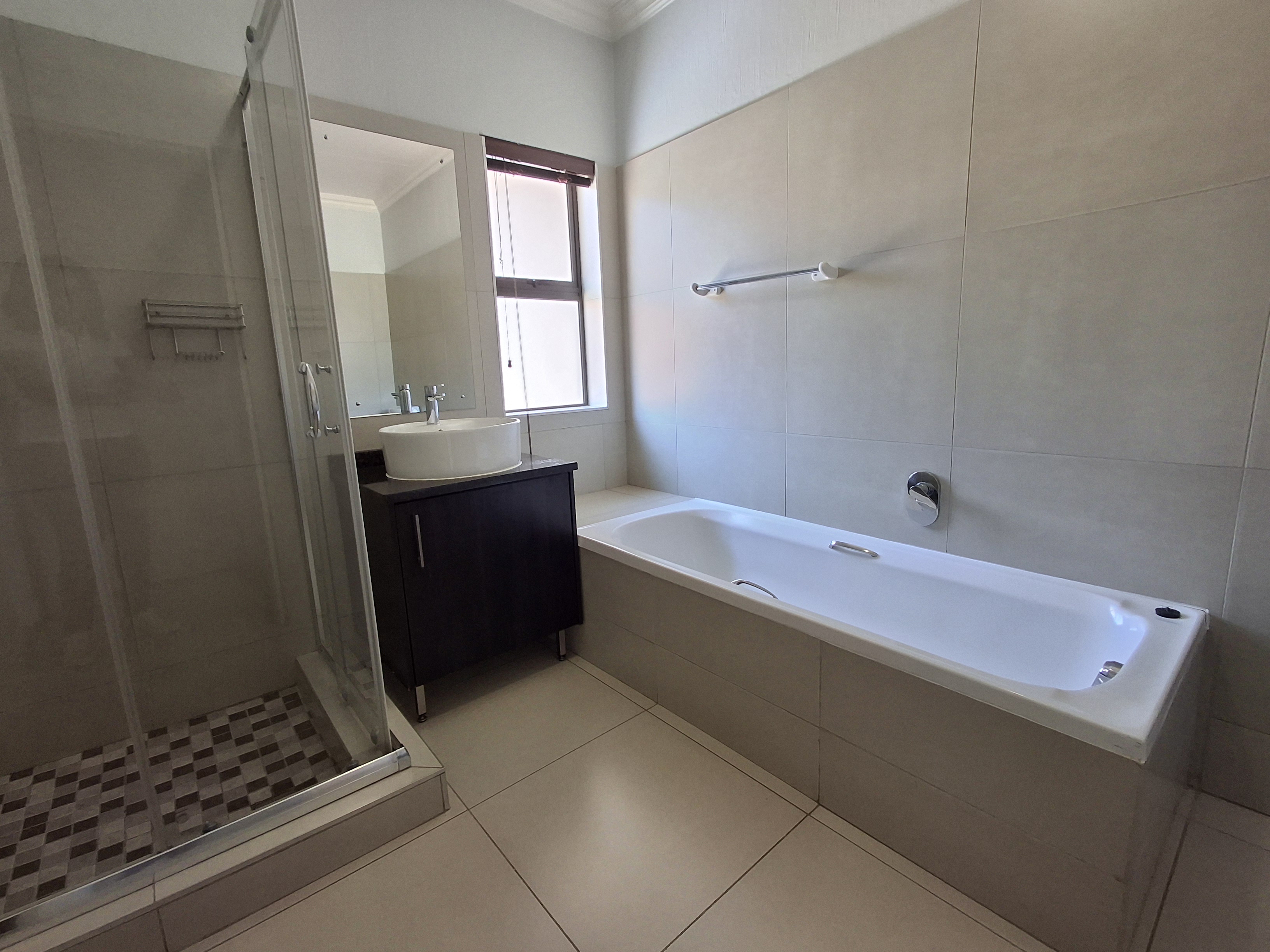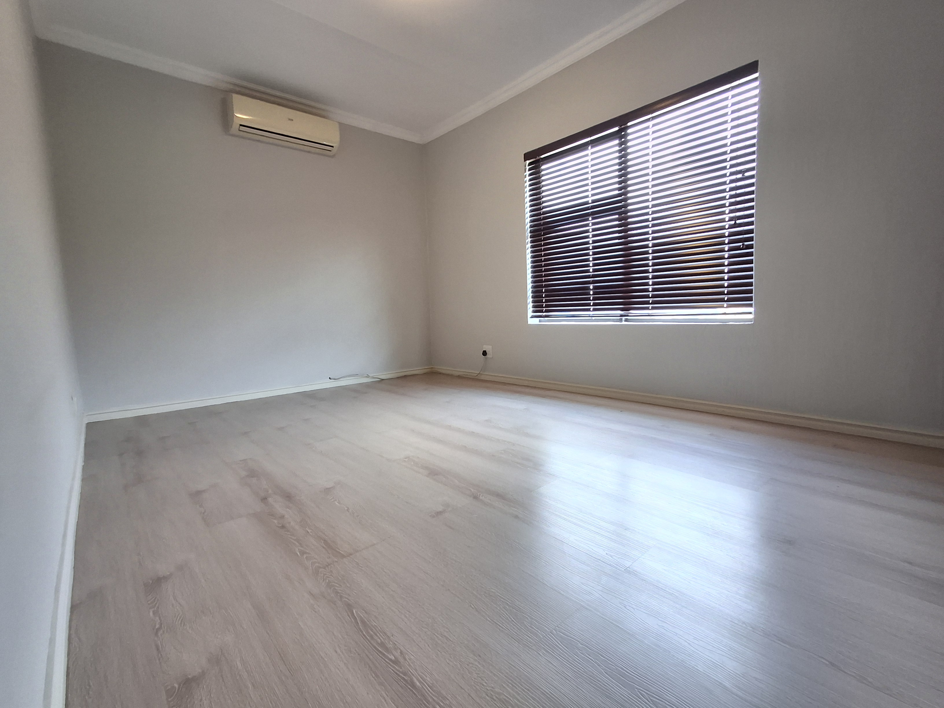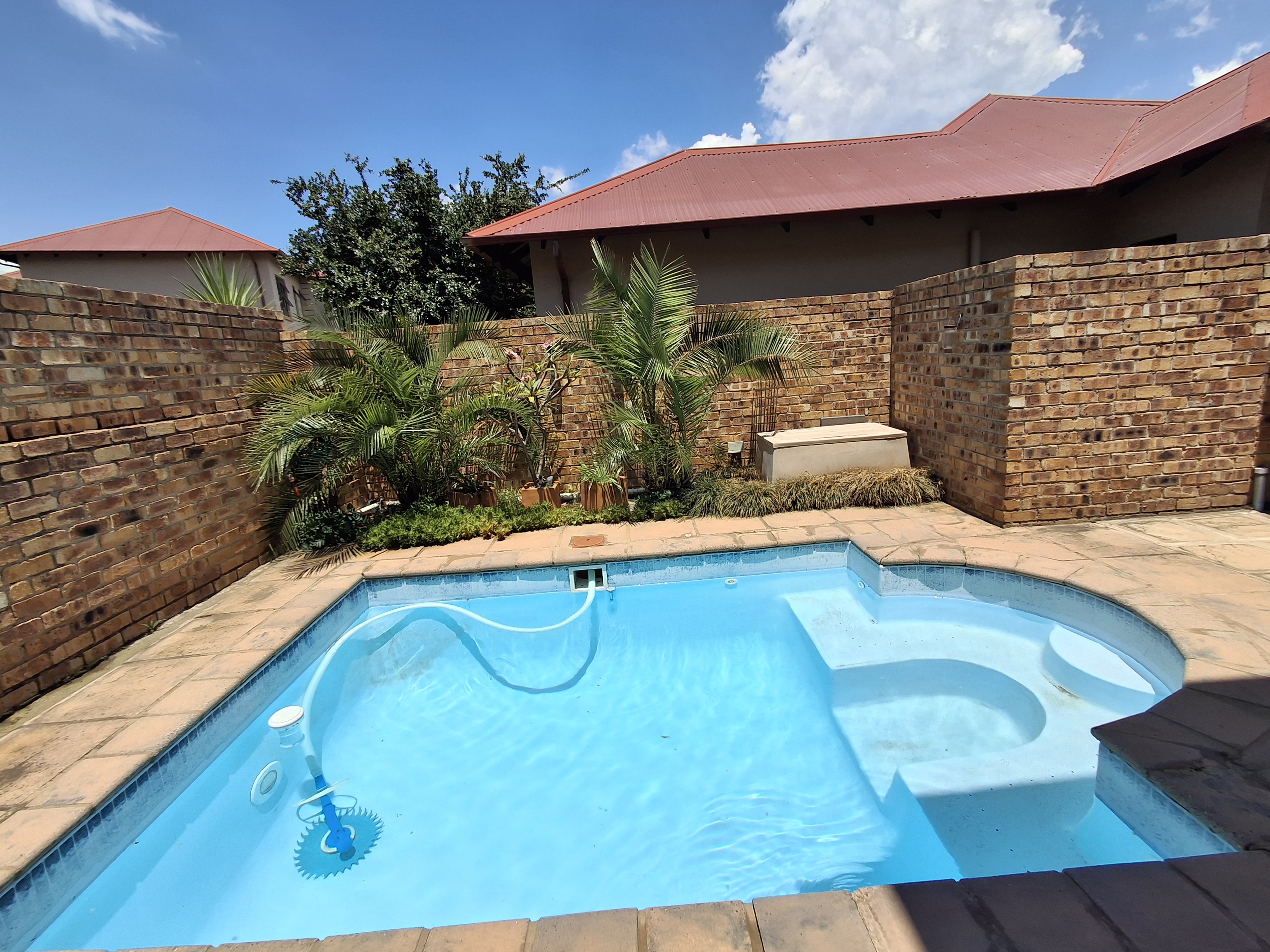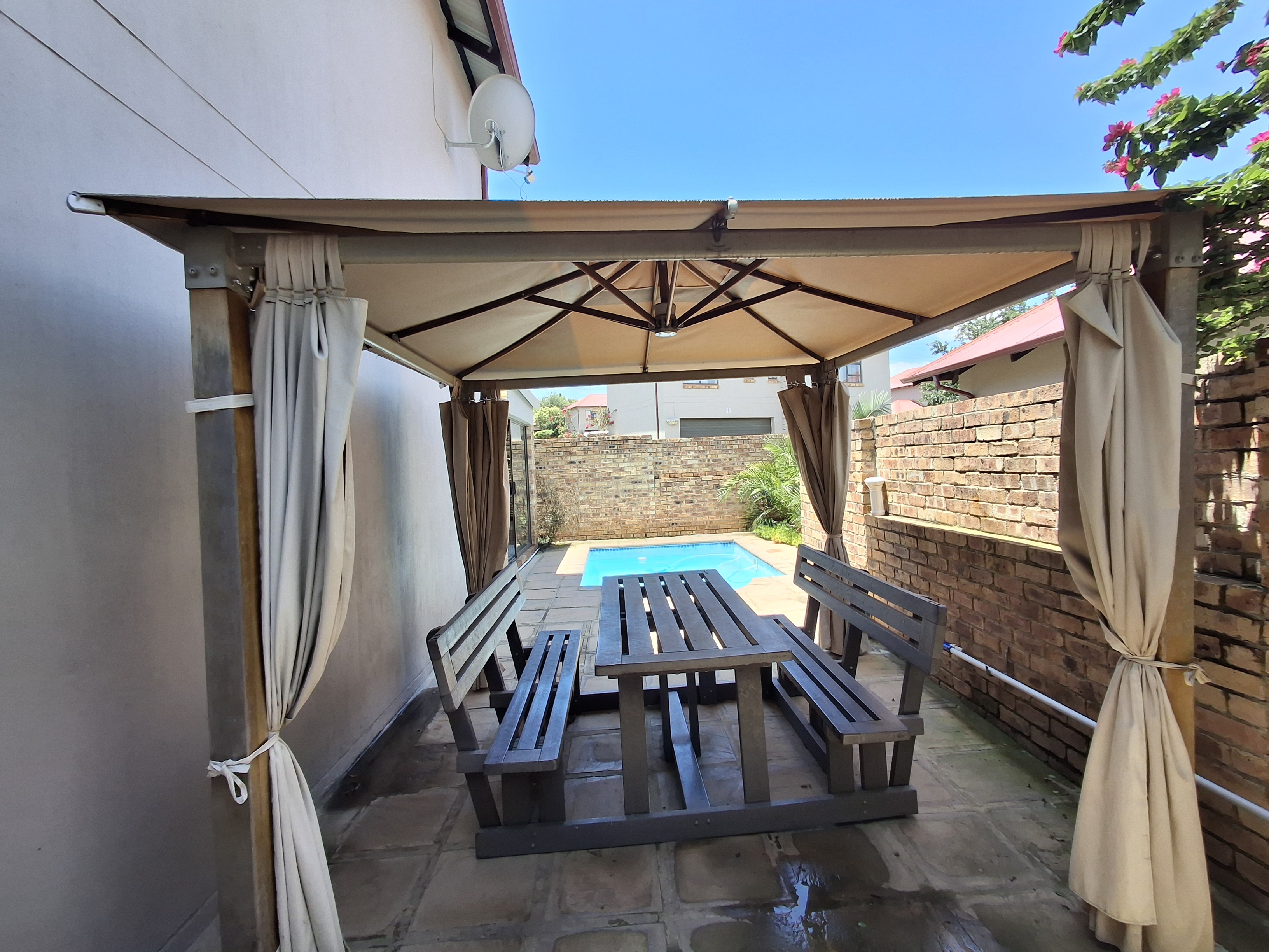 Upon entering, you’re greeted by a bright, open-plan living area with impressive high ceilings that create a sense of space and elegance. A large glass sliding door opens into a fully enclosed entertainment room featuring a built-in braai, ideal for hosting guests year-round. From the entertainment room, another glass sliding door leads directly to the sparkling pool area, where you’ll also find a charming gazebo complete with built-in seating—perfect for relaxed outdoor gatherings.