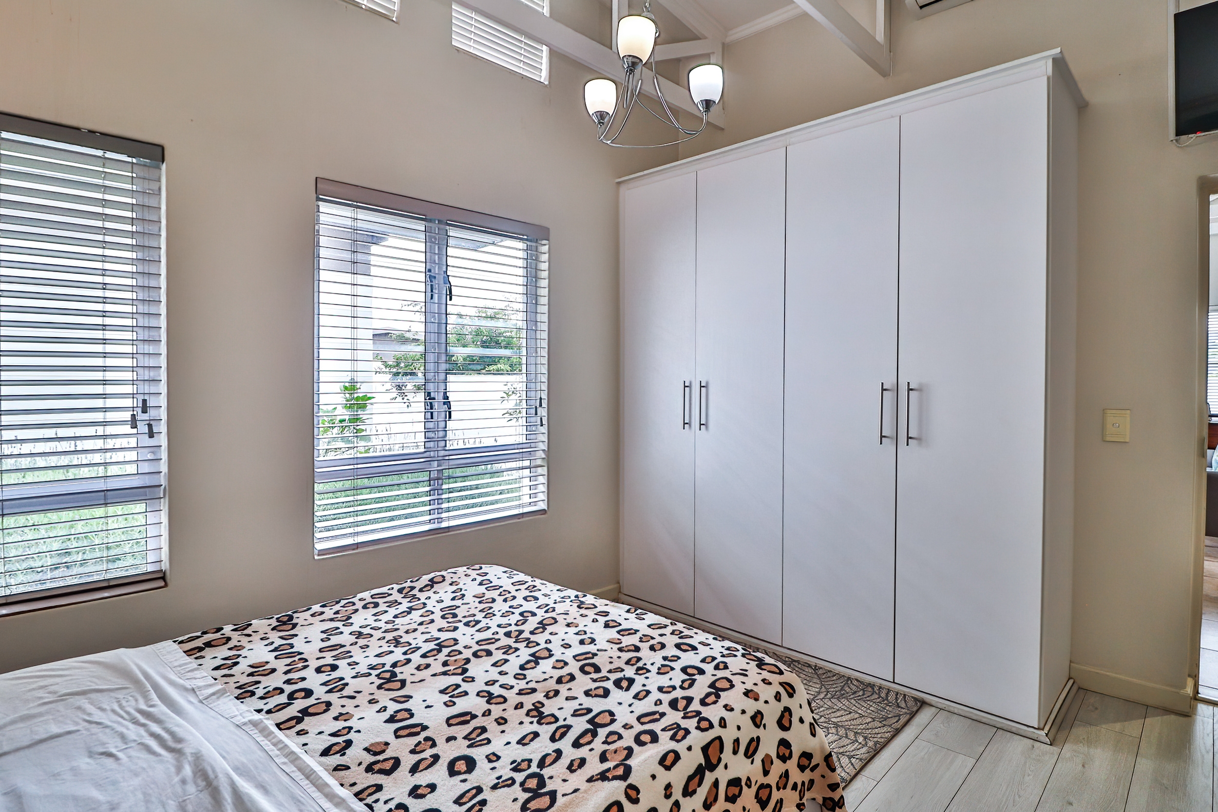 The kitchen is spacious with lovely cupboards as well as a gas hob and electric oven. There are 2 undercounter spaces for appliances.