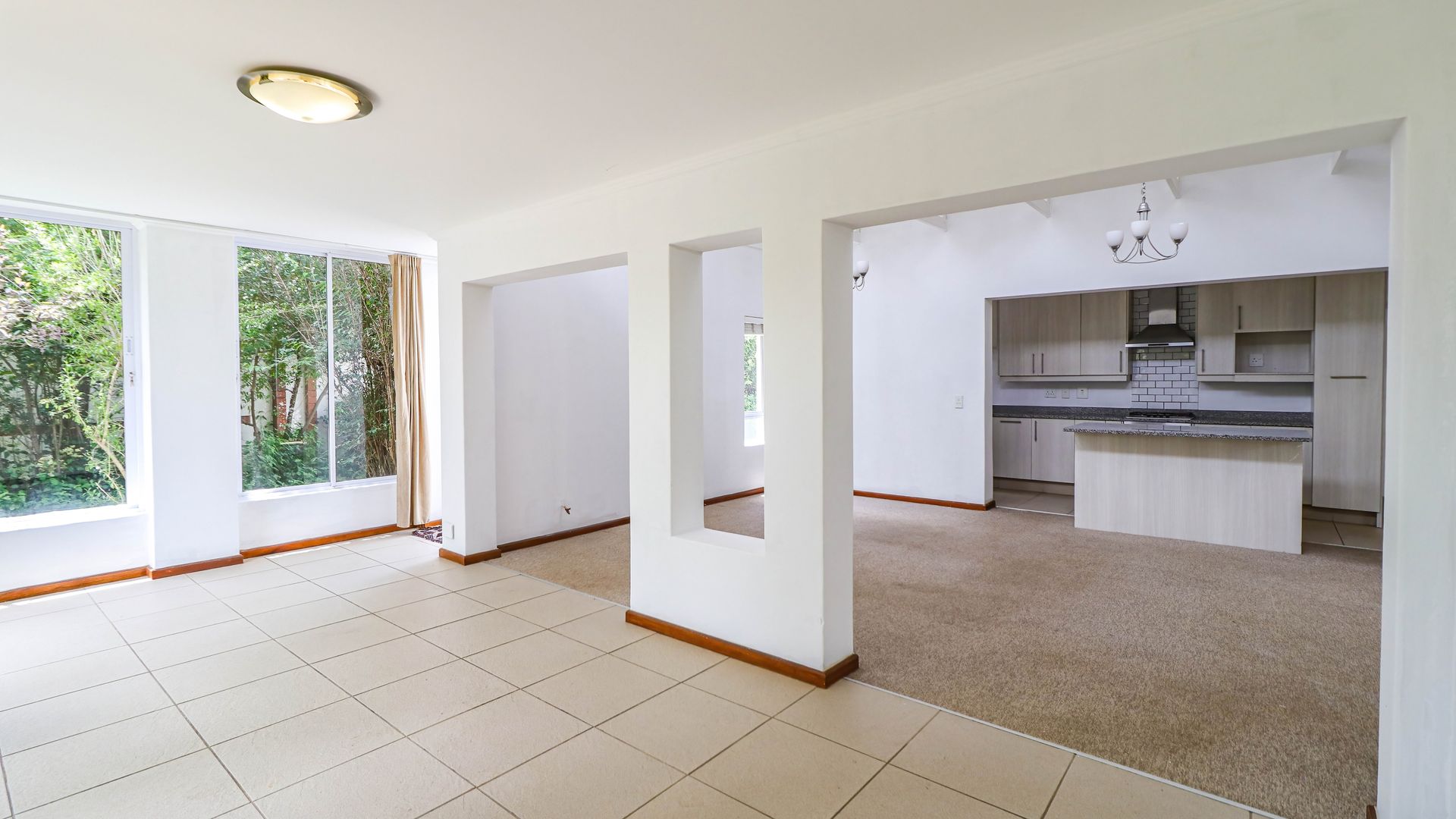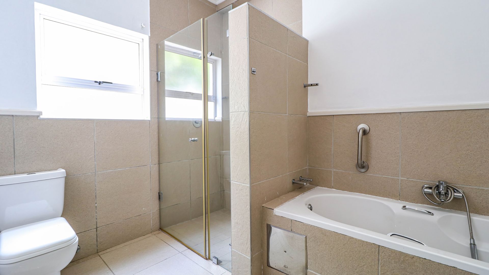 There are three bedrooms with plenty of cupboards and are all light and airy. The two bathrooms are spacious with one being an en suite and has a shower and tub. The second bathroom has a shower.