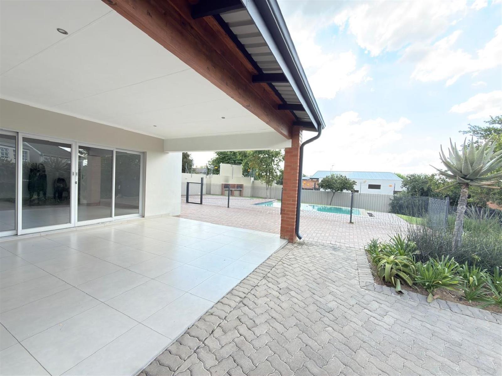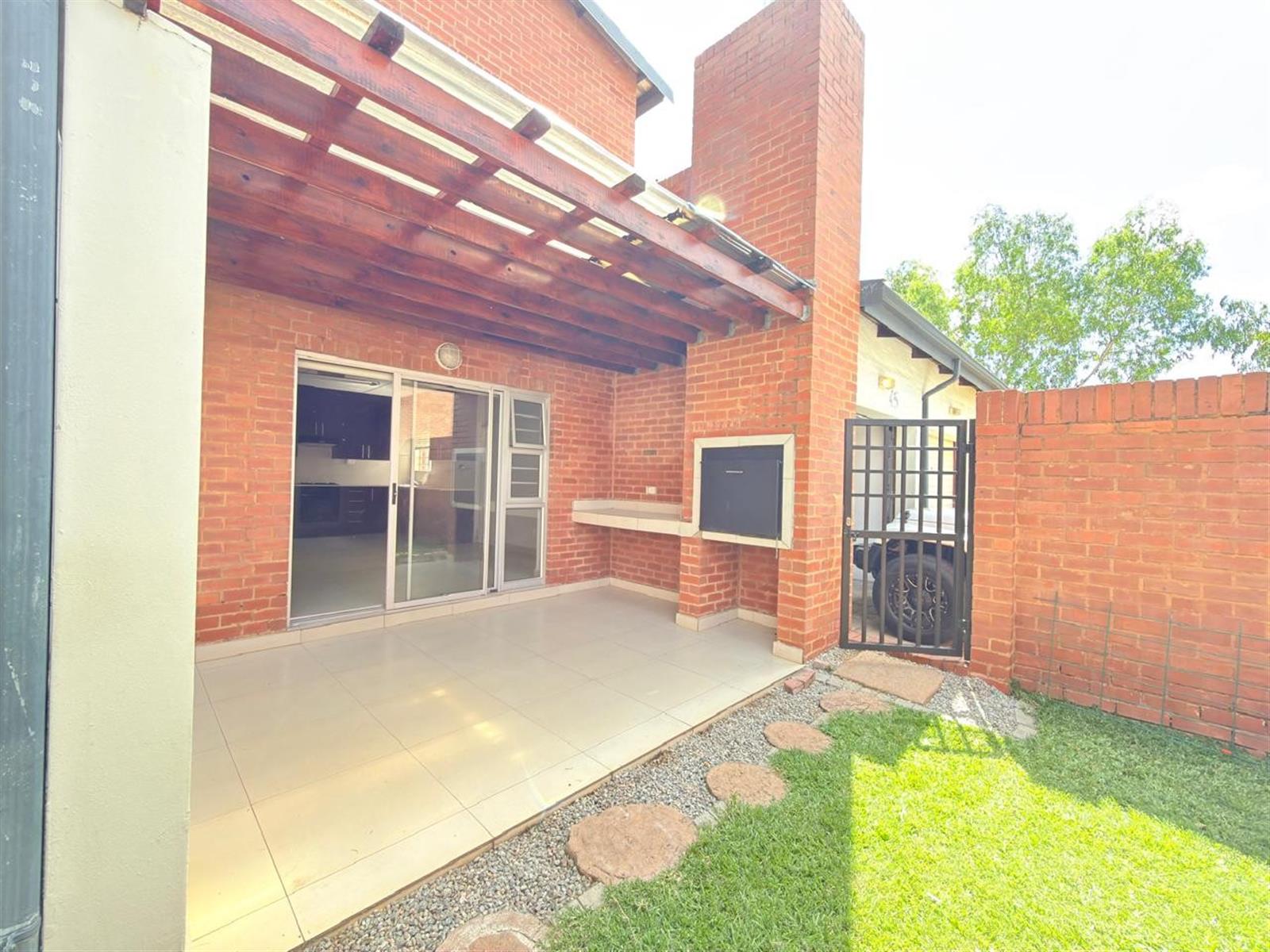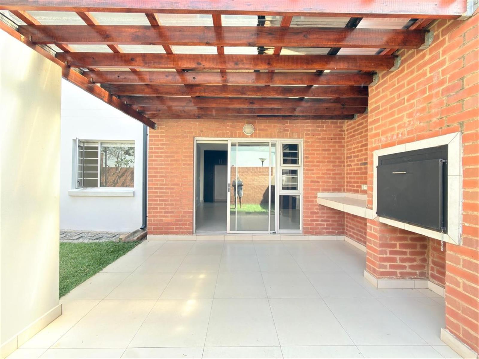 The living space opens through sliding doors onto a large, covered patio with a built-in braai, overlooking a private garden, perfect for entertaining or relaxing.