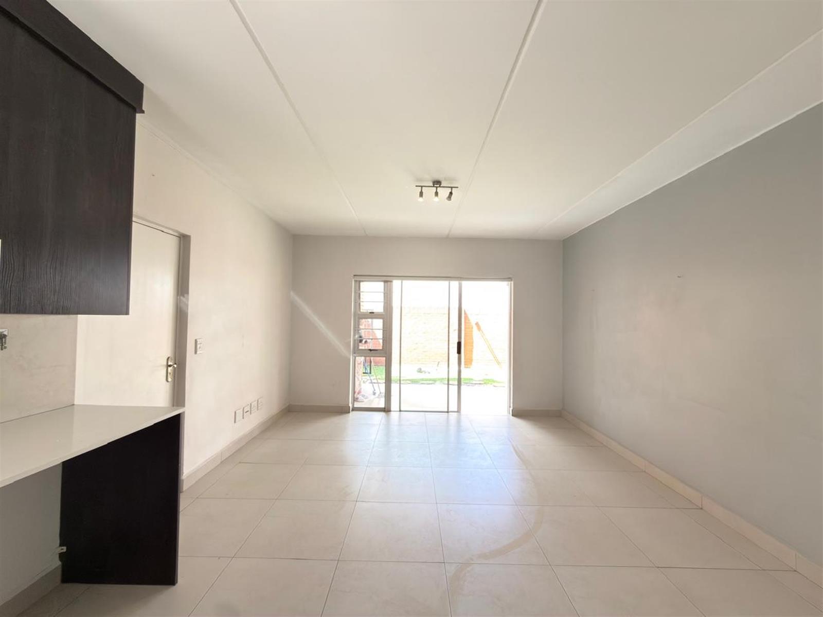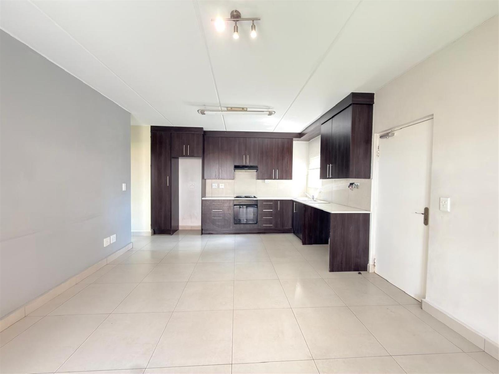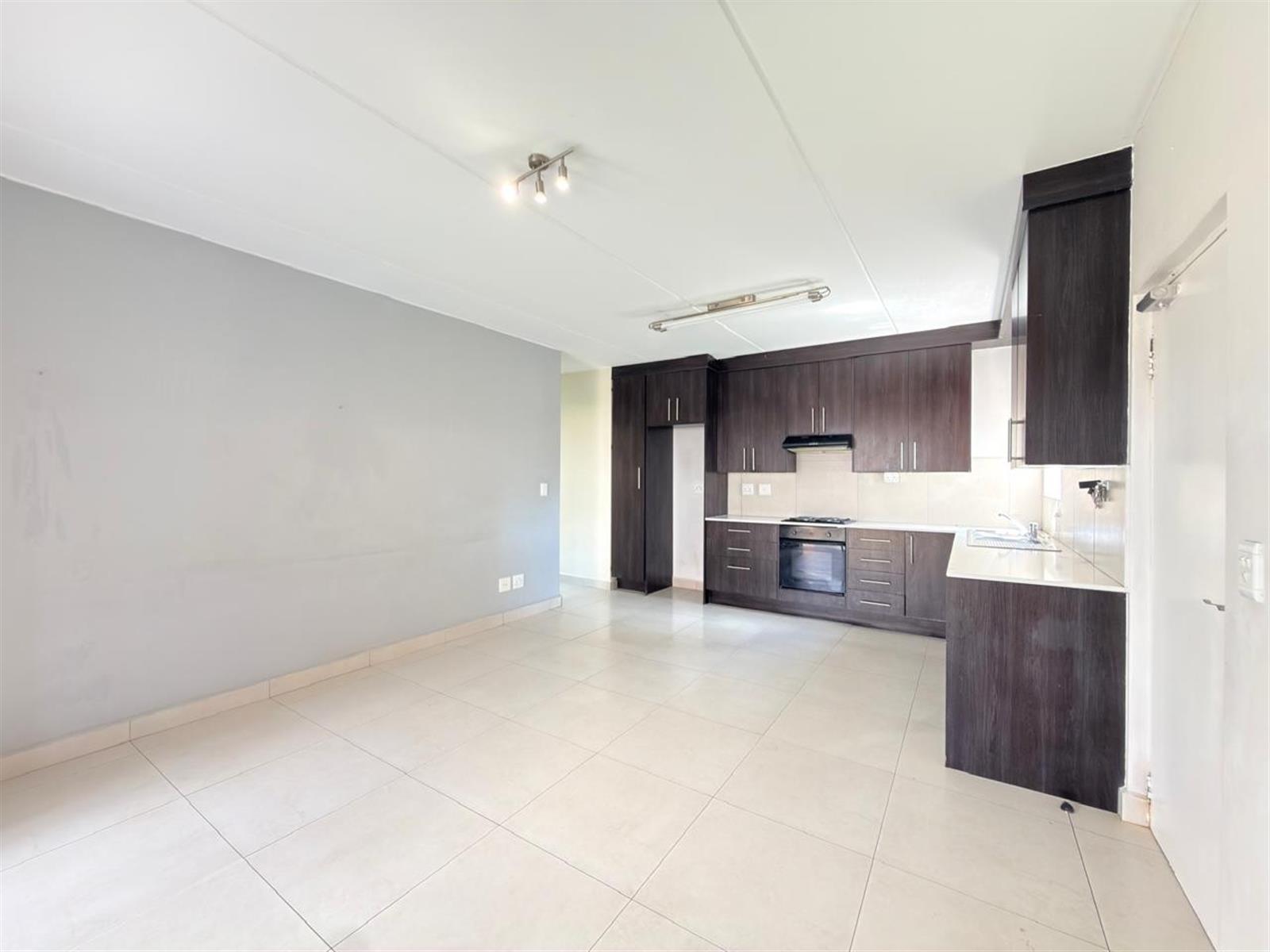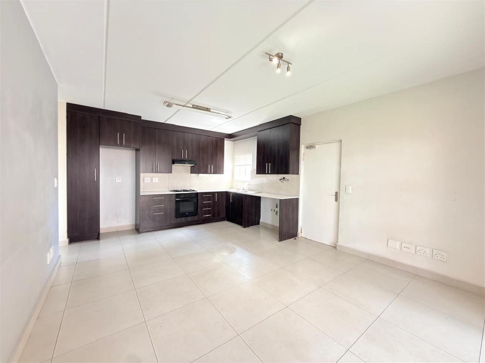The open-plan kitchen offers ample cupboard space and is designed to accommodate two under-counter appliances and a single-door fridge, flowing seamlessly into the living area.