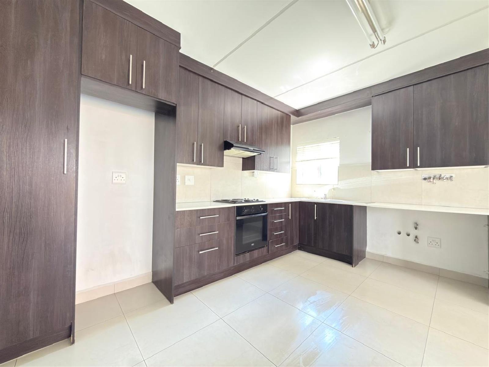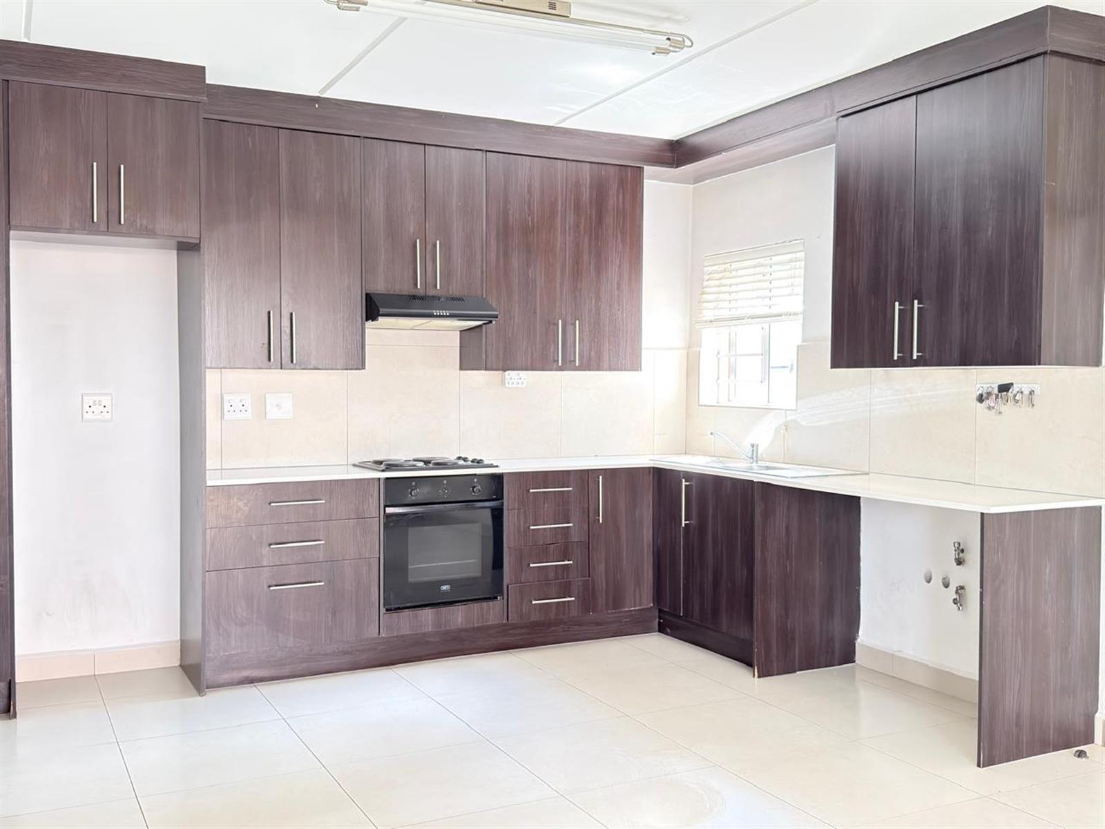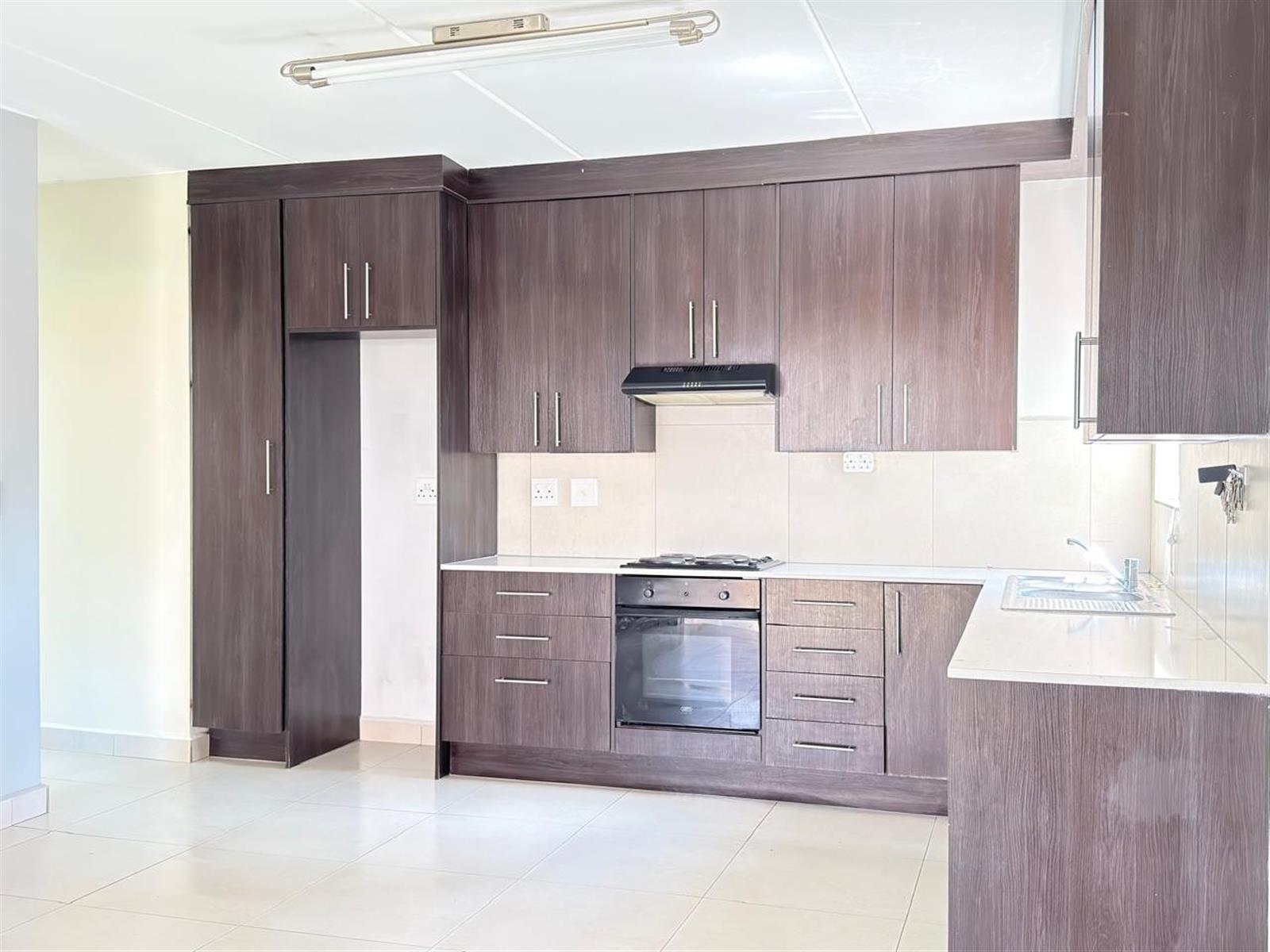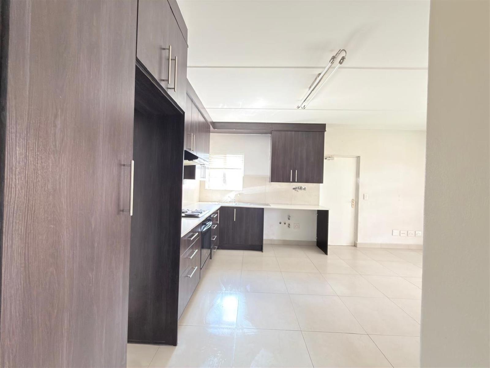 The open-plan kitchen offers ample cupboard space and is designed to accommodate two under-counter appliances and a single-door fridge, flowing seamlessly into the living area.