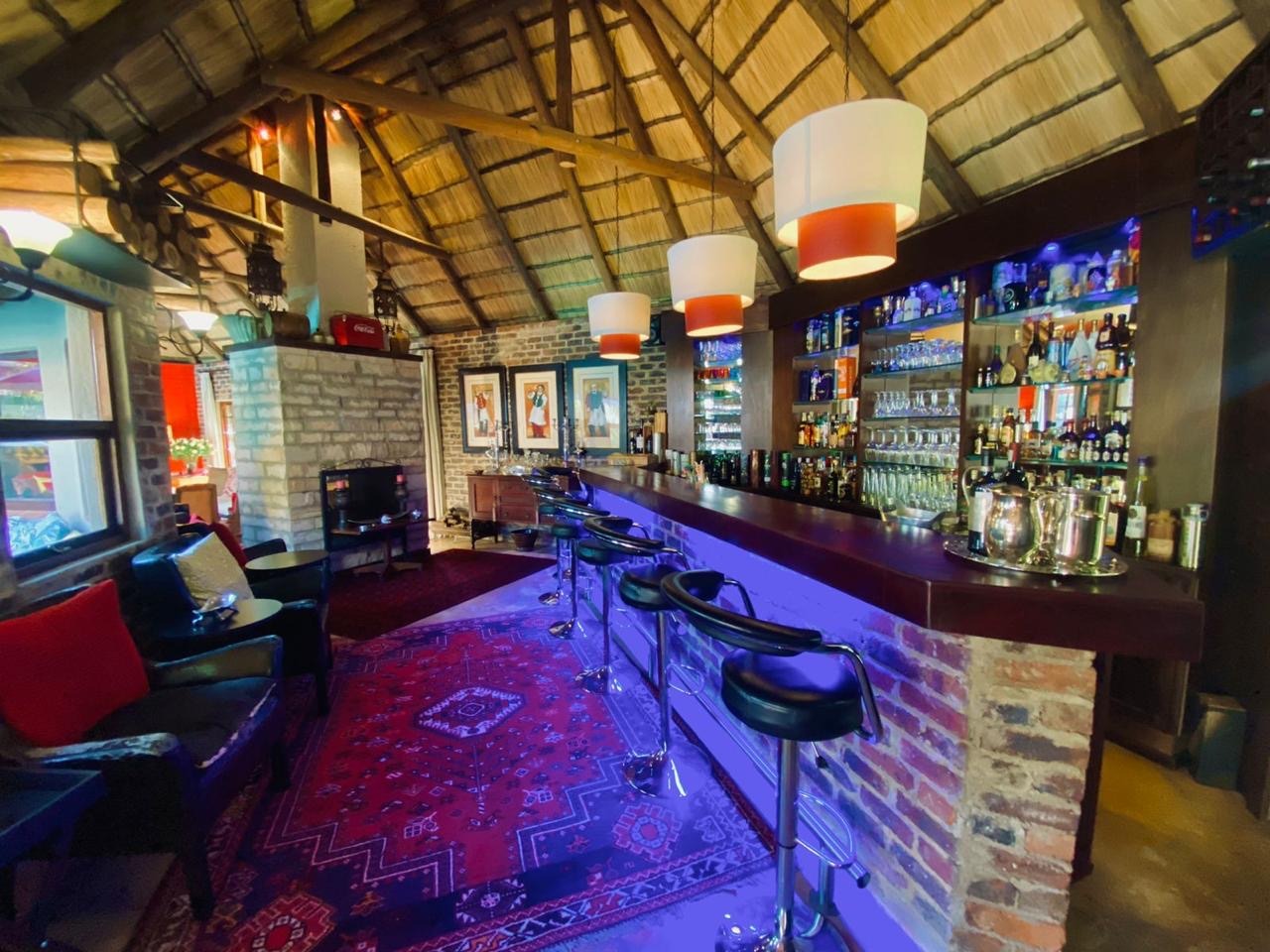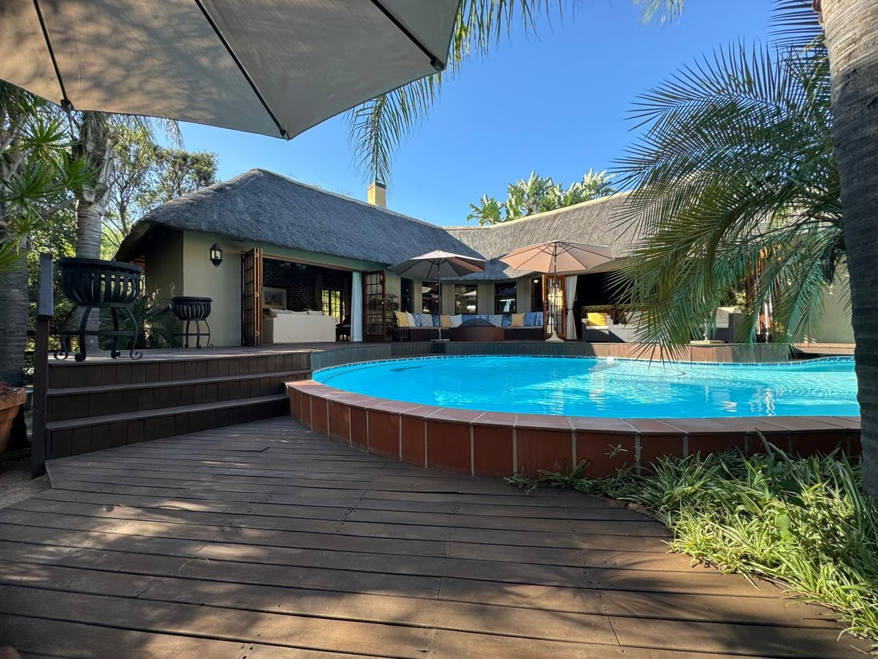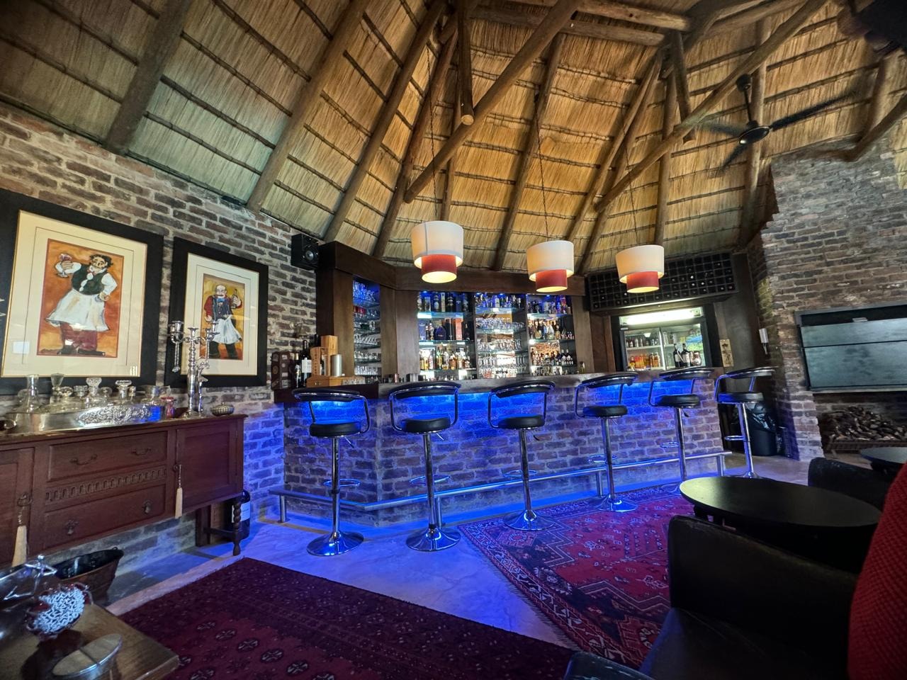 Entertainment is a focal point, with a thatched-roof lapa featuring a bar and dining area, overlooking a large swimming pool, perfect for hosting gatherings or relaxing under the African sun. A wine cellar adds to the allure, providing a sophisticated space to store and enjoy your collection.