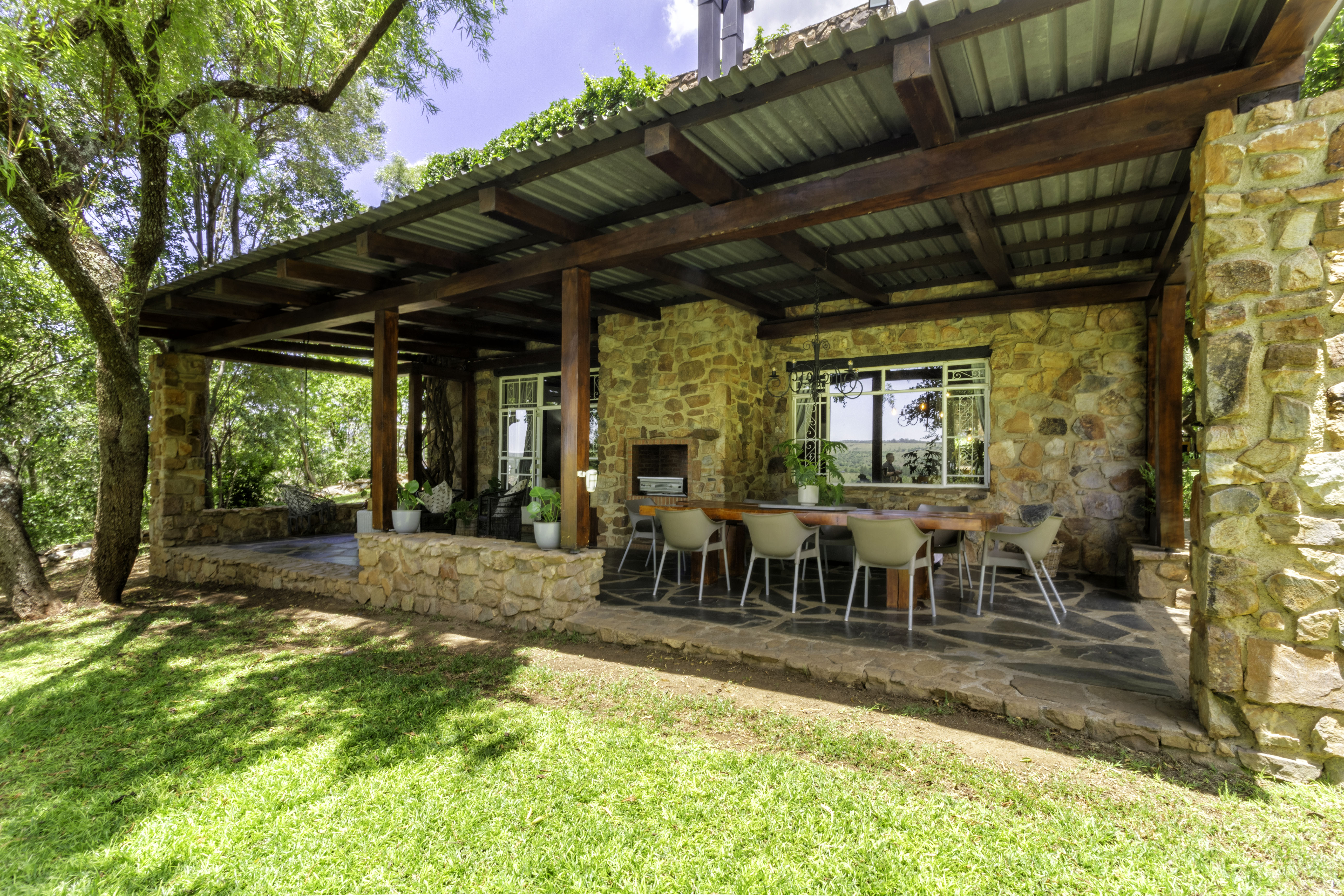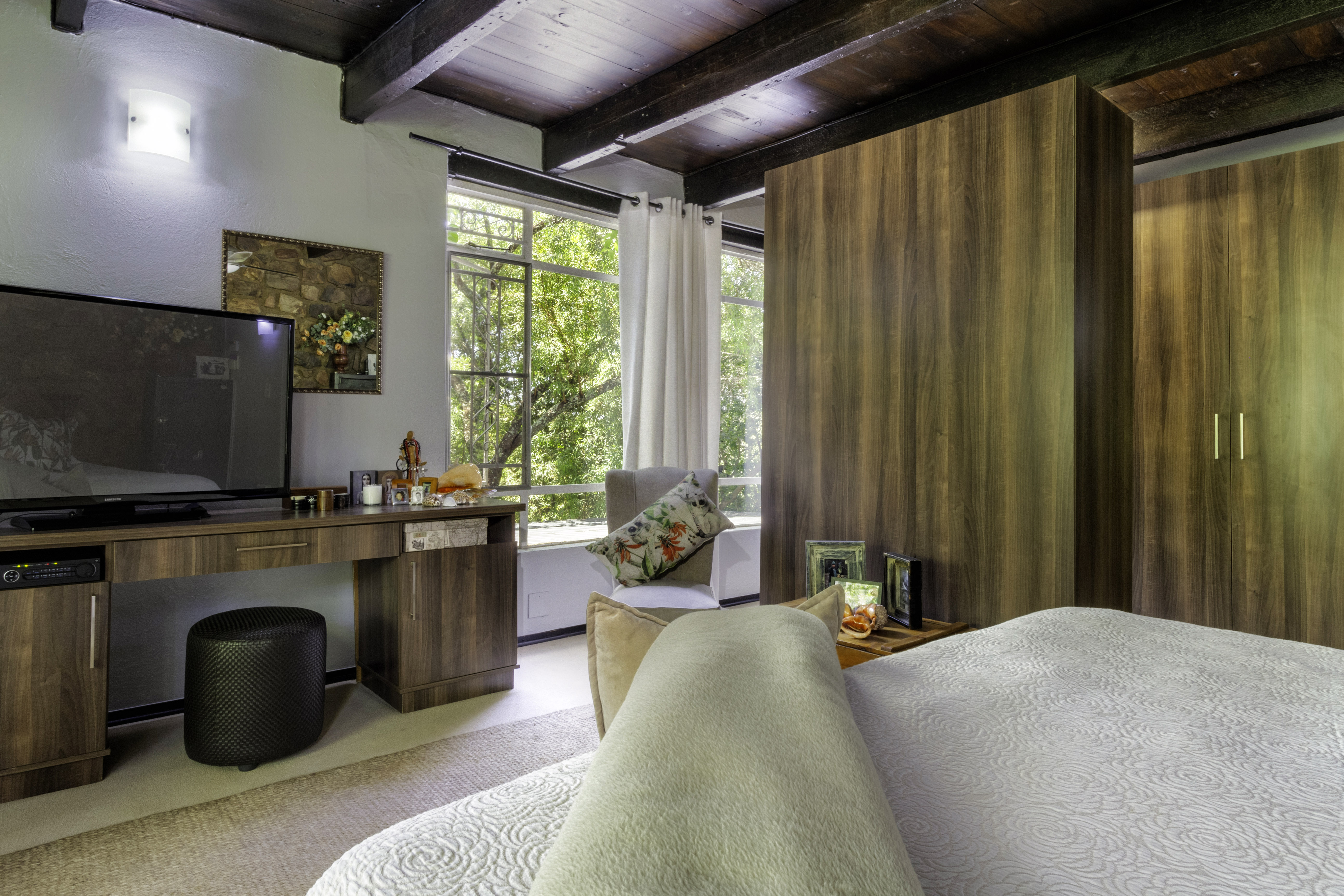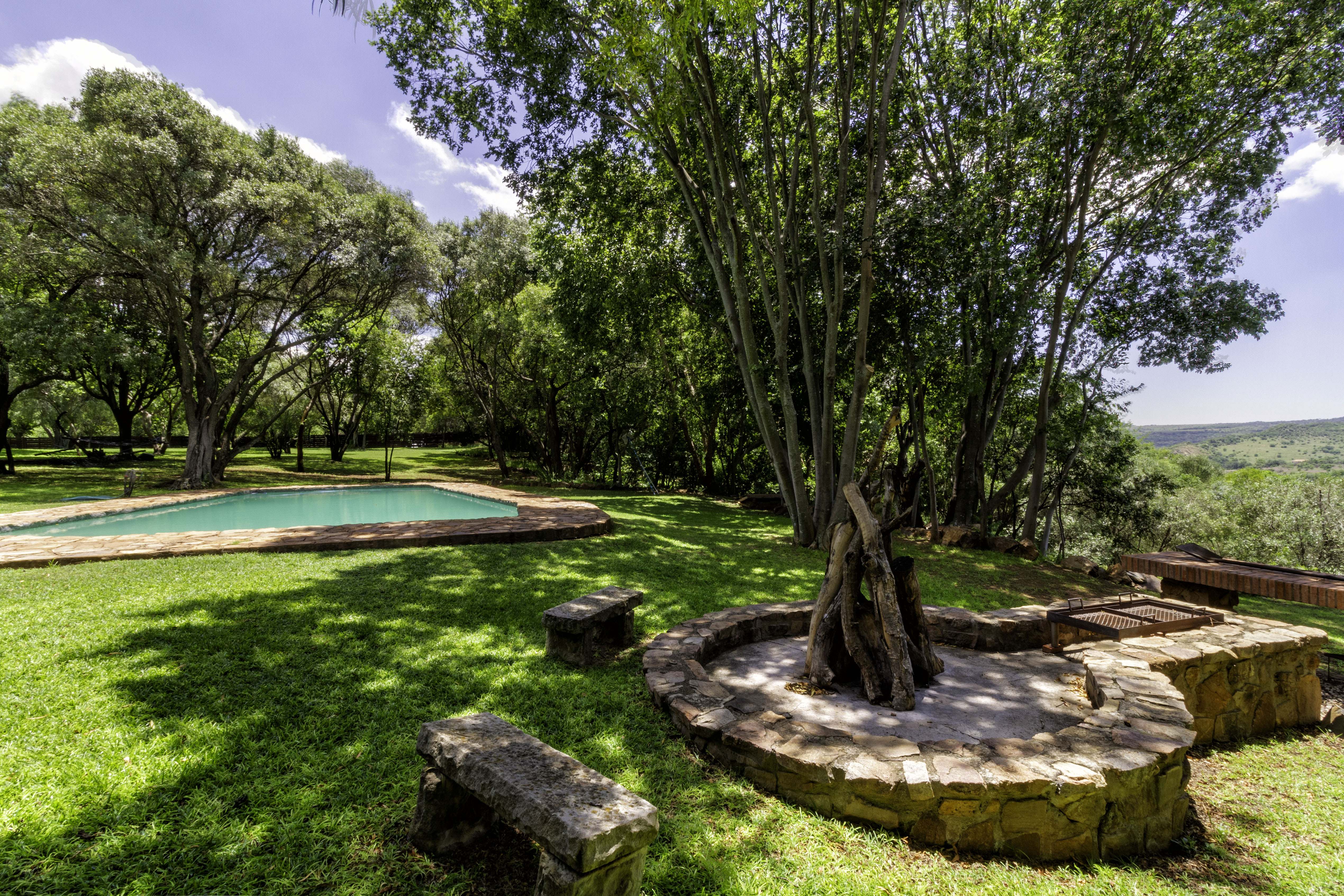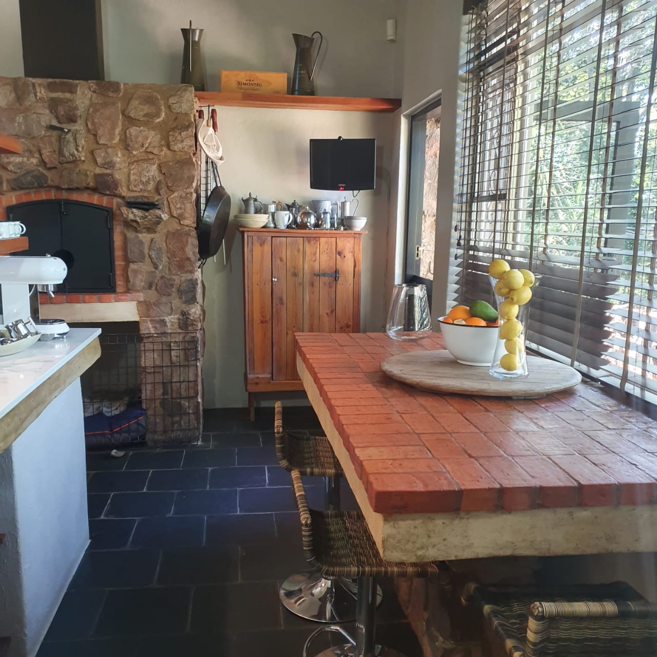 Open plan living area, made up of Dining and Lounge, with the addition of a wood burning fire place for those winter nights. Built in wooden T.V. unit and double doors that lead out onto an exquisite covered patio, large enough to satisfy any event, with the addition of a built in gas braai. The patio has a wonderful view of the tennis court, surrounding garden, pool, fire-pit and nearby watering hole, where game come in at intervals and quench their thirst.